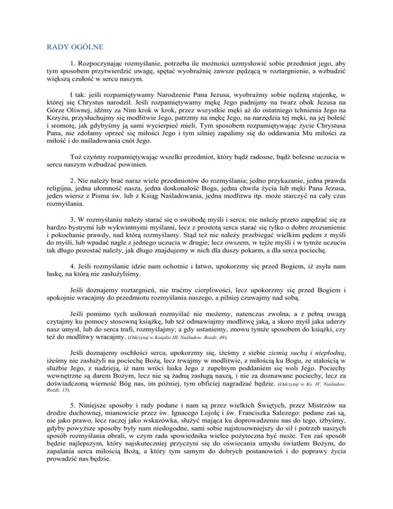 RADY OGÓLNE 1. Rozpoczynając rozmyślanie, potrzeba ile możności uzmysłowić sobie przedmiot jego, aby tym sposobem przytwierdzić uwagę, spętać wyobraźnię zawsze pędzącą w roztargnienie, a wzbudzić większą czułość w sercu naszym. I tak: jeśli rozpamiętywamy Narodzenie Pana Jezusa, wyobraźmy sobie nędzną stajenkę, w której się Chrystus narodził. Jeśli rozpamiętywamy mękę Jego padnijmy na twarz obok Jezusa na Górze Oliwnej, idźmy za Nim krok w krok, przez wszystkie męki aż do ostatniego tchnienia Jego na Krzyżu, przysłuchujmy się modlitwie Jego, patrzmy na mękę Jego, na narzędzia tej męki, na jej boleść i sromotę, jak gdybyśmy ją sami wycierpieć mieli. Tym sposobem rozpamiętywając życie Chrystusa Pana, nie zdołamy oprzeć się miłości Jego i tym silniej zapalimy się do oddawania Mu miłości za miłość i do naśladowania cnót Jego. Toż czyńmy rozpamiętywając wszelki przedmiot, który bądź radosne, bądź bolesne uczucia w sercu naszym wzbudzać powinien. 2. Nie należy brać naraz wiele przedmiotów do rozmyślania; jedno przykazanie, jedna prawda religijna, jedna ułomność nasza, jedna doskonałość Boga, jedna chwila życia lub męki Pana Jezusa, jeden wiersz z Pisma św. lub z Ksiąg Naśladowania, jedna modlitwa itp. może starczyć na cały czas rozmyślania. 3. W rozmyślaniu należy starać się o swobodę myśli i serca; nie należy przeto zapędzać się za bardzo bystrymi lub wykwintnymi myślami, lecz z prostotą serca starać się tylko o dobre zrozumienie i pokochanie prawdy, nad którą rozmyślamy. Stąd też nie należy przebiegać wielkim pędem z myśli do myśli, lub wpadać nagle z jednego uczucia w drugie; lecz owszem, w tejże myśli i w tymże uczuciu tak długo pozostać należy, jak długo znajdujemy w nich dla duszy pokarm, a dla serca pociechę. 4. Jeśli rozmyślanie idzie nam ochotnie i łatwo, upokorzmy się przed Bogiem, iż zsyła nam łaskę, na którą nie zasłużyliśmy. Jeśli doznajemy roztargnień, nie traćmy cierpliwości, lecz upokorzmy się przed Bogiem i spokojnie wracajmy do przedmiotu rozmyślania naszego, a pilniej czuwajmy nad sobą. Jeśli pomimo tych usiłowań rozmyślać nie możemy, natenczas zwolna, a z pełną uwagą czytajmy ku pomocy stosowną książkę, lub też odmawiajmy modlitwę jaką, a skoro myśl jaka uderzy nasz umysł, lub do serca trafi, rozmyślajmy; a gdy ustaniemy, znowu tymże sposobem do książki, czy też do modlitwy wracajmy. (Odczytaj w Księdze III, Naśladow. Rozdz. 48). Jeśli doznajemy oschłości serca, upokorzmy się, iżeśmy z siebie ziemią suchą i niepłodną, iżeśmy nie zasłużyli na pociechę Bożą, lecz trwajmy w modlitwie, z miłością ku Bogu, ze stałością w służbie Jego, z nadzieją, iż nam wróci łaska Jego z zupełnym poddaniem się woli Jego. Pociechy wewnętrzne są darem Bożym, lecz nie są żadną zasługą naszą, i nie za doznawane pociechy, lecz za doświadczoną wierność Bóg nas, im później, tym obficiej nagradzać będzie. (Odczytaj w Ks. IV, Naśladow. Rozdz. 15). 5. Niniejsze sposoby i rady podane i nam są przez wielkich Świętych, przez Mistrzów na drodze duchownej, mianowicie przez św. Ignacego Lojolę i św. Franciszka Salezego: podane zaś są, nie jako prawo, lecz raczej jako wskazówka, służyć mająca ku doprowadzeniu nas do tego, iżbyśmy, gdyby powyższe sposoby były nam niedogodne, sami sobie najstosowniejszy do sił i potrzeb naszych sposób rozmyślania obrali, w czym rada spowiednika wielce pożyteczna być może. Ten zaś sposób będzie najlepszym, który najskuteczniej przyczyni się do oświecania umysłu światłem Bożym, do zapalania serca miłością Bożą, a który tym samym do dobrych postanowień i do poprawy życia prowadzić nas będzie. Uwaga pierwsza Rozmyślanie dziwnie służy do wynalezienia najłatwiejszych sposobów dojścia do celu, jaki kto sobie zakłada ku uszczęśliwieniu swojemu. Cały świat rozmyśla; dumny nad dogodzeniem dumie swojej, skąpiec nad dogodzeniem chciwości swojej; rozpustnik nad dogodzeniem rozpuście swojej. I każdy z nich całą myśl zwraca ku temu, co sobie obrał za cel życia, nie szczędząc ni czasu, ni trudu, ni zdrowia, a częstokroć i życia nawet, aby dopiął celu swojego. A myż chrześcijanie, dla których wszystkie szczęśliwości i wielkości tego świata niczym są w porównaniu z celem naszym; myż chrześcijanie, którzy mamy piekło do uniknienia, Niebo do pozyskania, całą wieczność do uszczęśliwienia, samego Boga do posiadania; myż jedni będziemy gnuśnieć w obojętności, w nieczułości na miłość Boga i na zbawienie nasze. O! nie daj tego Boże. Czuwajcie a módlcie się (2); módlmy się nie tylko usty, ale sercem i myślą. Czyńmy rozmyślanie; rozmyślanie da nam zdrowie duszy i wesele serca, bo doprowadzi nas niechybnie do pokuty i do poprawy życia naszego, byleśmy tylko nie szczędzili dobrej woli naszej. A pierwszym dowodem dobrej woli to będzie: jeżeli codzienny a ścisły rachunek sumienia przyjdzie w pomoc rozmyślaniu naszemu. – Rozmyślanie i rachunek sumienia są jakoby dwa skrzydła, za pomocą których dusza nasza ku Bogu wzlecieć i w Nim zamieszkać może. Uwaga druga Rozmyślanie, o którym tu mowa, jest podstawą wszystkich ćwiczeń duchowych, jest najwdzięczniejszą Bogu modlitwą, najpewniejszym sposobem odzyskania łaski Bożej, zachowania jej statecznie i wzrastania w nią coraz bardziej; jednym słowem rozmyślanie jest najdzielniejszym środkiem życia życiem wiary. – Żaden Święty nie doszedł inaczej do świętości, jak przez to rozmyślanie. Bo to rozmyślanie jest rozmową duszy z Bogiem, a nie masz mistrza świętości, jeno Bóg. – Jeśli przez rozmyślanie nie dopraszamy się światła Bożego, umysł nasz zaćmi nas ciemnością swoją i zbłąkamy się z drogi żywota i pójdziem ku zatraceniu i tych powiedziem, których Bóg powierzył pieczy n