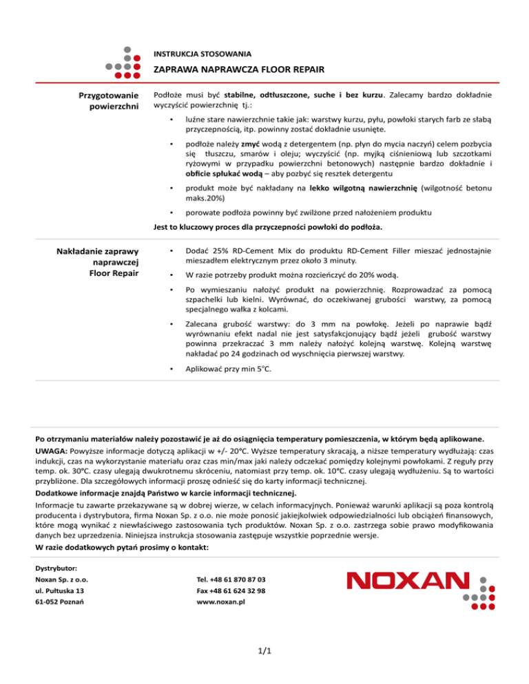 INSTRUKCJA STOSOWANIA ZAPRAWA NAPRAWCZA FLOOR REPAIR Przygotowanie powierzchni Podłoże musi być stabilne, odtłuszczone, suche i bez kurzu. Zalecamy bardzo dokładnie wyczyścić powierzchnię tj.: • luźne stare nawierzchnie takie jak: warstwy kurzu, pyłu, powłoki starych farb ze słabą przyczepnością, itp. powinny zostać dokładnie usunięte. • podłoże należy zmyć wodą z detergentem (np. płyn do mycia naczyń) celem pozbycia się tłuszczu, smarów i oleju; wyczyścić (np. myjką ciśnieniową lub szczotkami ryżowymi w przypadku powierzchni betonowych) następnie bardzo dokładnie i obficie spłukać wodą – aby pozbyć się resztek detergentu • produkt może być nakładany na lekko wilgotną nawierzchnię (wilgotność betonu maks.20%) • porowate podłoża powinny być zwilżone przed nałożeniem produktu Jest to kluczowy proces dla przyczepności powłoki do podłoża. Nakładanie zaprawy naprawczej Floor Repair • Dodać 25% RD-Cement Mix do produktu RD-Cement Filler mieszać jednostajnie mieszadłem elektrycznym przez około 3 minuty. • W razie potrzeby produkt można rozcieńczyć do 20% wodą. • Po wymieszaniu nałożyć produkt na powierzchnię. Rozprowadzać za pomocą szpachelki lub kielni. Wyrównać, do oczekiwanej grubości warstwy, za pomocą specjalnego wałka z kolcami. • Zalecana grubość warstwy: do 3 mm na powłokę. Jeżeli po naprawie bądź wyrównaniu efekt nadal nie jest satysfakcjonujący bądź jeżeli grubość warstwy powinna przekraczać 3 mm należy nałożyć kolejną warstwę. Kolejną warstwę nakładać po 24 godzinach od wyschnięcia pierwszej warstwy. • Aplikować przy min 5oC. Po otrzymaniu materiałów należy pozostawić je aż do osiągnięcia temperatury pomieszczenia, w którym będą aplikowane. UWAGA: Powyższe informacje dotyczą aplikacji w +/- 20 oC. Wyższe temperatury skracają, a niższe temperatury wydłużają: czas indukcji, czas na wykorzystanie materiału oraz czas min/max jaki należy odczekać pomiędzy kolejnymi powłokami. Z reguły przy temp. ok. 30oC. czasy ulegają dwukrotnemu skróceniu, natomiast przy temp. ok. 10 oC. czasy ulegają wydłużeniu. Są to wartości przybliżone. Dla szczegółowych informacji proszę odnieść się do karty informacji technicznej. Dodatkowe informacje znajdą Państwo w karcie informacji technicznej. Informacje tu zawarte przekazywane są w dobrej wierze, w celach informacyjnych. Ponieważ warunki aplikacji są poza kontrolą producenta i dystrybutora, firma Noxan Sp. z o.o. nie może ponosić jakiejkolwiek odpowiedzialności lub obciążeń finansowych, które mogą wynikać z niewłaściwego zastosowania tych produktów. Noxan Sp. z o.o. zastrzega sobie prawo modyfikowania danych bez uprzedzenia. Niniejsza instrukcja stosowania zastępuje wszystkie poprzednie wersje. W razie dodatkowych pytań prosimy o kontakt: Dystrybutor: Noxan Sp. z o.o. Tel. +48 61 870 87 03 ul. Pułtuska 13 Fax +48 61 624 32 98 61-052 Poznań www.noxan.pl 1/1
