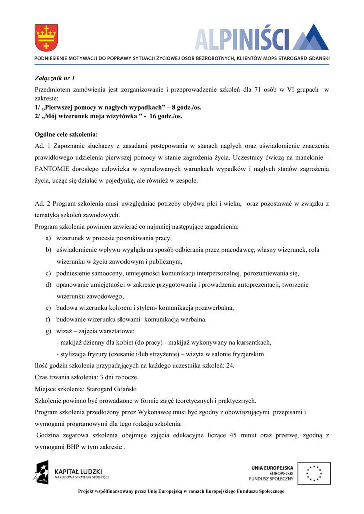 Załącznik nr 1 Przedmiotem zamówienia jest zorganizowanie i przeprowadzenie szkoleń dla 71 osób w VI grupach w zakresie: 1/ „Pierwszej pomocy w nagłych wypadkach” – 8 godz./os. 2/ „Mój wizerunek moja wizytówka ” - 16 godz./os. Ogólne cele szkolenia: Ad. 1 Zapoznanie słuchaczy z zasadami postępowania w stanach nagłych oraz uświadomienie znaczenia prawidłowego udzielenia pierwszej pomocy w stanie zagrożenia życia. Uczestnicy ćwiczą na manekinie – FANTOMIE dorosłego człowieka w symulowanych warunkach wypadków i nagłych stanów zagrożenia życia, ucząc się działać w pojedynkę, ale również w zespole. Ad. 2 Program szkolenia musi uwzględniać potrzeby obydwu płci i wieku, oraz pozostawać w związku z tematyką szkoleń zawodowych. Program szkolenia powinien zawierać co najmniej następujące zagadnienia: a) wizerunek w procesie poszukiwania pracy, b) uświadomienie wpływu wyglądu na sposób odbierania przez pracodawcę, własny wizerunek, rola wizerunku w życiu zawodowym i publicznym, c) podniesienie samooceny, umiejętności komunikacji interpersonalnej, porozumiewania się, d) opanowanie umiejętności w zakresie przygotowania i prowadzenia autoprezentacji, tworzenie wizerunku zawodowego, e) budowa wizerunku kolorem i stylem- komunikacja pozawerbalna, f) budowanie wizerunku słowami- komunikacja werbalna. g) wizaż – zajęcia warsztatowe: - makijaż dzienny dla kobiet (do pracy) - makijaż wykonywany na kursantkach, - stylizacja fryzury (czesanie i/lub strzyżenie) – wizyta w salonie fryzjerskim Ilość godzin szkolenia przypadających na każdego uczestnika szkoleń: 24. Czas trwania szkolenia: 3 dni robocze. Miejsce szkolenia: Starogard Gdański Szkolenie powinno być prowadzone w formie zajęć teoretycznych i praktycznych. Program szkolenia przedłożony przez Wykonawcę musi być zgodny z obowiązującymi przepisami i wymogami programowymi dla tego rodzaju szkolenia. Godzina zegarowa szkolenia obejmuje zajęcia edukacyjne liczące 45 minut oraz przerwę, zgodną z wymogami BHP w tym zakresie . Projekt współfinansowany przez Unię Europejską w ramach Europejskiego Funduszu Społecznego . Szkolenie musi odbywać się w kolejno następujące po sobie dni robocze, od poniedziałku do piątku, w przedziale czasowym między godz. 8.00 a 16.00. Czas trwania szkolenia nie może przekroczyć 8 godzin dziennie. Wykonawca zobowiązany jest do przeprowadzenia egzaminu końcowego wg aktualnie obowiązujących przepisów prawa i wydania uczestnikom szkolenia, kończącym je z wynikiem pozytywnym, stosownego zaświadczenia zgodnego z rozporządzeniem Ministra Edukacji i Nauki z dnia 3 lutego 2006 r. w sprawie uzyskania i uzupełnienie przez osoby dorosłe wiedzy ogólnej, umiejętności i kwalifikacji zawodowych w formach pozaszkolnych (Dz. U. z 2006 r. nr 31, poz. 216), oraz do sporządzenia protokołu z przeprowadzonego egzaminu końcowego. Wykonawca zobowiązany jest: a. wyposażyć każdego uczestnika szkolenia co najmniej w następujące materiały potrzebne do realizacji szkolenia zgodne z tematyką szkolenia: kosmetyki pielęgnacyjne na zajęcia (kremy, mleczka, toniki, waciki), b. przekazać na własność uczestnika: - notatnik w kratkę formatu A-5, - długopis, - podręcznik nowy, tematycznie związany z przedmiotem zamówienia, - apteczka pierwszej pomocy (min. 50 zł.) - zestaw kosmetyków dla Pań: tusz do rzęs, podkład, puder transparentny, zestaw do makijażu oczu (min. paleta cieni 3 kolory), kredka do oczu, pomadka/błyszczyk, lusterko, pilniczek do paznokci, ( min. 100 zł.) - zestaw kosmetyków dla Panów; woda toaletowa, maszynka do golenia z zapasowymi ostrzami, pianka/żel do golenia, szampon dla mężczyzn, suszarka do włosów (min.100zł) c. zapewnić uczestnikom szkolenia wizytę w salonie fryzjerskim i skorzystanie z usług fryzjerskich - 71 osoby w tym 57 kobiet i 14 mężczyzn (stylizacja fryzur; czesanie i/lub strzyżenie), wykonanie profesjonalnego makijażu dla uczestniczek. d. zapewnić poczęstunek w każdym dniu szkolenia w postaci: ciepłych i zimnych napojów (kawa, herbata, woda mineralna, napoje), ciastek, cukru i śmietanki oraz obiadów. e. zapewnić uczestnikom szkolenia swobodny dostęp do pomieszczeń sanitarnych w budynku, w którym odbywa się szkolenie (tj. WC, umywalka wraz z dostępem do ciepłej wody) f. zapewnić uczestnikom szkolenia dostęp do niezbędnych środków czystości (tj. papier toaletowy, mydło do rąk, ręczniki papierowe lub suszarka do rąk) Projekt współfinansowany przez Unię Europejską w ramach Europejskiego Funduszu Społecznego . Wykonawca zobowiązany jest do: - udokumentowanie realizacji szkolenia w postaci zdjęć zamieszczonych na płycie CD i dołączenia jej do dokumentacji szkoleniowej, - przeprowadzenia badan ankietowych wśród uczestników szkolenia po zakończeniu szkolenia w celu oceny jakości zrealizowanej usługi, a wyniki wraz z analizą uzyskanych odpowiedzi przedstawić w protokole. Wykonawca zobowiązany jest przestrzegać zasad promocji Projektu zgodnie z wytycznymi zawartymi na stronie www.efs.gov.pl (PROMOCJA W RAMACH PROGRAMU OPERACYJNEGO KAPITAŁ LUDZKI 2007-2013) Projekt współfinansowany przez Unię Europejską w ramach Europejskiego Funduszu Społecznego .