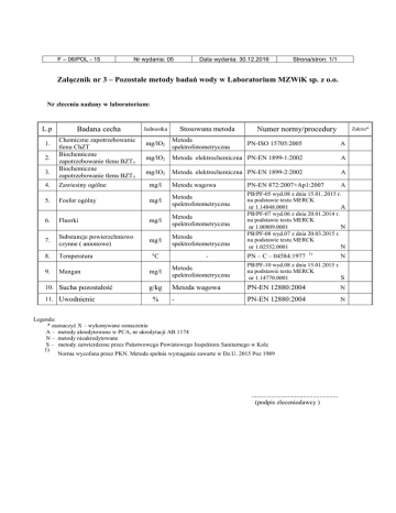 F – 06/POL - 15 Nr wydania: 05 Data wydania: 30.12.2016 Strona/stron: 1/1 Załącznik nr 3 – Pozostałe metody badań wody w Laboratorium MZWiK sp. z o.o. Nr zlecenia nadany w laboratorium: L.p 1. 2. 3. Badana cecha Chemiczne zapotrzebowanie tlenu ChZT Biochemiczne zapotrzebowanie tlenu BZT5 Biochemiczne zapotrzebowanie tlenu BZT5 Stosowana metoda Jednostka Metoda spektrofotometryczna PN-ISO 15705:2005 A mg/lO2 Metoda elektrochemiczna PN-EN 1899-1:2002 A mg/lO2 Metoda elektrochemiczna PN-EN 1899-2:2002 A A Zawiesiny ogólne mg/l Metoda wagowa 5. Fosfor ogólny mg/l Metoda spektrofotometryczna 6. Fluorki mg/l Metoda spektrofotometryczna 7. Substancje powierzchniowo czynne ( anionowe) mg/l Metoda spektrofotometryczna 8. Temperatura 9. Mangan 11. Uwodnienie Zakres* mg/lO2 4. 10. Sucha pozostałość Numer normy/procedury °C - PN-EN 872:2007+Ap1:2007 PB/PF-05 wyd.08 z dnia 15.01..2015 r. na podstawie testu MERCK nr 1.14848.0001 A PB/PF-07 wyd.06 z dnia 20.01.2014 r. na podstawie testu MERCK nr 1.00809.0001 N PB/PF-08 wyd.07 z dnia 20.03.2015 r. na podstawie testu MERCK nr 1.02552.0001 N PN – C – 04584:1977 1) N mg/l Metoda spektrofotometryczna PB/PF-10 wyd.08 z dnia 15.01.2015 r. na podstawie testu MERCK nr 1.14770.0001 S g/kg Metoda wagowa PN-EN 12880:2004 N - PN-EN 12880:2004 N % Legenda: * zaznaczyć X – wykonywane oznaczenie A – metody akredytowane w PCA, nr akredytacji AB 1174 N – metody nieakredytowane S – metody zatwierdzone przez Państwowego Powiatowego Inspektora Sanitarnego w Kole 1) Norma wycofana przez PKN. Metoda spełnia wymagania zawarte w Dz.U. 2015 Poz 1989 .................................................... (podpis zleceniodawcy )