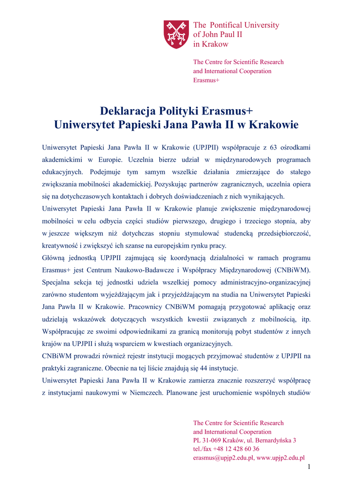 Deklaracja Polityki Erasmus+ Uniwersytet Papieski Jana Pawła II w