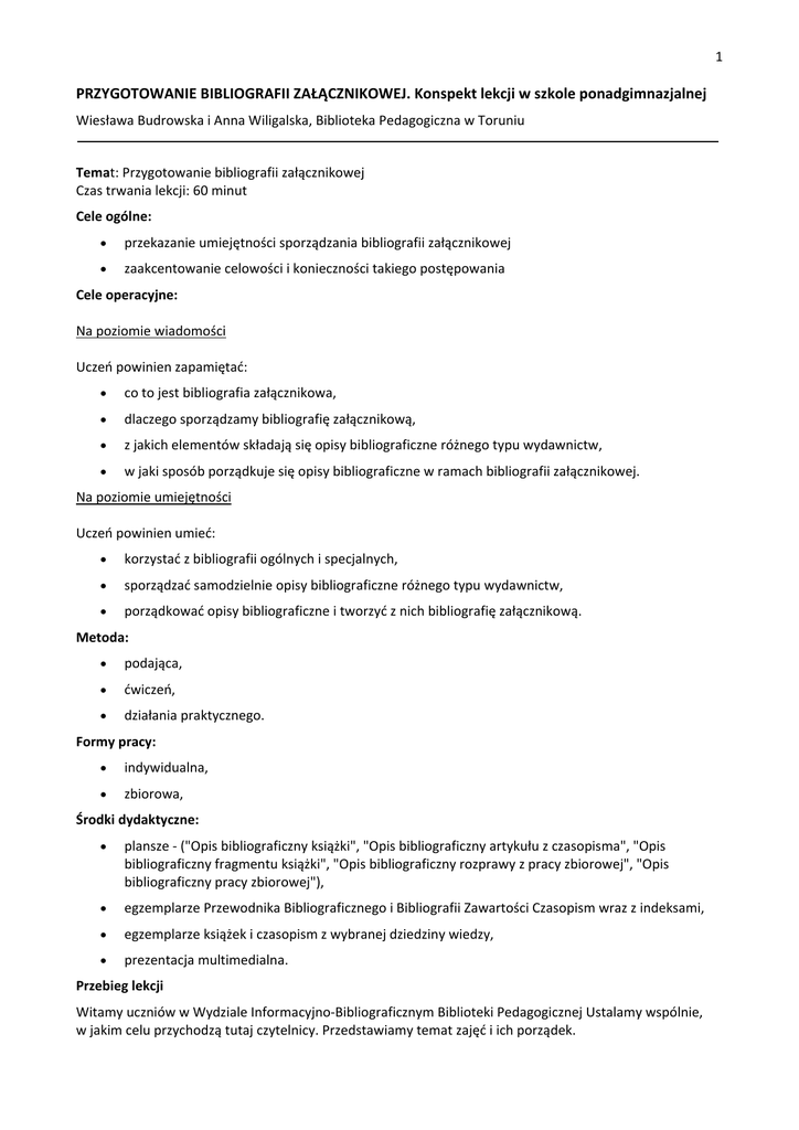 PRZYGOTOWANIE BIBLIOGRAFII ZAŁĄCZNIKOWEJ. Konspekt lekcji w szkole ponadgimnazjalnej