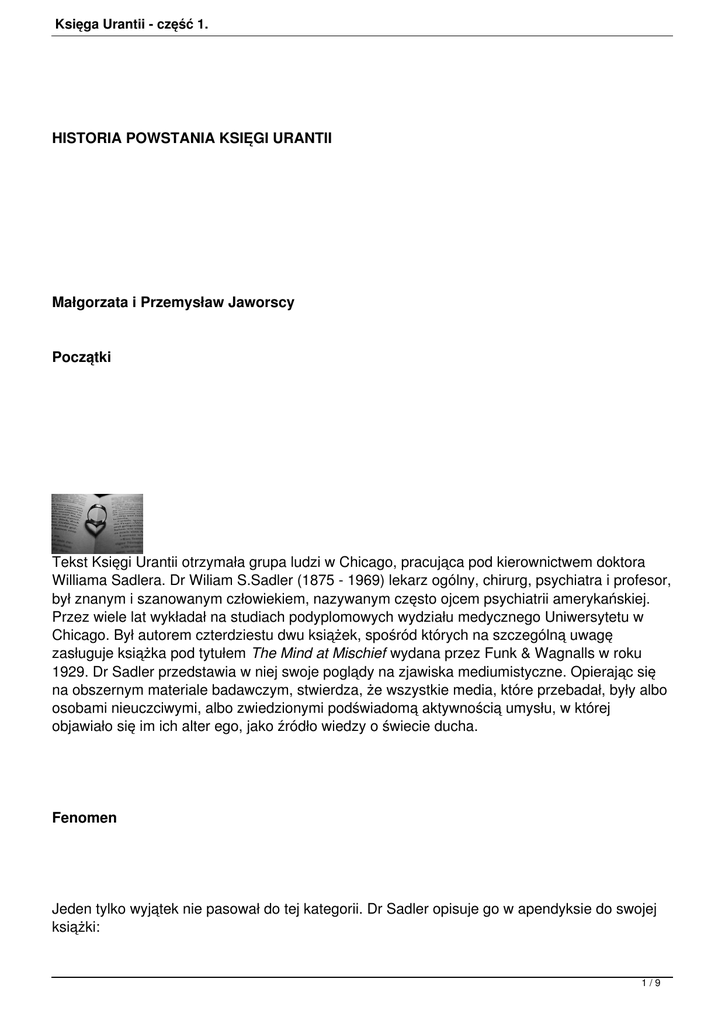 Księga Urantii - część 1. HISTORIA POWSTANIA KSIĘGI URANTII Małgorzata i Przemysław Jaworscy Początki Tekst Księgi Urantii otrzymała grupa ludzi w Chicago, pracująca pod kierownictwem doktora Williama Sadlera. Dr Wiliam S.Sadler (1875 - 1969) lekarz ogólny, chirurg, psychiatra i profesor, był znanym i szanowanym człowiekiem, nazywanym często ojcem psychiatrii amerykańskiej. Przez wiele lat wykładał na studiach podyplomowych wydziału medycznego Uniwersytetu w Chicago. Był autorem czterdziestu dwu książek, spośród których na szczególną uwagę zasługuje książka pod tytułem The Mind at Mischief wydana przez Funk & Wagnalls w roku 1929. Dr Sadler przedstawia w niej swoje poglądy na zjawiska mediumistyczne. Opierając się na obszernym materiale badawczym, stwierdza, że wszystkie media, które przebadał, były albo osobami nieuczciwymi, albo zwiedzionymi podświadomą aktywnością umysłu, w której objawiało się im ich alter ego, jako źródło wiedzy o świecie ducha. Fenomen Jeden tylko wyjątek nie pasował do tej kategorii. Dr Sadler opisuje go w apendyksie do swojej książki: 1/9 Księga Urantii - część 1. Wyjątek ten jest raczej dziwnym przypadkiem fenomenu metapsychicznego, który uważam za niemożliwy do zaklasyfikowania i który bardzo chciałbym opisać szerzej. Nie mogę tego tutaj zrobić, ze względu na obietnicę, która obliguje mnie do traktowania go jako nietykalny. Innymi słowy, obiecałem nie publikować tego przypadku za życia owej osoby. Skontaktowano mnie z tym przypadkiem latem, roku 1911 i miałem go pod obserwacją od tamtego czasu, będąc obecny, częściej lub rzadziej, na około 250 sesjach nocnych, z których wiele odbyło się w towarzystwie stenografa, który poczynił obszerne notatki. Dokładne badania tego przypadku przekonały mnie, że nie jest to jeden ze zwykłych transów. Podczas gdy sen wygląda na całkiem naturalny, jest bardzo głęboki i jak dotąd nigdy nie byliśmy zdolni obudzić osoby, będącej w tym stanie. Ciało nigdy nie jest sztywne a akcja serca nie zmienia się, chociaż oddech czasami ma wyraźny związek z fenomenem. Człowiek ten jest zupełnie nieświadomy, całkiem niepomny tego, co się dzieje i gdyby nie ciągłe rozmowy na ten temat, nigdy nie dowiedziałby się, że jest używany jako coś w rodzaju biura informacyjnego dla przychodzących i odchodzących, domniemanych osobowości pozaplanetarnych. Faktycznie jest on bardziej czy mniej obojętny na całą procedurę i wykazuje zadziwiający brak zainteresowania tymi sprawami, które się jemu od czasu do czasu zdarzają. Te nocne wizyty w żadnej mierze nie przypominają seansów związanych ze spirytualizmem. Nigdy, w przeciągu osiemnastu lat, nie było żadnych komunikatów od żadnego źródła, które określałoby siebie jako duch czy zmarła istota ludzka. Wiadomości, które zostały spisane, czy które mieliśmy możliwość usłyszeć, były komunikowane przez istoty określające się jako przybyłe z innych planet, aby odwiedzić ten świat, zatrzymać się tutaj jako badacze w celach obserwacji i studiów, kiedy są w drodze z jednego wszechświata do innego, z jednej planety do drugiej. Później doszły przekazy od domniemanej istoty duchowej, która rzekomo była przydzielona do tej planety, dla wykonania różnych zadań. Badania Osiemnaście lat badań i dokładnych dociekań nie wykazało istnienia metapsychicznego źródła tych informacji. Znajduję się obecnie w tym samym miejscu, gdzie zacząłem. Psychoanaliza, hipnoza, intensywne skojarzenia, nie ujawniły, że te opowiadane informacje mogą mieć źródło we własnym umyśle omawianej osoby. Większość materiału dostarczonego przez tę osobę pozostaje w dużej sprzeczności z jej metodami myślenia, czy zasadami, jakie były używane podczas jej edukacji i z całą jej filozofią życia. Nasze badania są kontynuowane i mogę oznajmić, iż mam nadzieję, że w jakimś niezbyt odległym czasie, otrzymam zezwolenie na pełniejszy opis zjawisk związanych z tym interesującym przypadkiem. 2/9 Księga Urantii - część 1. Powstanie Księgi Siódmego maja, roku 1958, grupa duszpasterzy spotkała się z doktorem Sadlerem. Celem spotkania było omówienie spraw związanych z powstaniem Księgi Urantii. Kiedy przyszli do niego, doktor miał przygotowany dokument, z listą wszelkich możliwych do wyobrażenia form podświadomości czy stanów metapsychicznych. Na dole była notatka mówiąca: "Metoda otrzymania Księgi Urantii po angielsku nie jest w żaden sposób porównywalna, ani też nie zazębia się z jakimkolwiek z powyższych zjawisk, z marginesu świadomości". Doktor Sadler chętnie odpowiadał na wszelkie zadawane mu pytania, za wyjątkiem imienia osoby, której nadświadomy umysł został w pewien sposób użyty do zmaterializowania się Przekazów Urantii jak również szczegółów związanych z tą materializacją. Zapytany, dlaczego takie ograniczenia zostały na niego nałożone, odpowiedział: 1. Główną przyczyną nie ujawniania tożsamości osoby kontaktu jest to, że istoty objawiające (autorzy Księgi Urantii) nie chcą, aby jakakolwiek istota ludzka, jakiekolwiek ludzkie imię, mogło kiedykolwiek być związane z Księgą Urantii. Chcą aby to objawienie opierało się na swych własnych oświadczeniach i naukach. Postanowili, że przyszłe pokolenia powinny posiadać tę księgę zupełnie wolną od jakichkolwiek ludzkich powiązań -- Św. Piotra, Św. Pawła, Lutra, Kalwina czy Wesleya. 2. Jest wiele spraw, związanych z pojawieniem się przekazów Urantii, których żadna ludzka istota w pełni nie rozumie. Nikt doprawdy nie wie, jak ten fenomen został przeprowadzony. Jest wiele brakujących ogniw w całej historii tego objawienia, spisanego po angielsku. Jeśli ktokolwiek może powiedzieć wszystko, co naprawdę wie o technice i metodach używanych przez lata, podczas otrzymywania tego objawienia, jego opowiadanie nikogo nie