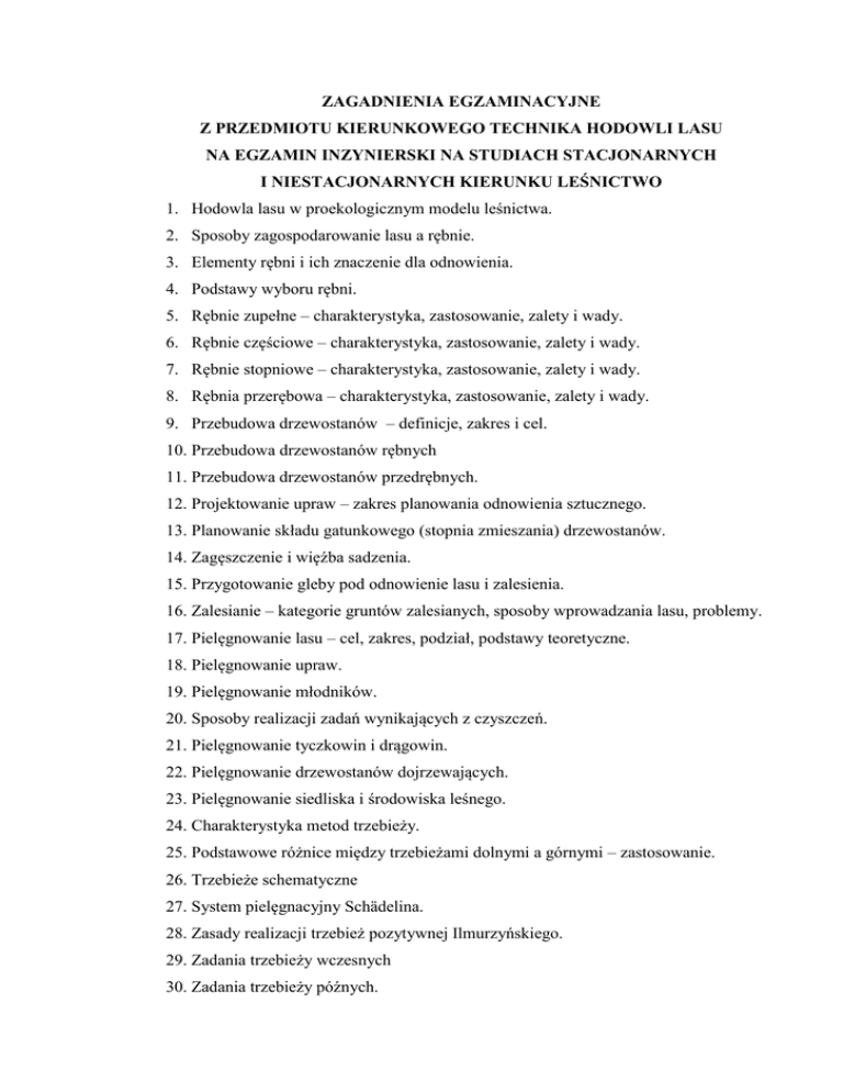 ZAGADNIENIA EGZAMINACYJNE Z PRZEDMIOTU KIERUNKOWEGO TECHNIKA HODOWLI LASU NA EGZAMIN INZYNIERSKI NA STUDIACH STACJONARNYCH I NIESTACJONARNYCH KIERUNKU LEŚNICTWO 1. Hodowla lasu w proekologicznym modelu leśnictwa. 2. Sposoby zagospodarowanie lasu a rębnie. 3. Elementy rębni i ich znaczenie dla odnowienia. 4. Podstawy wyboru rębni. 5. Rębnie zupełne – charakterystyka, zastosowanie, zalety i wady. 6. Rębnie częściowe – charakterystyka, zastosowanie, zalety i wady. 7. Rębnie stopniowe – charakterystyka, zastosowanie, zalety i wady. 8. Rębnia przerębowa – charakterystyka, zastosowanie, zalety i wady. 9. Przebudowa drzewostanów – definicje, zakres i cel. 10. Przebudowa drzewostanów rębnych 11. Przebudowa drzewostanów przedrębnych. 12. Projektowanie upraw – zakres planowania odnowienia sztucznego. 13. Planowanie składu gatunkowego (stopnia zmieszania) drzewostanów. 14. Zagęszczenie i więźba sadzenia. 15. Przygotowanie gleby pod odnowienie lasu i zalesienia. 16. Zalesianie – kategorie gruntów zalesianych, sposoby wprowadzania lasu, problemy. 17. Pielęgnowanie lasu – cel, zakres, podział, podstawy teoretyczne. 18. Pielęgnowanie upraw. 19. Pielęgnowanie młodników. 20. Sposoby realizacji zadań wynikających z czyszczeń. 21. Pielęgnowanie tyczkowin i drągowin. 22. Pielęgnowanie drzewostanów dojrzewających. 23. Pielęgnowanie siedliska i środowiska leśnego. 24. Charakterystyka metod trzebieży. 25. Podstawowe różnice między trzebieżami dolnymi a górnymi – zastosowanie. 26. Trzebieże schematyczne 27. System pielęgnacyjny Schädelina. 28. Zasady realizacji trzebież pozytywnej Ilmurzyńskiego. 29. Zadania trzebieży wczesnych 30. Zadania trzebieży późnych.
