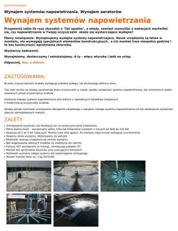 NAPOWIETRZANIE Wynajem systemów napowietrzania. Wynajem aeratorów Wynajem systemów napowietrzania Przypomnij sobie ile razy słyszałeś o "fali upałów", a wtedy, zamiast rozmyślać o wakacjach martwiłeś się, czy napowietrzanie w Twojej oczyszczalni okaże się wystarczająco wydajne? Mamy rozwiązanie. Wynajmujemy wydajne systemy napowietrzajace. Nasze urządzenia są łatwe w montażu, nie wymagają specjalnych elementów konstrukcyjnych , a ich montaż trwa niespełna godzinę i to bez konieczności opróźniania zbiornika. Wystarczy zadzwonić. Wynajmiemy, dostarczymy i zainstalujemy. A ty - włącz wtyczkę i jedź na urlop. Odpocznij. Raz, a dobrze. ZASTOSOWANIA: W wielu oczyszczalniach ścieków występuje problem stałego, lub okresowego deficytu tlenu. Taki stan wynika ze zmiany parametrów pracy oczyszczalni w czasie, spadku wydajności systemu napowietrzania, lub zmienionych zadań stawianych przed oczyszczalnią ścieków. Instalacja nowego systemu napowietrzania jest jednym z największych wydatków związanych z modernizacją oczyszczalni ścieków. Istnieje jednak możliwość zmniejszenia obciążenia związanego z zakupem nowego systemu napowietrzania lub też zwiększenia wydajności obecnie zainstalowanych maszyn. ZALETY ● ● ● ● ● ● ● ● ● ● Zmniejszenie wysokości lub likwidacja kar za zanieczyszczanie środowiska. Pełna elastyczność – wynajmujmy jedno, kilka lub kilkanaście urządzeń o mocach od 4kW do 132 kW. Dostawa od 2 do 5 dni roboczych. Montaż trwa kilka godzin. Po montażu natychmiast następuje uruchomienie. Dowolny okres wynajmu, dostosowany do potrzeb. Możliwość wykupu urządzenia po okresie wynajmu. Bez angażowania własnych środków na inwestycje ani zaliczki. Faktury VAT wystawiane co miesiąc, zmniejszają podatek CIT. Montaż bez opróżniania zbiornika, przy pracujących komorach. Możliwość wymiany całego systemu lub wspomagania istniejącego. Wysoki transfer tlenu ok. 2 kg O2/1kWh. H2O Rozwiązania Proekologiczne Sp. z o.o. • ul. Hajoty 61 • 01-821 Warszawa • tel: 22 897 00 30, 22 897 00 31 • fax: 22 897 00 32 • email: [email protected]