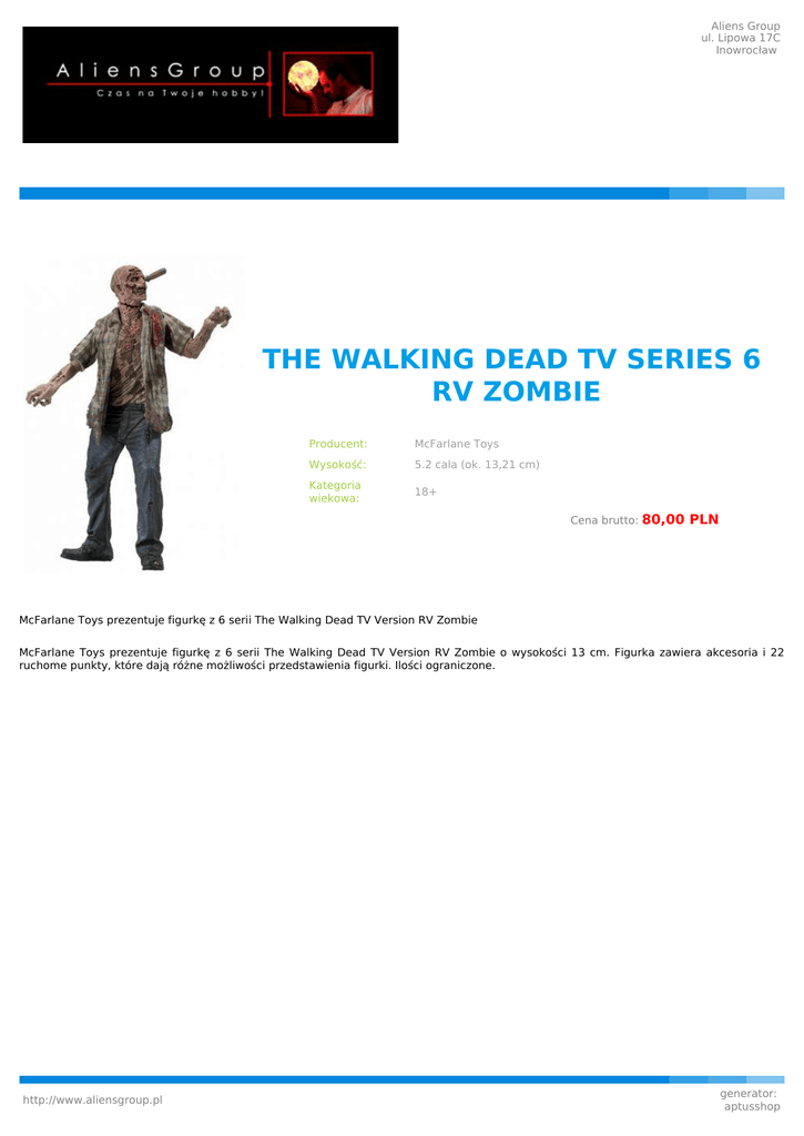 Aliens Group ul. Lipowa 17C Inowrocław THE WALKING DEAD TV SERIES 6 RV ZOMBIE Producent: McFarlane Toys Wysokość: 5.2 cala (ok. 13,21 cm) Kategoria wiekowa: 18+ Cena brutto: 80,00 PLN McFarlane Toys prezentuje figurkę z 6 serii The Walking Dead TV Version RV Zombie McFarlane Toys prezentuje figurkę z 6 serii The Walking Dead TV Version RV Zombie o wysokości 13 cm. Figurka zawiera akcesoria i 22 ruchome punkty, które dają różne możliwości przedstawienia figurki. Ilości ograniczone. http://www.aliensgroup.pl generator: aptusshop