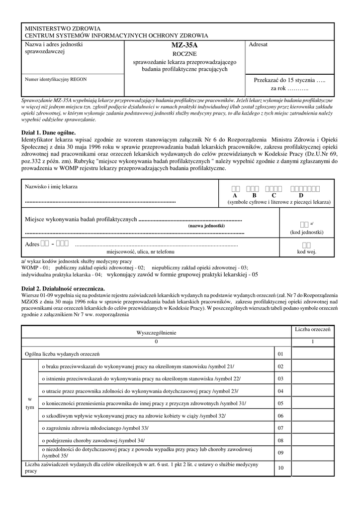 MINISTERSTWO ZDROWIA CENTRUM SYSTEMÓW INFORMACYJNYCH OCHRONY ZDROWIA Nazwa i adres jednostki MZ-35A sprawozdawczej ROCZNE Adresat sprawozdanie lekarza przeprowadzającego badania profilaktyczne pracujących Numer identyfikacyjny REGON Przekazać do 15 stycznia ….. za rok ……….. Sprawozdanie MZ-35A wypełniają lekarze przeprowadzający badania profilaktyczne pracowników. Jeżeli lekarz wykonuje badania profilaktyczne w więcej niż jednym miejscu tzn. zgłosił podjęcie działalności w ramach praktyki indywidualnej i/lub został zgłoszony przez kierownika zakładu opieki zdrowotnej, w którym wykonuje zadania podstawowej jednostki służby medycyny pracy, to dla każdego z tych miejsc zatrudnienia należy wypełnić oddzielne sprawozdanie. Dział 1. Dane ogólne. Identyfikator lekarza wpisać zgodnie ze wzorem stanowiącym załącznik Nr 6 do Rozporządzenia Ministra Zdrowia i Opieki Społecznej z dnia 30 maja 1996 roku w sprawie przeprowadzania badań lekarskich pracowników, zakresu profilaktycznej opieki zdrowotnej nad pracownikami oraz orzeczeń lekarskich wydawanych do celów przewidzianych w Kodeksie Pracy (Dz.U.Nr 69, poz.332 z późn. zm). Rubrykę "miejsce wykonywania badań profilaktycznych " należy wypełnić zgodnie z danymi zgłaszanymi do prowadzenia w WOMP rejestru lekarzy przeprowadzających badania profilaktyczne. Nazwisko i imię lekarza A ................................................................................................... B C D (symbole cyfrowe i literowe z pieczęci lekarza) Miejsce wykonywania badań profilaktycznych .................................................................... a/ (nazwa jednostki) (kod jednostki) ................................................................................................................................................ Adres - ........................................................................................................... miejscowość, ulica, nr telefonu kod woj. a/ wykaz kodów jednostek służby medycyny pracy WOMP - 01; publiczny zakład opieki zdrowotnej - 02; niepubliczny zakład opieki zdrowotnej - 03; indywidualna praktyka lekarska - 04; wykonujący zawód w formie grupowej praktyki lekarskiej - 05 Dział 2. Działalność orzecznicza. Wiersze 01-09 wypełnia się na podstawie rejestru zaświadczeń lekarskich wydanych na podstawie wydanych orzeczeń (zał. Nr 7 do Rozporządzenia MZiOS z dnia 30 maja 1996 roku w sprawie przeprowadzania badań lekarskich pracowników, zakresu profilaktycznej opieki zdrowotnej nad pracownikami oraz orzeczeń lekarskich do celów przewidzianych w Kodeksie Pracy). W poszczególnych wierszach tabeli podano symbole orzeczeń zgodnie z załącznikiem Nr 7 ww. rozporządzenia Liczba orzeczeń Wyszczególnienie 0 Ogólna liczba wydanych orzeczeń w tym 1 01 o braku przeciwwskazań do wykonywanej pracy na określonym stanowisku /symbol 21/ 02 o istnieniu przeciwwskazań do wykonywania pracy na określonym stanowisku /symbol 22/ 03 o utracie przez pracownika zdolności do wykonywania dotychczasowej pracy /symbol 23/ 04 o konieczności przeniesienia pracownika do innej pracy z przyczyn zdrowotnych /symbol 31/ 05 o szkodliwym wpływie wykonywanej pracy na zdrowie kobiety w ciąży /symbol 32/ 06 o zagrożeniu zdrowia młodocianego /symbol 33/ 07 o podejrzeniu choroby zawodowej /symbol 34/ 08 o niezdolności do dotychczasowej pracy z powodu wypadku przy pracy lub choroby zawodowej /symbol 35/ 09 Liczba zaświadczeń wydanych dla celów określonych w art. 6 ust. 1 pkt 2 lit. c ustawy o służbie medycyny pracy 10 Dział 3. Wstępne, okresowe i kontrolne badania lekarskie pracowników. Wyszczególnienie Liczba badań 0 1 Ogólna liczba badań 01 wstępnych 02 okresowych 03 kontrolnych 04 w tym: Dział 4. Umowy z pracodawcami na wykonywanie profilaktycznych badań lekarskich i sprawowanie profilaktycznej opieki zdrowotnej nad pracownikami (wypełniają lekarze prowadzący działalność w ramach praktyki indywidualnej oraz wykonujący zawód w formie grupowej praktyki lekarskiej) Liczba umów z pracodawcami Dział 5. Wizytacje stanowisk pracy w zakładach objętych opieką profilaktyczną. Wypełniać na podstawie księgi wizytacji stanowisk /§9 Rozporządzenia Ministra Zdrowia i Opieki Społecznej w sprawie rodzajów dokumentacji medycznej służby medycyny pracy oraz sposobu jej prowadzenia i przechowywania/. Wyszczególnienie Ogółem 0 1 Liczba wizytowanych zakładów pracy 01 Liczba wizytowanych stanowisk pracy 02 Dział 6. Liczba zarejestrowanych podejrzeń chorób zawodowych. Wypełnić zgodnie z zapisami w księdze podejrzeń i rozpoznań chorób zawodowych /§ 6 Rozporządzenia Ministra Zdrowia i Opieki Społecznej w sprawie rodzajów dokumentacji medycznej służby medycyny pracy oraz sposobu jej prowadzenia i przechowywania/ Dział 7. Współpraca w realizacji profilaktycznej opieki zdrowotnej nad pracującymi. wpisać "X" w odpowiednich polach tabeli W ramach Współpraca z: zatrudnienia w tej samej jednostce podstawowej smp 0 1 Pielęgniarką (ami) 01 Specjalistą(ami) w zakresie wynikającym ze wskazówek metodycznych 02 Laboratorium(ami) analitycznym(mi) 03 ........................................ miejscowość i data umowy z innym zakładem opieki zdrowotnej publicznym niepublicznym umowy z osobą praktykującą indywidualnie 2 3 4 .............................................................. pieczęć* i podpis lekarza * pieczęć o wzorze określonym w załączniku Nr 6 do Rozporządzenia MZiOS z dnia 30 maja 1996 roku w sprawie przeprowadzania badań lekarskich pracowników, zakresu profilaktycznej opieki zdrowotnej nad pracownikami oraz orzeczeń lekarskich do celów przewidzianych w Kodeksie Pracy