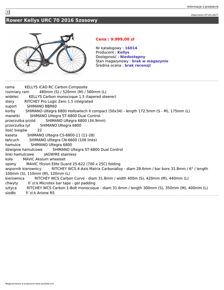 Informacje o produkcie Utworzono 07-03-2017 Rower Kellys URC 70 2016 Szosowy Cena : 9.999,00 zł Nr katalogowy : 16014 Producent : Kellys Dostępność : Niedostępny Stan magazynowy : brak w magazynie Średnia ocena : brak recenzji rama KELLYS iCAD RC Carbon Composite rozmiary ram 480mm (S) / 520mm (M) / 560mm (L) widelec KELLYS Carbon monocoque 1.5 (tapered steerer) stery RITCHEY Pro Logic Zero 1.5 integrated suport SHIMANO BBR60 korby SHIMANO Ultegra 6800 Hollowtech II compact (50x34) - length 172.5mm (S - M), 175mm (L) manetki SHIMANO Ultegra ST-6800 Dual Control przerzutka przód SHIMANO Ultegra 6800 (34.9mm) przerzutka tył SHIMANO Ultegra 6800 ilość biegów 22 kaseta SHIMANO Ultegra CS-6800-11 (11-28) łańcuch SHIMANO Ultegra CN-6600 (106 links) hamulce SHIMANO Ultegra 6800 dżwignie hamulcowe SHIMANO Ultegra ST-6800 Dual Control linki hamulcowe JAGWIRE stainless koła MAVIC Aksium wheelset opony MAVIC Yksion Elite Guard 25-622 (700 x 25C) folding wspornik kierownicy RITCHEY WCS 4-Axis Matrix Carbonalloy - diam 28.6mm / bar bore 31.8mm / 6° / length 100mm (S), 110mm (M), 120mm (L) kierownica RITCHEY WCS Carbon Curve - diam 31.8mm / width 400m (S), 420mm (M), 440mm (L) chwyty fi´zi:k Microtex bar tape - gel padding sztyca RITCHEY WCS Carbon 1-Bolt monocoque - diam 31.6mm / length 300mm (S), 350mm (M), 400mm (L) siodło fi´zi:k Arione R5 Wygenerowano w programie www.oscGold.com