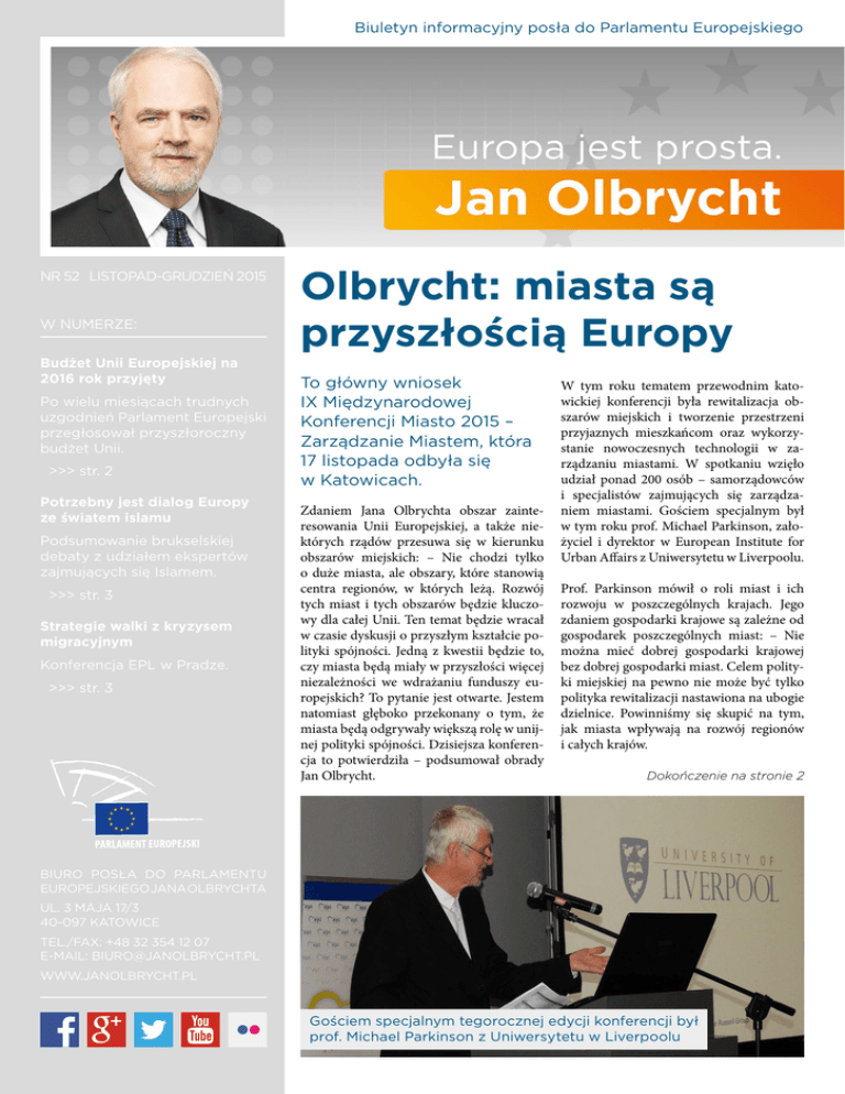Biuletyn informacyjny posła do Parlamentu Europejskiego NR 52 LISTOPAD-GRUDZIEŃ 2015 W NUMERZE: Budżet Unii Europejskiej na 2016 rok przyjęty Po wielu miesiącach trudnych uzgodnień Parlament Europejski przegłosował przyszłoroczny budżet Unii. >>> str. 2 Potrzebny jest dialog Europy ze światem islamu Podsumowanie brukselskiej debaty z udziałem ekspertów zajmujących się Islamem. >>> str. 3 Strategie walki z kryzysem migracyjnym Konferencja EPL w Pradze. >>> str. 3 Olbrycht: miasta są przyszłością Europy To główny wniosek IX Międzynarodowej Konferencji Miasto 2015 – Zarządzanie Miastem, która 17 listopada odbyła się w Katowicach. Zdaniem Jana Olbrychta obszar zainteresowania Unii Europejskiej, a także niektórych rządów przesuwa się w kierunku obszarów miejskich: – Nie chodzi tylko o duże miasta, ale obszary, które stanowią centra regionów, w których leżą. Rozwój tych miast i tych obszarów będzie kluczowy dla całej Unii. Ten temat będzie wracał w czasie dyskusji o przyszłym kształcie polityki spójności. Jedną z kwestii będzie to, czy miasta będą miały w przyszłości więcej niezależności we wdrażaniu funduszy europejskich? To pytanie jest otwarte. Jestem natomiast głęboko przekonany o tym, że miasta będą odgrywały większą rolę w unijnej polityki spójności. Dzisiejsza konferencja to potwierdziła – podsumował obrady Jan Olbrycht. W tym roku tematem przewodnim katowickiej konferencji była rewitalizacja obszarów miejskich i tworzenie przestrzeni przyjaznych mieszkańcom oraz wykorzystanie nowoczesnych technologii w zarządzaniu miastami. W spotkaniu wzięło udział ponad 200 osób – samorządowców i specjalistów zajmujących się zarządzaniem miastami. Gościem specjalnym był w tym roku prof. Michael Parkinson, założyciel i dyrektor w European Institute for Urban Affairs z Uniwersytetu w Liverpoolu. Prof. Parkinson mówił o roli miast i ich rozwoju w poszczególnych krajach. Jego zdaniem gospodarki krajowe są zależne od gospodarek poszczególnych miast: – Nie można mieć dobrej gospodarki krajowej bez dobrej gospodarki miast. Celem polityki miejskiej na pewno nie może być tylko polityka rewitalizacji nastawiona na ubogie dzielnice. Powinniśmy się skupić na tym, jak miasta wpływają na rozwój regionów i całych krajów. Dokończenie na stronie 2 BIURO POSŁA DO PARLAMENTU EUROPEJSKIEGO JANA OLBRYCHTA UL. 3 MAJA 17/3 40-097 KATOWICE TEL./FAX: +48 32 354 12 07 E-MAIL: [email protected] WWW.JANOLBRYCHT.PL Gościem specjalnym tegorocznej edycji konferencji był prof. Michael Parkinson z Uniwersytetu w Liverpoolu Olbrycht: miasta są przyszłością Europy Dokończenie ze strony 1 Potrzebujemy wizji systemów miejskich, dzięki której będziemy wiedzieć, w które z tych obszarów mamy lokować więcej pieniędzy. W tym kontekście odniósł się do kwestii smart city: – To pojęcie jest ostatnio bardzo modne. Inteligentne miasto oznacza jednak olbrzymie wyzwania. Zwykle to integracja komunikacji, technologii, usług i transportu. Ale smart city wymaga przede wszystkim zaangażowanie mieszkańców. Nowoczesne technologie to za mało. Mówiąc o rewitalizacji miast prof. Parkinson zwrócił uwagę na potrzebę powiązania jej z innymi politykami realizowanymi w całym mieście: – Trzeba przekonać ludzi i firmy, że mają w tym interes ekonomiczny. Ludzie muszą rozumieć, co się zmieni. Działania miasta muszą być przejrzyste, program musi być zrozumiały. Trzeba mieć wizję miasta i pamiętać, że na efekty trzeba czasem długo czekać. Odnosząc się do sytuacji w Polsce, prof. Parkinson wskazał, że spośród polskich miast tylko Warszawa i Poznań rozwijają się szybciej niż średnia europejska: – Na sukces wpłynęło na pewno też i to, że w Polsce jest sporo osób z wyższym wykształceniem. To ważne jeśli chodzi o rozwój miast. Jego zdaniem widoczny jest też brak spójnych strategii w wielu kwestiach i silną konkurencję między samorządami, z których każdy chce działać na własną rękę: – Moja rada jest taka, że Polska potrzebuje spójnej polityki. Metropolia Silesia potrzebuje też większej integracji. Dziś to dobrowolne stowarzyszenie – zakończył. W drugiej część konferencji, którą prowadził Jan Olbrycht, dyskutowano o tym, jak zachować równowagę między modernizacją miejskiej infrastruktury a potrzebami społeczności lokalnych. Rozmawiali o tym Zygmunt Frankiewicz, prezydent Gliwic, prezes Związku Miast Polskich, Roman Szełemej, prezydent Wałbrzycha, Hanna Zdanowska, prezydent Łodzi i Jacek Karnowski, prezydent Sopotu. W części trze- ciej zastanawiano się nad tym, czy polskie miasta przyszłości będą użyteczne. Rozmawiali o tym Jacek Włodek, doradca prezydenta Tarnowa ds. inwestycji, Piotr Skirski z Cisco Systems, Artur Kolesiński z Microsoft oraz Patryk Białas z Euro-Centrum w Katowicach. Organizatorami konferencji było stowarzyszenie „Europa jest prosta”, poseł do Parlamentu Europejskiego dr Jan Olbrycht, europarlamentarna Intergrupa Urban i Związek Miast Polskich. Partnerami konferencji byli: Microsoft, IBM, Cisco Systems i Dimension Data. Patronat medialny nad konferencją objęli: Dziennik Zachodni, Polskie Radio Katowice, Serwis Samorządowy PAP, Gazeta Samorządu i Administracji, Miesięcznik Gospodarczy Nowy Przemysł, portal wnp.pl i Portal Samorządowy. Wprowadzane w miastach technologie muszą być nie tylko „inteligentne” ale i użyteczne dla mieszkańców, zgodnie podkreślali uczestnicy panelu poświęconego „Smart Cities” Europarlament przyjął budżet na 2016 25 listopada Parlament Europejski przyjął budżet Unii Europejskiej na przyszły rok. Zaakceptował tym samym wynik negocjacji międzyinstytucjonalnych toczonych w ostatnich miesiącach. 2 – Pomimo trudności związanych z kryzysem migracyjnym i konieczności zwiększenia wydatków, doszliśmy do porozumienia. Rada UE zgodziła się jedn