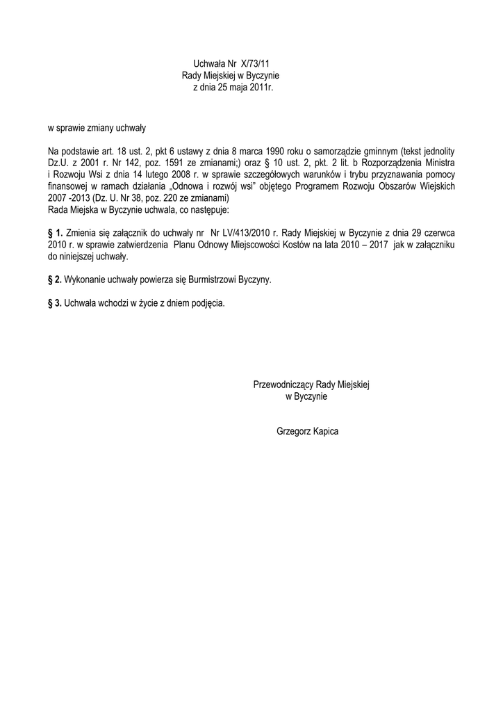 Uchwała Nr X/73/11 Rady Miejskiej w Byczynie z dnia 25 maja 2011r. w sprawie zmiany uchwały Na podstawie art. 18 ust. 2, pkt 6 ustawy z dnia 8 marca 1990 roku o samorządzie gminnym (tekst jednolity Dz.U. z 2001 r. Nr 142, poz. 1591 ze zmianami;) oraz § 10 ust. 2, pkt. 2 lit. b Rozporządzenia Ministra i Rozwoju Wsi z dnia 14 lutego 2008 r. w sprawie szczegółowych warunków i trybu przyznawania pomocy finansowej w ramach działania „Odnowa i rozwój wsi” objętego Programem Rozwoju Obszarów Wiejskich 2007 -2013 (Dz. U. Nr 38, poz. 220 ze zmianami) Rada Miejska w Byczynie uchwala, co następuje: § 1. Zmienia się załącznik do uchwały nr Nr LV/413/2010 r. Rady Miejskiej w Byczynie z dnia 29 czerwca 2010 r. w sprawie zatwierdzenia Planu Odnowy Miejscowości Kostów na lata 2010 – 2017 jak w załączniku do niniejszej uchwały. § 2. Wykonanie uchwały powierza się Burmistrzowi Byczyny. § 3. Uchwała wchodzi w życie z dniem podjęcia. Przewodniczący Rady Miejskiej w Byczynie Grzegorz Kapica Załącznik do uchwały nr X/73/11 Rady Miejskiej w Byczynie z dnia 25 maja 2011 r. Plan Odnowy Miejscowości Kostów na lata 2010 – 2017 Wieś Kostów 2010 r. - Gmina Byczyna „... Twórzcie kulturę wsi, w której obok nowych wymiarów, jakie niosą czasy, pozostanie – jak u dobrego gospodarza – miejsce na rzeczy dawne, uświęcone tradycją, powierzone przez prawdę wieków...” Jan Paweł II SPIS TREŚCI Wstęp..............................................................................................................4 1 Charakterystyka Kostowa .........................................................................................5 1.1 Położenie ......................................................................................................................5 1.2 Przynależność administracyjna ....................................................................................5 1.3 Powierzchnia ................................................................................................................6 1.4 Liczba ludności ........................................................................................................... 6 1.5 Historia Kostowa ..........................................................................................................7 1.6 Struktura przestrzenna miejscowości ...........................................................................9 2 Inwentaryzacja zasobów służących odnowie miejscowości ....................................9 2.1 Zasoby przyrodnicze ................................................................................................... 9 2.2 Dziedzictwo kulturowe ............................................................................................10 2.3 Infrastruktura społeczna..............................................................................................11 2.4 Infrastruktura techniczna ............................................................................................12 2.5 Gospodarka i rolnictwo ..............................................................................................13 2.6 Kapitał społeczny i ludzki ..........................................................................................14 3 Analiza SWOT .........................................................................................................14 3.1 Mocne i słabe strony...................................................................................................14 3.2 Szanse i zagrożenia ....................................................................................................16 4 Opis planowanych zadań inwestycyjnych i przedsięwzięć aktywizujących społeczność lokalną w okresie 2010 – 2016 w kolejności wynikającej z przyjętych priorytetów rozwoju miejscowości 17 4.1 Wizja rozwoju miejscowości ......................................................................................17 4.2 Opis priorytetowego planowanego zadania .............................................................. 20 5 Wdrożenie i monitorowanie planu ............................................................................21 6 Opis i charakterystyka obszarów o szczególnym znaczeniu dla zaspokojenia potrzeb mieszkańców, sprzyjających nawiązywaniu kontaktów społecznych, ze względu na ich położenie oraz cechy funkcjonalno – przestrzenne..............................21 Podsumowanie ................................................................................................................. 22 Wstęp Rozwój i odnowa obszarów wiejskich to jedno z kluczowych wyznań, jakie stoją przed Polska w okresie integracji z Unia Europejską. Zasadniczym jej celem jest wzmocnienie działań służących zmniejszaniu istniejących dysproporcji i różnic w poziomie rozwoju obszarów wiejskich w stosunku do obszarów miejskich. Plan Odnowy Miejscowości jest jednym z najważniejszych elementów odnowy wsi, jej rozwoju oraz poprawy warunków pracy życia mieszkańców. Sporządzenie i uchwalenie takiego dokumentu stanowi niezbędny warunek przy aplikowaniu o środki finansowe w ramach „Programu Rozwoju obszarów Wiejskich 2007-2013” działanie „ Odnowa i rozwój wsi”, jak również stanowić będzie wytyczne dla władz Gminy Byczyna przy opracowaniu kierunków rozwoju miejscowości Kostów. Celem działania „ Odnowa i rozwój wsi” jest poprawa jakości życia na obszarach wiejskich poprzez zaspokojenie potrzeb społecznych i kulturalnych mieszkańców wsi oraz promowanie obszarów wiejskich. Działanie umożliwi rozwój tożsamości społeczności wiejskiej, zachowanie dziedzictwa kulturowego i specyfiki obszarów wiejskich oraz wpłynie na wzrost ich atrakcyjności turystycznej i inwestycyjnej. PLAN ODNOWY MIEJSCOWOŚCI KOSTÓW jest dokumentem o charakterze planowania strategicznego dla Kostowa na lata 2010 – 2017, który umożliwi ubieganie się o pomoc fina