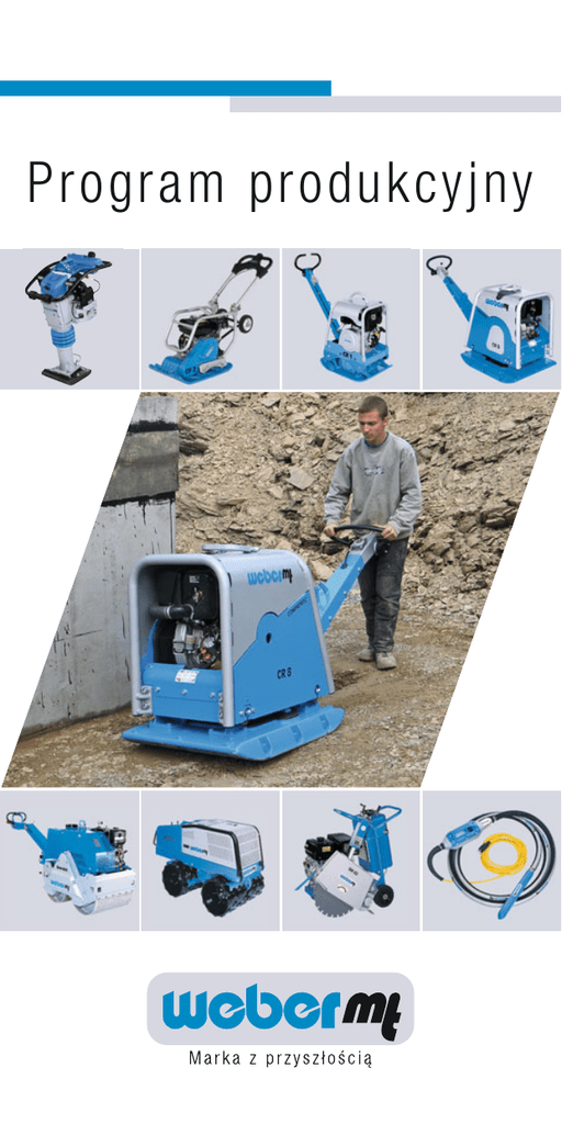 Program produkcyjny Marka z przyszłością Weber MT jest marką z przyszłością n Postęp poprzez innowacyjne produkty w najnowocześniejszym wykonawstwie. n Postęp poprzez szczytowe technologie na bazie badań podstawowych. n Postęp poprzez jakość i jej podnoszenie. n Postęp poprzez „knowhow” kompetentnych pracowników. – to właśnie, „Made by Weber MT“. Wolfgang Weber Przykładem innowacyjnej siły przedsiębiorstwa jest COMPATROL®, pierwszy ciągły, nawierzchniowy system kontroli zagęszczania gruntu, przeznaczony do zagęszczarek kierowanych ręcznie. Zapewnia on optymalny wynik zagęszczenia. Postęp i jakość – dotyczy wszystkich produktów Weber MT opracowanych i wdrożonych w ostatnich latach. Na własnym poligonie doświadczalnym i w hali prób poza typowymi testami wykonywane są specjalistyczne pomiary hałasu i przyśpieszeń. Każdą maszynę „made by Weber MT” przed wprowadzeniem do produkcji seryjnej poddaje się szczegółowym badaniom. Aby zapewnić stały, wysoki poziom jakości przemyślany jest każdy detal wszystkich modeli Weber MT, wykonanych z wykorzystaniem najnowocześniejszych środków produkcji, łatwych w obsłudze oraz trwałych i niezawodnych w codziennym użytkowaniu na placu budowy. Dzięki temu stosowanie maszyn ze znakiem Weber MT jest bardzo korzystne ekonomicznie. Weber MT jest średniej wielkości przedsiębiorstwem produkcyjnym posiadającym szerokie kontakty handlowe na całym świecie. Udział eksportu w ogólnej produkcji kształtuje się na poziomie ponad 60 procent. Ważnymi rynkami na których działają samodzielnie firmy-córki i biura handlowe są obok Europy Stany Zjednoczone, Kanada oraz Ameryka Południowa. COMPATROL® został rozszerzony o zarządzanie maszyną i jej serwisem: COMPATROL® - MSM. W ten sposób Weber MT dokumentuje swoją wiodącą pozycję w dziedzinie ręcznie kierowanych maszyn zagęszczających. Zagęszczarki jednokierunkowe Zagęszczarki jednokierunkowe Uniwersalne i praktyczne zagęszczarki jednokierunkowe firmy Weber MT. Składana rękojeść ułatwia transport, a dostępne akcesoria zwiększają możliwość zastosowań. CF 3 L Dane techniczne Typ Waga Szerokość Siła odśrodkowa Silnik CF 1 66-68 kg 40 cm 10 kN Robin / Honda CF 2 83 kg 45 cm 15 kN Robin / Honda CF 3 99-113 kg 50 cm 20 kN Robin / Honda / Lombardini Zagęszczarki dwukierunkowe Zagęszczarki dwukierunkowe do wszelkiego typu prac budowlanych, których konstrukcja oparta na najnowszych rozwiązaniach cechuje się wysoką jakością wytrzymałością i optymalnymi parametrami pracy. Seryjne wyposażenie stanowi sprzęgło regulujące napięcie paska klinowego i rama ochronna silnika z uchwytem transportowym. CR 5 CR 1 Dane techniczne Typ Waga Szerokość Siła odśrodkowa Silnik CR 1 103-118 kg 40 cm 20 kN Robin / Honda / Lombardini CR 2 131-145 kg 45 cm 25 kN Robin / Honda / Lombardini CR 3 203-224 kg 50 (60) cm 35 kN Honda / Hatz CR 5 273-298 kg 55(70) cm 42 kN Honda / Hatz Zagęszczarki dwukierunkowe Zagęszczarki dwukierunkowe Zaawansowane technologicznie zagęszczarki klasy ciężkiej typu CR produkowane przez firmę Weber MT, to maszyny najwyższej jakości sprawdzające się w najtrudniejszych warunkach. Seryjne wyposażenie stanowią: sprzęgło regulujące napięcie paska klinowego, rama ochronna z osłoną silnika i rozrusznik elektryczny. CR 6 Dane techniczne Typ Waga Szerokość Siła odśrodkowa Silnik CR 6 412-416 kg 60 (45 / 70) cm 50 kN Lombardini CR 7 437-480 kg 60 kN Honda / Lombardini CR 8 524-589 kg 70 (85) cm 74 kN Honda / Hatz CR 10 900 kg 80 (70 / 95) cm 100 kN Lombardini 60 (80) cm Stopy wibracyjne Stopy wibracyjne Wysoka wydajność to cecha charakterystyczna stóp wibracyjnych. Wysokowydajny i efektywny filtr powietrza, specjalny system smarowania i zabezpieczenia tłoczyska, miech z 4 wzmocnionymi żebrami, wpływają na wytrzymałość konstrukcji i bezpieczeństwo pracy. Uchwyty i rolki ułatwiające transport. SRX 75 DH Dane techniczne Typ Waga Szerokość stopy Liczba uderzeń Silnik SRV 620 66 kg 28 cm 720 1/ min Honda (4-suw) SRV 660 75 kg 28 cm 670 1/ min Robin (4-suw) SRX 75 DH 81 kg 28 cm 670 1/ min Hatz (Diesel) Walce wibracyjne Walce wibracyjne Weber MT oferuje dwa typy walców: DVH do zagęszczania mas bitumicznych i TRC do zagęszczania ciężkich gruntów. Walce okołkowane TRC wyposażone są w szereg rozwiązań ułatwiających obsługę: zdalne sterowanie, możliwość ręcznego sterowania pracą wibratora, zamykaną osłonę pulpitu sterowania. DVH 655 Dane techniczne (Walce DVH) Typ Gewicht Waga Szerokość Arbeits- ZentrifugalSiła breite odśrodkowa kraft Motor Silnik DVH 550 350 / 365 kg 55 cm 8 kN Robin / Lombardini DVH 600 420 kg 65 cm 10 kN Lombardini DVH 655 E 732 kg 65 cm 21 kN Lombardini Dane techniczne (Walce okołkowane TRC) TRC 66 1.350 kg 65 cm 75 kN Lombardini TRC 86 1.390 kg 85 cm 75 kN Lombardini Przecinarki Przecinarki Przecinarki typu SM umożliwiają wykonywanie cięć na głębokość do 165 mm. Seryjnie wyposażone są w zbiornik wody i wskaźnik głębokości cięcia. Dane techniczne Typ Gewicht Waga Głębokość SchneidScheibenŚrednica cięcia tiefe durchmesser tarczy Motor Silnik SM 57-2 62-70 kg 120 mm 350 mm SM 62-2 85 kg 145 mm 400 mm Robin SM 82-2 128 kg 165 mm 450 mm Honda Honda/Robin/Elektro Zagęszczanie betonu Zagęszczanie betonu Wibratory wgłębne serii IVUR, podłączane bezpośrednio do źródła prądu zmiennego 230 V, stanowią kompletny zestaw buławy z przetwornicą częstotliwości, umożliwiający jednocześnie łatwą wymianę samej buławy. Buławy wgłębne typu IV współpracują z przetwornicami częstotliwości i napięcia FUE/FUD lub EFU. IV 58 FUE IVUR Dane techniczne (Wibratory wgłębne) Typ Gewicht Waga FlaschenŚrednica durchmesser buławy NennMoc leistung StromPobór aufnahme prądu IVUR 14-17 kg 40-58 mm 650-1.050 W 4,6 A IV 31-IV 80 10-32 kg 31-80 mm 550-1.700 W 8-26 A IV 40 D-IV 58D 8-11 kg 40-58 mm 550-1.050 W 8-16 