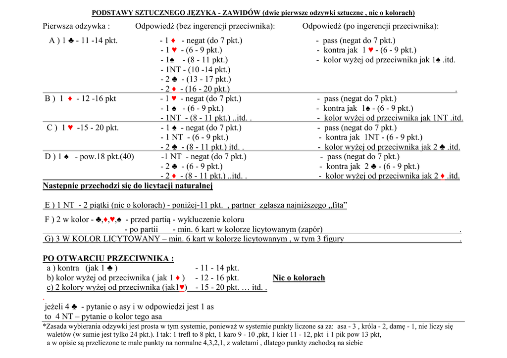 PODSTAWY SZTUCZEGO JĘZYKA - ZAWIDÓW (dwie pierwsze odzywki sztuczne , nic o kolorach) Pierwsza odzywka : A ) 1 ♣ - 11 -14 pkt. Odpowiedź (bez ingerencji przeciwnika): - 1 ♦ - negat (do 7 pkt.) - 1 ♥ - (6 - 9 pkt.) - 1♠ - (8 - 11 pkt.) - 1NT - (10 -14 pkt.) - 2 ♣ - (13 - 17 pkt.) - 2 ♦ - (16 - 20 pkt.) B ) 1 ♦ - 12 -16 pkt - 1 ♥ - negat (do 7 pkt.) - 1 ♠ - (6 - 9 pkt.) - 1NT - (8 - 11 pkt.) ..itd. . - 1 ♠ - negat (do 7 pkt.) C ) 1 ♥ -15 - 20 pkt. - 1 NT - (6 - 9 pkt.) - 2 ♣ - (8 - 11 pkt.) itd. . D ) 1 ♠ - pow.18 pkt.(40) -1 NT - negat (do 7 pkt.) - 2 ♣ - (6 - 9 pkt.) - 2 ♦ - (8 - 11 pkt.) ..itd. . astępnie przechodzi się do licytacji naturalnej Odpowiedź (po ingerencji przeciwnika): - pass (negat do 7 pkt.) - kontra jak 1 ♥ - (6 - 9 pkt.) - kolor wyżej od przeciwnika jak 1♠ .itd. . - pass (negat do 7 pkt.) - kontra jak 1♠ - (6 - 9 pkt.) - kolor wyżej od przeciwnika jak 1NT .itd. - pass (negat do 7 pkt.) - kontra jak 1NT - (6 - 9 pkt.) - kolor wyżej od przeciwnika jak 2 ♣ .itd. - pass (negat do 7 pkt.) - kontra jak 2 ♣ - (6 - 9 pkt.) - kolor wyżej od przeciwnika jak 2 ♦ .itd. E ) 1 NT - 2 piątki (nic o kolorach) - poniżej-11 pkt. , partner zgłasza najniższego „fita” F ) 2 w kolor - ♣,♦,♥,♠ - przed partią - wykluczenie koloru - po partii - min. 6 kart w kolorze licytowanym (zapór) G) 3 W KOLOR LICYTOWANY – min. 6 kart w kolorze licytowanym , w tym 3 figury PO OTWARCIU PRZECIWIKA : a ) kontra (jak 1 ♣ ) - 11 - 14 pkt. b) kolor wyżej od przeciwnika ( jak 1 ♦ ) - 12 - 16 pkt. ic o kolorach c) 2 kolory wyżej od przeciwnika (jak1♥) - 15 - 20 pkt. … itd. . . jeżeli 4 ♣ - pytanie o asy i w odpowiedzi jest 1 as to 4 NT – pytanie o kolor tego asa *Zasada wybierania odzywki jest prosta w tym systemie, ponieważ w systemie punkty liczone sa za: asa - 3 , króla - 2, damę - 1, nie liczy się waletów (w sumie jest tylko 24 pkt.). I tak: 1 trefl to 8 pkt, 1 karo 9 - 10 ,pkt, 1 kier 11 - 12, pkt i 1 pik pow 13 pkt, a w opisie są przeliczone te małe punkty na normalne 4,3,2,1, z waletami , dlatego punkty zachodzą na siebie . .