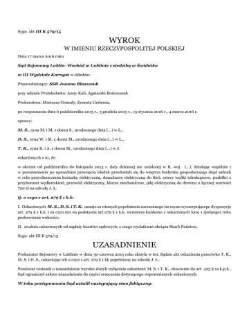 Sygn. akt III K 579/15 WYROK W IMIENIU RZECZYPOSPOLITEJ POLSKIEJ Dnia 17 marca 2016 roku Sąd Rejonowy Lublin- Wschód w Lublinie z siedzibą w Świdniku w III Wydziale Karnym w składzie: Przewodniczący: SSR Joanna Błaszczuk przy udziale Protokolanta: Anny Kuli, Agnieszki Bończoszek Prokuratora: Mariusza Gomuły, Ernesta Grabosia, po rozpoznaniu dnia 6 października 2015 r., 3 grudnia 2015 r., 15 stycznia 2016 r., 4 marca 2016 r. sprawy: M. S., syna M. i M. z domu S., urodzonego dnia (...) w L., D. S., syna W. i M. z domu M., urodzonego dnia (...) w L., T. K., syna R. i A. z domu M., urodzonego dnia (...) w J. oskarżonych o to, że: w okresie od październiku do listopada 2013 r. daty dziennej nie ustalonej w R. woj. (...), działając wspólnie i w porozumieniu po uprzednim przecięciu kłódek przedostali się do wnętrza budynku gospodarczego skąd zabrali w celu przywłaszczenia kosiarkę elektryczną, dmuchawę elektryczną do liści, cztery wędki teleskopowe, pudełko z przyborami wędkarskimi, przewód elektryczny, klucze mechaniczne, piłę elektryczną do drewna o łącznej wartości 720 zł na szkodę J. Ł. tj. o czyn z art. 279 § 1 k.k. I. Oskarżonych M. S., D. S. i T. K. uznaje za winnych popełnienia zarzucanego im czynu wyczerpującego dyspozycję art. 279 § 1 k.k. i za czyn ten na podstawie art.279 § 1 k.k. wymierza każdemu z oskarżonych karę 1 (jednego) roku pozbawienia wolności; II. zwalnia oskarżonych od zapłaty kosztów sądowych, z czego wydatkami obciąża Skarb Państwa. Sygn. akt III K 579/15 UZASADNIENIE Prokurator Rejonowy w Lublinie w dniu 30 czerwca 2015 roku złożyła w tut. Sądzie akt oskarżenia przeciwko T. K., M. S. i D. S., oskarżając ich o czyn z art. 279 § 1 kk popełniony na szkodę J. Ł.. Ponieważ wniosek o uzasadnienie wyroku złożyli wyłącznie oskarżeni: M. S. i T. K., stosownie do art. 423 § 1a k.p.k., Sąd ograniczył zakres uzasadnienia do części orzeczenia dotyczącego wspomnianych oskarżonych. W toku postępowania Sąd ustalił następujący stan faktyczny: W okresie od października 2013 roku do grudnia 2013 roku M. S. wraz z D. S. oraz T. K. dokonali szeregu włamań do domków letniskowych oraz budynków gospodarczych na terenie województwa (...) w miejscowościach: R., L. i D.. Oskarżeni zostali skazani już za część czynów popełnionych w tym okresie wyrokiem Sądu Rejonowego Lublin Wschód w Lublinie z siedzibą w Świdniku z dnia 6 listopada 2015 roku w sprawie III K 866/14, przy czym wyrok ten w stosunku do oskarżonych T. K. i M. S. nie jest prawomocny. W okresie od października 2013 roku do listopada 2013 roku daty dziennej nieustalonej w miejscowości R. w okolicy jeziora Ł. oskarżeni M. S. wraz z D. S. oraz T. K. po przecięciu kłódek przedostali się do wnętrza budynku gospodarczego (numer domu 172) skąd zabrali w celu przywłaszczenia: kosiarkę elektryczną, dmuchawę elektryczną do liści, cztery wędki teleskopowe, pudełko z przyborami wędkarskimi, przewód elektryczny, klucze mechaniczne i piłę elektryczną do drewna. Właścicielem wspomnianej działki był J. Ł., który w wyniku tego włamania i kradzieży poniósł łącznie straty w wysokości 720 złotych. Pokrzywdzony w trakcie przesłuchania w Komendzie Powiatowej Policji w Ł. wśród okazanych mu rzeczy pochodzących z kradzieży w rozpoznał cześć przedmiotów jako stanowiących jego własność, które utracił uprzednio na skutek włamania do garażu. J. Ł. rozpoznał jako należące do niego – dmuchawę do liści koloru zielonego, wędzisko teleskopowe (...) z kołowrotkiem oraz wędkę teleskopową koloru czerwono czarnego nazwie (...) wraz z kołowrotkiem (...). Pokrzywdzonemu zwrócono rozpoznane przez niego przedmioty, których wartość wynosiła 150 złotych. Skradzione rzeczy częściowo zostały wydane dobrowolnie przez D. S., który wskazał policji miejsce ich ukrycia tj. opuszczoną posesję w miejscowości D.. Inne skradzione przedmioty tj. dmuchawę do liści koloru zielonego odnaleziono u M. S. (2), który wydał ją dobrowolnie w trakcie przeszukania jego domu. M. S. (2) zakupił przedmiotową dmuchawę od M. S. i D. S.. Do sprzedaży doszło w miejscowości D., gdzie M. S. (2) przyjechał osobiście po telefonie od szwagra tj. D. S.. Oskarżeni: M. S., T. K. byli już karani za przestępstwa. Zarówno M. S. jak i T. K. są osobami bezrobotnymi, utrzymującymi się z podejmowanych prac dorywczych. Nie posiadają majątku. Obaj są bezdzietnymi kawalerami, nie mają nikogo na utrzymaniu. M. S. nie posiada przy tym zawodu, ma wyksztalcenie podstawowe. T. K. zaś jest z zawodu kaletnikiem. M. S. nadto w chwili czynu był osobą zdolną do rozpoznania jego znaczenia i pokierowania swoim postępowaniem. Powyższy stan faktyczny Sąd ustalił w oparciu o następujące dowody: częściowe wyjaśnienia oskarżonych: D. S. (k. 134v-135), T. K. (k. 134-134v), zeznania pokrzywdzonego J. Ł. (k. 14-14v, 18-19, 135-136), zeznania świadków: M. S. (2) (k. 17-17v,136-136v) i A. L. (k. 46-46v, 136v) oraz w oparciu o następujące dokumenty: protokół przeszukania (k. 2-4), protokół zatrzymania rzeczy (k. 5-7), protokół oględzin miejsca (k. 8-10), dane o karalności oskarżonych (k. 49-50,52-54, 99-104, 148-153), dane osobopoznawcze dotyczące oskarżonych (k. 55-56,82-83), opinia sądowo – psychiatryczna dot. M. S. (k. 58-73), kserokopia wyroku ze sprawy III K 866/14 i uzasadnienie tego wyroku (k. 158-173), a nadto dokumenty z akt dołączonych III K 1210/14 w postaci opinii biegłego z zakresu wyceny ruchomości (k. 20-104) , wyroku skazującego dot. M. S. (2) (k. 127-128). W toku pierwszych wyjaśnień złożonych w postępowaniu przygotowawczym oskarżony D. S. nie przyznał się do dokonania zarzucanego mu czynu i odmówił składania wyjaśnień. Przed Sądem pierwotnie odmówił składania wyjaśnień twierdząc, iż nie pamięta tego czynu z uwagi na fakt spożywania alkoholu. W toku dalszych w