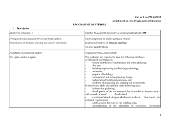 Zał. nr 2 do ZW 64/2012 Attachment no. 2 to Programme of Education PROGRAMME OF STUDIES 1. Description Number of semesters: 7 Number ECTS points necessary to obtain qualifications: 210 Prerequisites (particularly for second-level studies): Upon completion of studies graduate obtains Examination of freehand drawing and contest certificates professional degree of: inżynier architekt 1st level qualifications Possibility of continuing studies: Graduate profile, employability 2nd cycle, master program The graduates are expected to have the following attributes: A/ Specialist knowledge in: history and theory of architecture and urban planning, fine arts, building engineering and building technology, structures, physics of buildings, architectural and urban planning design, technical and building regulations, and methods of organizing and carrying out investments. B/ Intellectual skills and abilities in the following areas: information gathering, development of the environment that is suitable to human needs – with consideration of the disabled, creation of simple designs which meet aesthetic, functional and technical requirements. application of the rules of the building code, understanding of the principles of economics, investment 1 procedures and designing processes, both within the country and in other European Union states. The graduate will have learned a modern foreign language at least up to B2 level in the Common European Framework of Reference for Languages. The graduates are qualified to take up professional employment as as assistant architects, general contractors and supervisors of construction in the field of urban planning and design of architecture and its surroundings. Indicate connection with University’s mission and its development strategy: 2. Fields of science and scientific disciplines to which educational effects apply: Engineering Sciences Architecture and Urban Planning 3. Concise analysis of consistency between assumed educational effects and labour market needs 2 4. List of education modules: 4.1. List of obligatory modules: 4.1.1 List of general education modules 4.1.1.1 Information technologies module (min. 2 pkt ECTS): 1 AUA 001107 Information Technologies Total pr Sem Weekly number of hours cl Name of course/group of courses (denote group of courses with symbol GK) lab Course/group of courses code lec No. 2 2 Field-ofstudy educational effect symbol Number of hours W03 Number of ECTS points ZZU CNPS total BK classes1 30 30 60 60 2 2 2 2 Form2 of course/gr oup of courses Way3 of crediting T Z Altogether for general education modules Total number of hours lec 2 1 cl Lab pr Total Total Total Number of ECTS number of number of number of points for BK ZZU CNPS ECTS classes1 Hours hours points sem 30 60 2 2 BK – number of ECTS points assigned to hours of classes requiring direct contact of teachers with students Traditional – enter T, remote – enter Z 3 Exam – enter E, crediting – enter Z. For the group of courses – after the letter E or Z - enter in brackets the final course form (lec, cl, lab, pr, sem) 4 University-wide course /group of courses – enter O 5 Practical course / group of courses – enter P. For the group of courses – in brackets enter the number of ECTS points assigned to practical courses 6 KO – general education, PD – basic sciences, K – field-of-studies, S – specialization 7 Optional – enter W, obligatory – enter Ob 2 Course/group of courses universitywide4 practical5 kind6 type7 - - KO Ob 4.1.2 List of basic sciences modules 4.1.2.1 Mathematics module MAP 001093Wc Mathematics 1 GK 2 2 MAP 001094Wc Mathematics 2 GK 2 2 3 AUA 105600Wc Descriptive Geometry 1 GK 2 2 6 6 Total pr 2 Field-of-study educational effect symbol Sem Weekly number of hours lab Name of course/group of courses (denote group of courses with symbol GK) cl 1 Course/group of courses code lec No. W04 U05 W05 U06 Number of hours Number of ECTS points Form2 of course/gr oup of courses Way3 of crediting ZZU CNPS total BK classes1 60 180 6 4 T 60 180 6 4 60 180 6 4 180 540 18 12 Course/group of courses universitywide4 practical5 kind6 type7 E(w) - C(2) PD Ob T E(w) - C(2) PD Ob T E(w) - P(2) PD Ob Form2 of course/gr oup of courses Way3 of crediting T T T T T E Z E Z Z(w) 4.1.2.2 Physics module 1 2 3 4 5 1 AUA 002305W AUA 002305C AUA 002405W AUA 002405C AUA 105525Wc Theory of Structures 1 Theory of Structures 1 Theory of Structures 2 Theory of Structures 2 Physics of Building GK 2 1 2 1 Total 4 4 1 1 pr Field-of-study educational effect symbol Sem Weekly number of hours cl Name of course/group of courses (denote group of courses with symbol GK) lab Course/group of courses code lec No. W06 W07 U02 U07 W07 W08, U08,U09, Number of hours Number of ECTS points ZZU CNPS total BK classes1 30 15 15 30 30 60 30 60 30 60 2 1 2 1 2 1 1 1 1 2 120 240 8 6 BK – liczba punktów ECTS przypisanych godzinom zajęć wymagających bezpośredniego kontaktu nauczycieli i studentów Tradycyjna – T, zdalna – Z 3 Egzamin – E, zaliczenie na ocenę – Z. W grupie kursów po literze E lub Z w nawiasie wpisać formę kursu końcowego (w, c, l, s, p) 4 Kurs/ grupa kursów Ogólnouczelniany – O 5 Kurs/ grupa kursów Praktyczny – P. W grupie kursów w nawiasie wpisać liczbę punktów ECTS dla kursów o charakterze praktycznym 6 KO - kształcenia ogólnego, PD – podstawowy, K – kierunkowy, S – specjalnościowy 7 W - wybieralny, Ob – obowiązkowy 2 Course/group of courses universitywide4 practical5 kind6 type7 - P P P(1) PD PD PD PD PD Ob Ob Ob Ob Ob 4 Altogether of basic sciences modules Total number of hours 4.1.3 cl 10 Lab pr sem 300 780 26 Sem lec 10 Total Total Total Number of ECTS number of number of number of points for BK ZZU CNPS ECTS classes1 Hours hours points Field-ofstudy education al effect symbol 18 List of main-field-of-study modules 4.1.3.1 Obligatory main-field-of-study modules 1 2 3 4 AUA 001106W AUA 001106P AUA 001201W AUA 001201P Elements of Archit