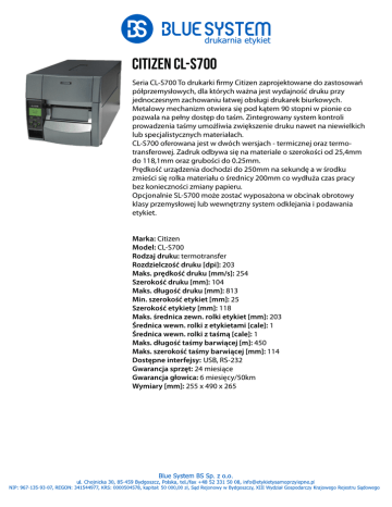 citizen cl-s700 Seria CL-S700 To drukarki firmy Citizen zaprojektowane do zastosowań półprzemysłowych, dla których ważna jest wydajność druku przy jednoczesnym zachowaniu łatwej obsługi drukarek biurkowych. Metalowy mechanizm otwiera się pod kątem 90 stopni w pionie co pozwala na pełny dostęp do taśm. Zintegrowany system kontroli prowadzenia taśmy umożliwia zwiększenie druku nawet na niewielkich lub specjalistycznych materiałach. CL-S700 oferowana jest w dwóch wersjach - termicznej oraz termotransferowej. Zadruk odbywa się na materiale o szerokości od 25,4mm do 118,1mm oraz grubości do 0.25mm. Prędkość urządzenia dochodzi do 250mm na sekundę a w środku zmieści się rolka materiału o średnicy 200mm co wydłuża czas pracy bez konieczności zmiany papieru. Opcjonalnie SL-S700 może zostać wyposażona w obcinak obrotowy klasy przemysłowej lub wewnętrzny system odklejania i podawania etykiet. Marka: Citizen Model: CL-S700 Rodzaj druku: termotransfer Rozdzielczość druku [dpi]: 203 Maks. prędkość druku [mm/s]: 254 Szerokość druku [mm]: 104 Maks. długość druku [mm]: 813 Min. szerokość etykiet [mm]: 25 Szerokość etykiety [mm]: 118 Maks. średnica zewn. rolki etykiet [mm]: 203 Średnica wewn. rolki z etykietami [cale]: 1 Średnica wewn. rolki z taśmą [cale]: 1 Maks. długość taśmy barwiącej [m]: 450 Maks. szerokość taśmy barwiącej [mm]: 114 Dostępne interfejsy: USB, RS-232 Gwarancja sprzęt: 24 miesiące Gwarancja głowica: 6 miesięcy/50km Wymiary [mm]: 255 x 490 x 265