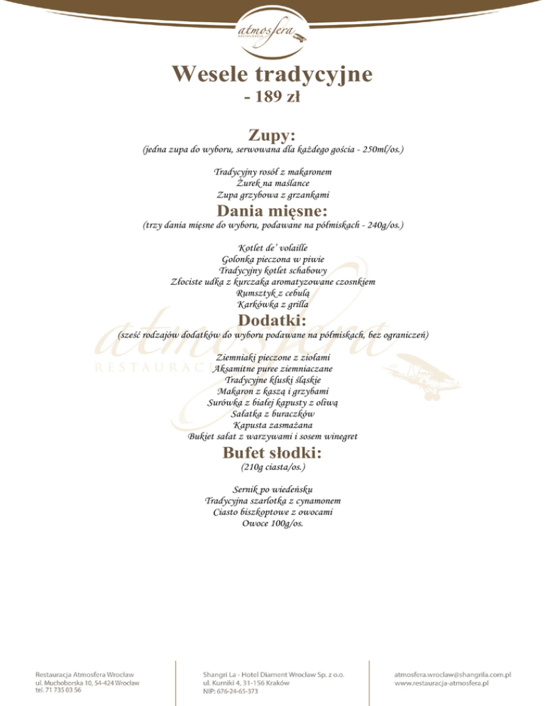 Wesele tradycyjne - 189 zł Zupy: (jedna zupa do wyboru, serwowana dla każdego gościa - 250ml/os.) Tradycyjny rosół z makaronem Żurek na maślance Zupa grzybowa z grzankami Dania mięsne: (trzy dania mięsne do wyboru, podawane na półmiskach - 240g/os.) Kotlet de’ volaille Golonka pieczona w piwie Tradycyjny kotlet schabowy Złociste udka z kurczaka aromatyzowane czosnkiem Rumsztyk z cebulą Karkówka z grilla Dodatki: (sześć rodzajów dodatków do wyboru podawane na półmiskach, bez ograniczeń) Ziemniaki pieczone z ziołami Aksamitne puree ziemniaczane Tradycyjne kluski śląskie Makaron z kaszą i grzybami Surówka z białej kapusty z oliwą Sałatka z buraczków Kapusta zasmażana Bukiet sałat z warzywami i sosem winegret Bufet słodki: (210g ciasta/os.) Sernik po wiedeńsku Tradycyjna szarlotka z cynamonem Ciasto biszkoptowe z owocami Owoce 100g/os. Bufet wiejski: (dania kuchni tradycyjnej podawane w bufecie, 280g/os.) Tradycyjny bochen chleba Wiejski smalec z prażonym bekonem Ogórki kiszone Chrzan, żurawina Swojskie specjały (salceson, kaszanka, wędliny, kabanosy) Pasztet myśliwski Marynaty Zakąski na zimno: (dania podawane do stołu na półmiskach lub w formie bufetu, 480g/os.) Śledź w musie jabłkowym Półmisek pieczeni staropolskich Szparagi owijane szynką Galaretki z kurczaka z warzywami Tradycyjna sałatka wielowarzywna Wątróbka owijana boczkiem Jaja w sosie tatarskim Polędwiczka na grzance z grzybami leśnymi Bułki na gorąco, masło Kolacje: (dwie kolacje serwowane o wyznaczonej godzinie) Staropolski bigos w chlebowej sakiewce 150g/150g Barszcz z mięsnymi smażonymi pierogami 200ml/170g Napoje: (bez limitu) Sok owocowy – dwa smaki, woda mineralna Herbata, kawa