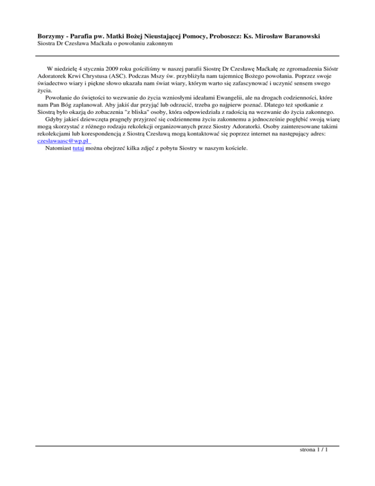 Borzymy - Parafia pw. Matki Bożej Nieustającej Pomocy, Proboszcz: Ks. Mirosław Baranowski Siostra Dr Czesława Maćkała o powołaniu zakonnym W niedzielę 4 stycznia 2009 roku gościliśmy w naszej parafii Siostrę Dr Czesławę Maćkałę ze zgromadzenia Sióstr Adoratorek Krwi Chrystusa (ASC). Podczas Mszy św. przybliżyła nam tajemnicę Bożego powołania. Poprzez swoje świadectwo wiary i piękne słowo ukazała nam świat wiary, którym warto się zafascynować i uczynić sensem swego życia. Powołanie do świętości to wezwanie do życia wzniosłymi ideałami Ewangelii, ale na drogach codzienności, które nam Pan Bóg zaplanował. Aby jakiś dar przyjąć lub odrzucić, trzeba go najpierw poznać. Dlatego też spotkanie z Siostrą było okazją do zobaczenia "z bliska" osoby, która odpowiedziała z radością na wezwanie do życia zakonnego. Gdyby jakieś dziewczęta pragnęły przyjrzeć się codziennemu życiu zakonnemu a jednocześnie pogłębić swoją wiarę mogą skorzystać z różnego rodzaju rekolekcji organizowanych przez Siostry Adoratorki. Osoby zainteresowane takimi rekolekcjami lub korespondencją z Siostrą Czesławą mogą kontaktować się poprzez internet na następujący adres: [email protected] Natomiast tutaj można obejrzeć kilka zdjęć z pobytu Siostry w naszym kościele. strona 1 / 1