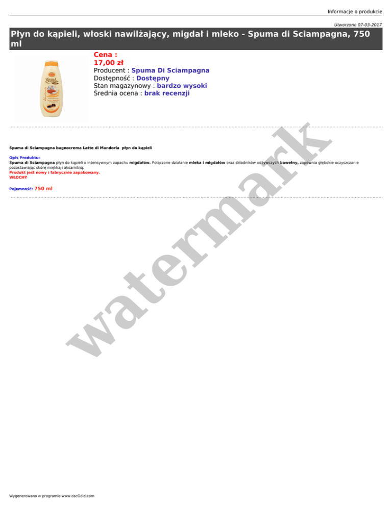 Informacje o produkcie Utworzono 07-03-2017 Płyn do kąpieli, włoski nawilżający, migdał i mleko - Spuma di Sciampagna, 750 ml Cena : 17,00 zł er m ar k Producent : Spuma Di Sciampagna Dostępność : Dostępny Stan magazynowy : bardzo wysoki Średnia ocena : brak recenzji Spuma di Sciampagna bagnocrema Latte di Mandorla płyn do kąpieli Opis Produktu: Spuma di Sciampagna płyn do kąpieli o intensywnym zapachu migdałów. Połączone działanie mleka i migdałów oraz składników odżywczych bawełny, zapewnia głębokie oczyszczanie pozostawiając skórę miękką i aksamitną. Produkt jest nowy i fabrycznie zapakowany. WŁOCHY 750 ml w at Pojemność: Wygenerowano w programie www.oscGold.com