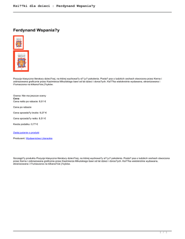 Ksi??ki dla dzieci : Ferdynand Wspania?y Ferdynand Wspania?y Pozycja klasyczna literatury dzieci?cej, na której wychowa?y si? ju? pokolenia. Posta? psa o ludzkich cechach stworzona przez Kerna i zobrazowana graficznie przez Kazimierza Mikulskiego bawi od lat dzieci i doros?ych. Ksi??ka wielokrotnie wydawana, ekranizowana i t?umaczona na kilkana?cie j?zyków. Ocena: Nie ma jeszcze oceny Cena Cena netto po rabacie: 8,51 € Cena po rabacie Cena sprzeda?y brutto: 9,27 € Cena sprzeda?y netto: 8,51 € Kwota podatku: 0,77 € Zadaj pytanie o produkt Producent: Wydawnictwo Literackie Szczegó?y produktu Pozycja klasyczna literatury dzieci?cej, na której wychowa?y si? ju? pokolenia. Posta? psa o ludzkich cechach stworzona przez Kerna i zobrazowana graficznie przez Kazimierza Mikulskiego bawi od lat dzieci i doros?ych. Ksi??ka wielokrotnie wydawana, ekranizowana i t?umaczona na kilkana?cie j?zyków. 1 / 1 Powered by TCPDF (www.tcpdf.org)