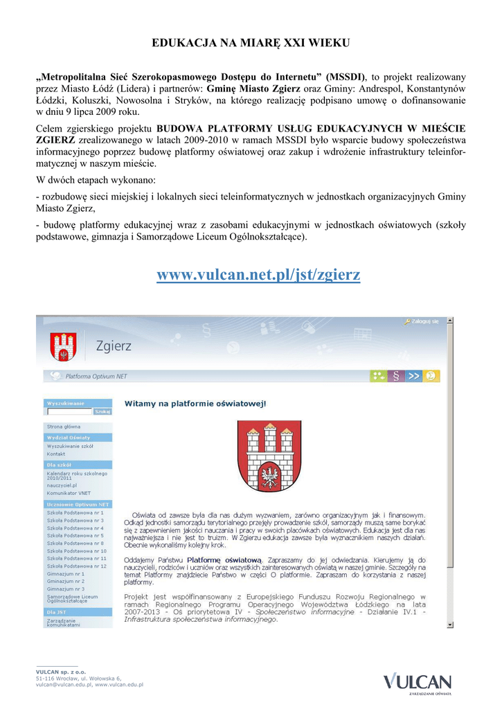 EDUKACJA NA MIARĘ XXI WIEKU „Metropolitalna Sieć Szerokopasmowego Dostępu do Internetu” (MSSDI), to projekt realizowany przez Miasto Łódź (Lidera) i partnerów: Gminę Miasto Zgierz oraz Gminy: Andrespol, Konstantynów Łódzki, Koluszki, Nowosolna i Stryków, na którego realizację podpisano umowę o dofinansowanie w dniu 9 lipca 2009 roku. Celem zgierskiego projektu BUDOWA PLATFORMY USŁUG EDUKACYJNYCH W MIEŚCIE ZGIERZ zrealizowanego w latach 2009-2010 w ramach MSSDI było wsparcie budowy społeczeństwa informacyjnego poprzez budowę platformy oświatowej oraz zakup i wdrożenie infrastruktury teleinformatycznej w naszym mieście. W dwóch etapach wykonano: - rozbudowę sieci miejskiej i lokalnych sieci teleinformatycznych w jednostkach organizacyjnych Gminy Miasto Zgierz, - budowę platformy edukacyjnej wraz z zasobami edukacyjnymi w jednostkach oświatowych (szkoły podstawowe, gimnazja i Samorządowe Liceum Ogólnokształcące). www.vulcan.net.pl/jst/zgierz VULCAN sp. z o.o. 51-116 Wrocław, ul. Wołowska 6, [email protected], www.vulcan.edu.pl Platforma Optivum NET wraz z systemem prowadzenia dokumentacji szkolnej Uczniowie Optivum NET, platformą edukacyjną Fronter oraz zasobami edukacyjnymi Nauczyciel.pl stworzyła kompleksowe rozwiązanie internetowe wspomagające zarządzanie oświatą na terenie Miasta Zgierz. Jest efektywnym narzędziem, za pomocą którego dostęp do informacji oświatowej (stosownie do nadanych uprawnień) mają: pracownicy samorządu, pracownicy podległych jednostek oświatowych, uczniowie i kandydaci do szkół, rodzice, wszyscy mieszkańcy. Platforma Optivum NET posiada część publiczną dostępną dla wszystkich użytkowników oraz część, do której dostęp możliwy jest po zalogowaniu się przez użytkowników. W zależności od przyznanej roli, użytkownik może mieć dostęp do wszystkich bądź wybranych funkcji i aplikacji platformy. W skład Platformy Optivum NET wchodzą następujące elementy: Rejestr szkół – pozwalający na zaprezentowanie standaryzowanych informacji o wszystkich jednostkach oświatowych znajdujących się na terenie podległym samorządowi. Komunikator VNET – wspierający zarządzanie komunikacją inicjowaną ze strony JST oraz kontrolę realizacji zadań stawianych przed konkretnymi grupami pracowników jednostek oświatowych. System zarządzania treścią – dający możliwość niezwykłe łatwego redagowania treści portalu wprost w przeglądarce internetowej przez uprawnionego redaktora, od którego nie jest wymagana specjalna wiedza informatyczna. Podstawowe funkcje platformy to: niezwykle łatwe redagowanie i publikowanie treści, a także możliwość przeszukiwania zawartości portalu, administrowanie modułem komunikacji pomiędzy organem prowadzącym a szkołami, a także odczytywanie komunikatów i reagowanie na nie (od strony użytkowników w szkołach), prowadzenie i publiczne udostępnianie rejestru szkół, wywoływanie aplikacji zewnętrznych zintegrowanych z Platformą Optivum NET takich jak: Uczniowie Optivum NET – internetowy system zarządzania informacją o uczniu, Platforma edukacyjna Fronter – połączenie łatwych w użyciu narzędzi do nauki i współpracy w trybie online, Nauczyciel.pl – multimedialne materiały edukacyjne dostępne za pomocą przeglądarki internetowej. VULCAN sp. z o.o. 51-116 Wrocław, ul. Wołowska 6, [email protected], www.vulcan.edu.pl UCZNIOWIE OPTIVUM NET Uczniowie Optivum NET to w pełni internetowy system zarządzania informacją o uczniach. Narzędzie przeznaczone dla dyrektora, sekretarza szkoły, nauczycieli, pedagogów oraz rodziców i uczniów. Uczniowie Optivum NET jest systemem zintegrowanym - oznacza to między innymi, że po wprowadzeniu danych są one dostępne dla wszystkich uprawnionych użytkowników. Jest to również system internetowy - użytkownicy mogą pracować na nim o każdej porze, nie tylko w szkole, ale w każdym miejscu, z którego mają dostęp do sieci. Uczniowie Optivum NET to narzędzie, które: usprawnia i przyspiesza pracę sekretariatu, ułatwia dyrektorowi zapanowanie nad procesami i dokumentami w szkole, angażuje rodziców i ucznia w proces edukacyjny poprzez dostęp do dokumentacji szkolnej dotyczącej dziecka, daje wychowawcy więcej informacji o wychowankach i więcej czasu na wychowywanie, uczy dzieci samodzielności, wyposaża nauczycieli w narzędzie wspierające ocenianie kształtujące. VULCAN sp. z o.o. 51-116 Wrocław, ul. Wołowska 6, [email protected], www.vulcan.edu.pl W skład pakietu oprogramowania Uczniowie Optivum NET wchodzą między innymi: Dziennik lekcyjny Optivum NET, który pełni wszystkie określone prawem funkcje papierowego dziennika lekcyjnego. Sekretariat Optivum NET – program ułatwiający zbieranie oraz przechowywanie w postaci elektronicznej danych o uczniach. Moduł analiz – rozwiązanie dedykowane dla dyrektora, wspomagające analizę i ocenę procesów zachodzących w szkole. Witryna dla rodziców/uczniów gwarantująca bieżący dostęp do spójnych i aktualnych danych o postępach dziecka w nauce. --- Za pomocą DZIENNIKA LEKCYJNEGO Optivum NET nauczyciele mogą rejestrować: obecności uczniów na zajęciach, tematy lekcji w powiązaniu z rozkładami materiału nauczania, oceny cząstkowe (każda ocena może być przez nauczyciela indywidualnie opisana), oceny klasyfikacyjne, oceny z zachowania, skategoryzowane uwagi o zachowaniu uczniów. Program umożliwia również: drukowanie świadectw, przygotowywanie oraz drukowanie kartek na wywiadówkę, komunikację z rodzicami za pomocą wbudowanego komunikatora, sporządzanie oraz drukowanie szablonów korespondencji (korespondencja seryjna). Oprogramowanie posiada również wbudowany moduł służący do komunikacji z rodzicami czy uczniami szkoły. VULCAN sp. z o.o. 51-116 Wrocław, ul. Wołowska 6, [email protected], www.vulcan.edu.pl --SEKRETARIAT Optivum NET ułatwia: projektowanie organizacji roku szkolnego, prowa