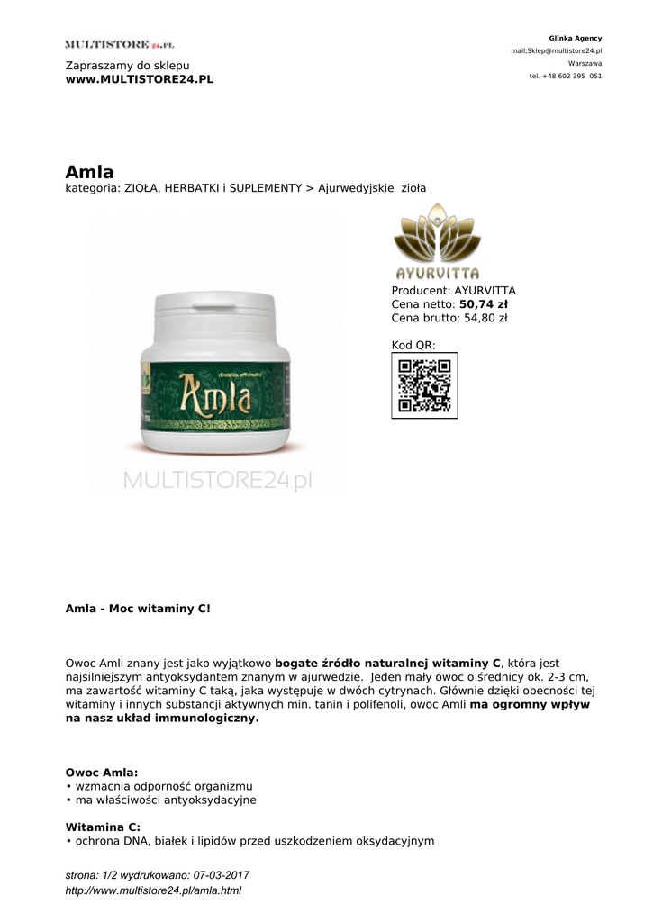 Glinka Agency mail;[email protected] Zapraszamy do sklepu www.MULTISTORE24.PL Warszawa tel. +48 602 395 051 Amla kategoria: ZIOŁA, HERBATKI i SUPLEMENTY > Ajurwedyjskie zioła Producent: AYURVITTA Cena netto: 50,74 zł Cena brutto: 54,80 zł Kod QR: Amla - Moc witaminy C! Owoc Amli znany jest jako wyjątkowo bogate źródło naturalnej witaminy C, która jest najsilniejszym antyoksydantem znanym w ajurwedzie. Jeden mały owoc o średnicy ok. 2-3 cm, ma zawartość witaminy C taką, jaka występuje w dwóch cytrynach. Głównie dzięki obecności tej witaminy i innych substancji aktywnych min. tanin i polifenoli, owoc Amli ma ogromny wpływ na nasz układ immunologiczny. Owoc Amla: • wzmacnia odporność organizmu • ma właściwości antyoksydacyjne Witamina C: • ochrona DNA, białek i lipidów przed uszkodzeniem oksydacyjnym strona: 1/2 wydrukowano: 07-03-2017 http://www.multistore24.pl/amla.html Dawkowanie: 1 gram 3 x dziennie w formie sproszkowanej, popijając ciepłą wodą. Przeciwwskazania: Zatrucie organizmu toksynami Informacje dodatkowe: Przechowywać w temperaturze pokojowej, w suchym miejscu. Stosować kilka tygodni lub dłużej dla osiągnięcia pożądanego efektu terapeutycznego. Stosowanie naturalnych produktów daje stopniowy, ale długotrwały efekt. Bez dodatku konserwantów! Wyprodukowano w Indiach Skład: Amla 100% (Emblica officinalis) w postaci proszku Zawartość netto: 100 gram PROSIMY NIE ŁACZYĆ ZAMÓWIENIA Z INNYMI PRODUKTAMI W JEDNYM ZAMÓWIENIU MOGĄ BYĆ TYLKO PRODUKTY PRODUCENTA AYURVITTA strona: 2/2 wydrukowano: 07-03-2017 http://www.multistore24.pl/amla.html