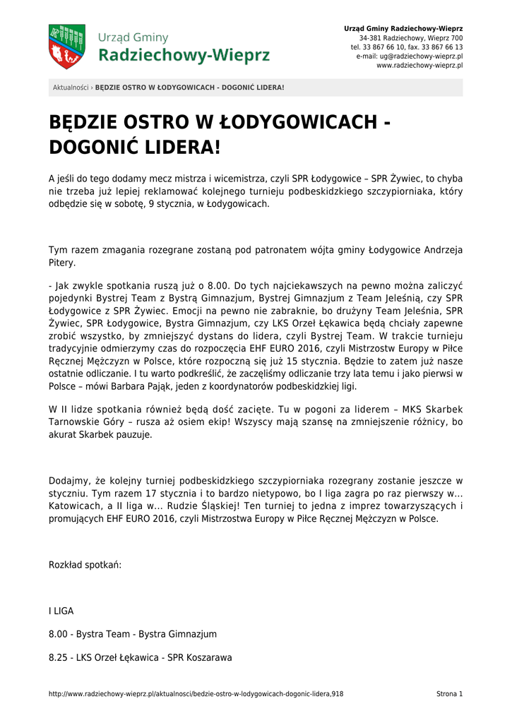 Urząd Gminy Radziechowy-Wieprz 34-381 Radziechowy, Wieprz 700 tel. 33 867 66 10, fax. 33 867 66 13 e-mail: [email protected] www.radziechowy-wieprz.pl Aktualności › BĘDZIE OSTRO W ŁODYGOWICACH - DOGONIĆ LIDERA! BĘDZIE OSTRO W ŁODYGOWICACH DOGONIĆ LIDERA! A jeśli do tego dodamy mecz mistrza i wicemistrza, czyli SPR Łodygowice – SPR Żywiec, to chyba nie trzeba już lepiej reklamować kolejnego turnieju podbeskidzkiego szczypiorniaka, który odbędzie się w sobotę, 9 stycznia, w Łodygowicach. Tym razem zmagania rozegrane zostaną pod patronatem wójta gminy Łodygowice Andrzeja Pitery. - Jak zwykle spotkania ruszą już o 8.00. Do tych najciekawszych na pewno można zaliczyć pojedynki Bystrej Team z Bystrą Gimnazjum, Bystrej Gimnazjum z Team Jeleśnią, czy SPR Łodygowice z SPR Żywiec. Emocji na pewno nie zabraknie, bo drużyny Team Jeleśnia, SPR Żywiec, SPR Łodygowice, Bystra Gimnazjum, czy LKS Orzeł Łękawica będą chciały zapewne zrobić wszystko, by zmniejszyć dystans do lidera, czyli Bystrej Team. W trakcie turnieju tradycyjnie odmierzymy czas do rozpoczęcia EHF EURO 2016, czyli Mistrzostw Europy w Piłce Ręcznej Mężczyzn w Polsce, które rozpoczną się już 15 stycznia. Będzie to zatem już nasze ostatnie odliczanie. I tu warto podkreślić, że zaczęliśmy odliczanie trzy lata temu i jako pierwsi w Polsce – mówi Barbara Pająk, jeden z koordynatorów podbeskidzkiej ligi. W II lidze spotkania również będą dość zacięte. Tu w pogoni za liderem – MKS Skarbek Tarnowskie Góry – rusza aż osiem ekip! Wszyscy mają szansę na zmniejszenie różnicy, bo akurat Skarbek pauzuje. Dodajmy, że kolejny turniej podbeskidzkiego szczypiorniaka rozegrany zostanie jeszcze w styczniu. Tym razem 17 stycznia i to bardzo nietypowo, bo I liga zagra po raz pierwszy w... Katowicach, a II liga w... Rudzie Śląskiej! Ten turniej to jedna z imprez towarzyszących i promujących EHF EURO 2016, czyli Mistrzostwa Europy w Piłce Ręcznej Mężczyzn w Polsce. Rozkład spotkań: I LIGA 8.00 - Bystra Team - Bystra Gimnazjum 8.25 - LKS Orzeł Łękawica - SPR Koszarawa http://www.radziechowy-wieprz.pl/aktualnosci/bedzie-ostro-w-lodygowicach-dogonic-lidera,918 Strona 1 Urząd Gminy Radziechowy-Wieprz 34-381 Radziechowy, Wieprz 700 tel. 33 867 66 10, fax. 33 867 66 13 e-mail: [email protected] www.radziechowy-wieprz.pl Aktualności › BĘDZIE OSTRO W ŁODYGOWICACH - DOGONIĆ LIDERA! 8.50 - Bystra Gimnazjum - Team Jeleśnia 9.15 - Bystra Team - SPR Koszarawa 9.40 - SPR Twardorzeczka - Team Jeleśnia 10.05 - SPR Łodygowice - SPR Żywiec 10.30 - Bystra Team - SPR Twardorzeczka 10.55 - SPR Łodygowice - LKS Orzeł Łękawica 11.20 - SPR Żywiec - SPR Twardorzeczka PAUZUJĄ: TS Metal Węgierska Górka, UKS Imperium Katowice i Ujsoły. II LIGA 12.00 - SPR Milówka - PTG Sokół w Gminie Czernichów I 12.25 - SPR Twardorzeczka II - Iskra Zawiercie 13.00 – Oficjalne rozpoczęcie turnieju i ostatnie odmierzanie czasu do EHF EURO 2016 13.20 - SPR Milówka - PKS Olimpijczyk Gilowice 13.45 - Iskra Zawiercie - PTG Sokół w Gminie Czernichów II 14.10 - PTG Sokół w Gminie Czernichów I - SPR Twardorzeczka II 14.35 - Iskra Zawiercie - SPR Wieprz 15.00 - PTG Sokół w Gminie Czernichów II - PKS Olimpijczyk Gilowice 15.25 - SPR Wieprz - SPR Milówka 15.45 - PTG Sokół w Gminie Czernichów II - SPR Twardorzeczka II 16.10 - SPR Wieprz - PTG Sokół w Gminie Czernichów I 16.35 - Iskra Zawiercie – SPR Milówka II 17.00 - SPR Milówka – SPR Milówka II PAUZUJĄ: Gimnazjum Łękawica, MKS Skarbek Tarnowskie Góry, SPR Ślemień i SPR Świnna. http://www.radziechowy-wieprz.pl/aktualnosci/bedzie-ostro-w-lodygowicach-dogonic-lidera,918 Strona 2 Urząd Gminy Radziechowy-Wieprz 34-381 Radziechowy, Wieprz 700 tel. 33 867 66 10, fax. 33 867 66 13 e-mail: [email protected] www.radziechowy-wieprz.pl Aktualności › BĘDZIE OSTRO W ŁODYGOWICACH - DOGONIĆ LIDERA! Podbeskidzka Liga Amatorska Piłki Ręcznej Dziewcząt rozgrywana jest pod honorowymi patronatami: Związku Piłki Ręcznej w Polsce Śląskiego Związku Piłki Ręcznej w Katowicach Marszałka Województwa Śląskiego Wojciecha Saługi Starosty Żywieckiego Andrzeja Kalaty Główny Sponsor – Partner Podbeskidzkiej Ligi Amatorskiej Piłki Ręcznej Dziewcząt: * Dom Wczasów Dziecięcych w Soblówce Oficjalnymi sponsorami Podbeskidzkiej Ligi Amatorskiej Piłki Ręcznej Dziewcząt są: * Niepubliczne Liceum Ogólnokształcące Szkoła Mistrzostwa Sportowego Sportów Olimpijskich w Żywcu * Firma Eurofirany z Żywca * Stowarzyszenie Przedsiębiorców Ziemi Żywieckiej w Żywcu * Firma Żywiec Zdrój * Biuro Rachunkowe Fiskus Wiesław Sypta z Tresnej * Centrum Wypoczynku ODYS w Tresnej koło Żywca Działalność Podbeskidzkiej Ligi Amatorskiej Piłki Ręcznej Dziewcząt i część drużyn dofinansowana jest z budżetów: Urzędu Gminy Lipowa, Urzędu Gminy Łodygowice, Urzędu Gminy Ślemień, Urzędu Gminy Milówka, Starostwa Powiatowego w Żywcu, Urzędu Gminy Koszarawa, Urzędu Miejskiego w Żywcu, Urzędu Gminy Radziechowy-Wieprz i Urzędu Gminy Świnna, a także Urzędu Miasta Katowice. http://www.radziechowy-wieprz.pl/aktualnosci/bedzie-ostro-w-lodygowicach-dogonic-lidera,918 Strona 3 Urząd Gminy Radziechowy-Wieprz 34-381 Radziechowy, Wieprz 700 tel. 33 867 66 10, fax. 33 867 66 13 e-mail: [email protected] www.radziechowy-wieprz.pl Aktualności › BĘDZIE OSTRO W ŁODYGOWICACH - DOGONIĆ LIDERA! Patronat medialny nad Podbeskidzką Ligą Amatorską Piłki Ręcznej Dziewcząt sprawują: Portal Sportowe Beskidy – www.sportowebeskidy.pl Portal Beskidzka24.pl – www.beskidzka24.pl Tygodnik “Kronika Beskidzka” – www.kronika.beskidzka.pl Portal Sportowy Żywiec - www.sportowyzywiec.pl Portal Śląski Sport – www.sportslaski.pl Portal Żywiec Sport – www.zywiecsport.pl Portal Super Nowa – www.super-nowa.pl Portal Media Podbeskidzie – www.media-podbeskidzie.pl http://www.radziechowy-wieprz.pl/aktualnosci/bedzie