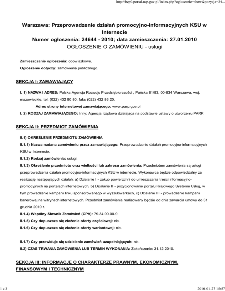 1z3 http://bzp0.portal.uzp.gov.pl/index.php?ogloszenie=show&pozycja=24... Warszawa: Przeprowadzenie działań promocyjno-informacyjnych KSU w Internecie Numer ogłoszenia: 24644 - 2010; data zamieszczenia: 27.01.2010 OGŁOSZENIE O ZAMÓWIENIU - usługi Zamieszczanie ogłoszenia: obowiązkowe. Ogłoszenie dotyczy: zamówienia publicznego. SEKCJA I: ZAMAWIAJĄCY I. 1) NAZWA I ADRES: Polska Agencja Rozwoju Przedsiębiorczości , Pańska 81/83, 00-834 Warszawa, woj. mazowieckie, tel. (022) 432 80 80, faks (022) 432 86 20. Adres strony internetowej zamawiającego: www.parp.gov.pl I. 2) RODZAJ ZAMAWIAJĄCEGO: Inny: Agencja rządowa działająca na podstawie ustawy o utworzeniu PARP. SEKCJA II: PRZEDMIOT ZAMÓWIENIA II.1) OKREŚLENIE PRZEDMIOTU ZAMÓWIENIA II.1.1) Nazwa nadana zamówieniu przez zamawiającego: Przeprowadzenie działań promocyjno-informacyjnych KSU w Internecie. II.1.2) Rodzaj zamówienia: usługi. II.1.3) Określenie przedmiotu oraz wielkości lub zakresu zamówienia: Przedmiotem zamówienia są usługi przeprowadzenia działań promocyjno-informacyjnych KSU w internecie. Wykonawca będzie odpowiedzialny za realizację następujących działań: a) Działanie I - zakup powierzchni do umieszczania treści informacyjnopromocyjnych na portalach internetowych, b) Działanie II - pozycjonowanie portalu Krajowego Systemu Usług, w tym prowadzenie kampanii linku sponsorowanego w wyszukiwarkach, c) Działanie III - prowadzenie kampanii banerowej na witrynach internetowych. Przedmiot zamówienia realizowany będzie od dnia zawarcia umowy do 31 grudnia 2010 r. II.1.4) Wspólny Słownik Zamówień (CPV): 79.34.00.00-9. II.1.5) Czy dopuszcza się złoŜenie oferty częściowej: nie. II.1.6) Czy dopuszcza się złoŜenie oferty wariantowej: nie. II.1.7) Czy przewiduje się udzielenie zamówień uzupełniających: nie. II.2) CZAS TRWANIA ZAMÓWIENIA LUB TERMIN WYKONANIA: Zakończenie: 31.12.2010. SEKCJA III: INFORMACJE O CHARAKTERZE PRAWNYM, EKONOMICZNYM, FINANSOWYM I TECHNICZNYM 2010-01-27 15:57 2z3 http://bzp0.portal.uzp.gov.pl/index.php?ogloszenie=show&pozycja=24... III.1) WARUNKI DOTYCZĄCE ZAMÓWIENIA III.2) WARUNKI UDZIAŁU Opis warunków udziału w postępowaniu oraz opis sposobu dokonywania oceny spełniania tych warunków: 1.O udzielenie zamówienia mogą się ubiegać wykonawcy, którzy spełniają następujące warunki: 1) posiadają uprawnienia do wykonywania określonej działalności lub czynności, jeŜeli przepisy prawa nakładają obowiązek ich posiadania; 2) posiadają niezbędną wiedzę i doświadczenie, tj: a) w okresie ostatnich 3 lat przed dniem składania ofert, a jeŜeli okres prowadzenia działalności jest krótszy w tym okresie, wykonali naleŜycie co najmniej 2 kampanie promocyjne portalu internetowego za pomocą Internetu, z czego: i. co najmniej jedna kampania trwała nieprzerwanie co najmniej 1 rok, ii. co najmniej jedna kampania miała wartość 200 000 zł brutto (a w przypadku, jeŜeli wartość usługi została wyraŜona w walucie obcej - wyraŜona w złotych równowartość kwoty nie mniejszej niŜ 200 000 złotych brutto wg średniego kursu NBP z dnia zawarcia umowy o świadczenie usług) 3) dysponują odpowiednim potencjałem technicznym oraz osobami zdolnymi do wykonania zamówienia 4) znajdują się w sytuacji ekonomicznej i finansowej zapewniającej wykonanie zamówienia; 2.W przypadku Wykonawców wspólnie ubiegających się o udzielenie zamówienia, warunki określone w ust. 1 pkt 1) - 4) muszą zostać spełnione łącznie przez wszystkich Wykonawców.. Informacja o oświadczeniach i dokumentach, jakie mają dostarczyć wykonawcy w celu potwierdzenia spełniania warunków udziału w postępowaniu: 3.W celu potwierdzenia spełniania warunków, o których mowa w ust. 1, oraz w celu wykazania braku podstaw do wykluczenia z postępowania, wykonawca ma obowiązek złoŜyć następujące dokumenty: 1) oświadczenie o braku podstaw do wykluczenia z postępowania. JeŜeli Wykonawcy wspólnie ubiegają się o udzielenie zamówienia dokument ten składa kaŜdy z nich, 2) aktualny odpis z właściwego rejestru albo aktualne zaświadczenie o wpisie do ewidencji działalności gospodarczej, jeŜeli odrębne przepisy wymagają wpisu do rejestru lub zgłoszenia do ewidencji działalności gospodarczej, wystawione nie wcześniej niŜ 6 miesięcy przed upływem terminu składania ofert. JeŜeli Wykonawcy wspólnie ubiegają się o udzielenie zamówienia dokument ten składa kaŜdy z nich; 3) wypełnione i podpisane oświadczenie o spełnianiu warunków udziału w postępowaniu. JeŜeli Wykonawcy wspólnie ubiegają się o udzielenie zamówienia dokument ten mogą złoŜyć łącznie; 4) wykaz wykonanych w okresie ostatnich 3 lat przed upływem terminu składania ofert, a jeŜeli okres prowadzenia działalności jest krótszy - w tym okresie minimum 2 usług, o których mowa w ust. 1 pkt 2 lit. a) z podaniem ich wartości, przedmiotu, dat wykonania i odbiorców wraz z dokumentami potwierdzającymi, Ŝe usługi te zostały wykonane naleŜycie. JeŜeli Wykonawcy wspólnie ubiegają się o udzielenie zamówienia dokument ten składa przynajmniej jeden z nich. 4.JeŜeli Wykonawca ma siedzibę lub miejsce zamieszkania poza terytorium Rzeczypospolitej Polskiej, zamiast dokumentu, o których mowa w ust. 3 pkt 2) składa dokument lub dokumenty, wystawione w kraju, w którym ma siedzibę lub miejsce zamieszkania, potwierdzające, Ŝe nie otwarto jego likwidacji ani nie ogłoszono upadłości. 5. JeŜeli w kraju pochodzenia osoby lub w kraju, w którym Wykonawca ma siedzibę lub miejsce zamieszkania, nie wydaje się dokumentów, o których mowa w ust. 4, zastępuje się je dokumentem zawierającym oświadczenie złoŜone przed notariuszem, właściwym 2010-01-27 15:57 3z3 http://bzp0.portal.uzp.gov.pl/index.php?ogloszenie=show&pozycja=24... organem sądowym, administracyjnym albo organem samorządu zawodowego lub gospodarczego odpowiednio kraju pochodzenia osoby lub kraju,