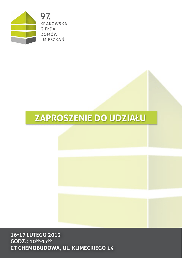 97. zaproszenie do udziału 16-17 lutego 2013 godz.: 1000-1700 ct chemobudowa, ul. klimeckiego 14 16-17 lutego ct chemobudowa TERMINARZ KOLEJNYCH GIEŁD W 2013 ROKU: SZANOWNI PAŃSTWO, Zarząd Stowarzyszenia Budowniczych Domów i Mieszkań ma przyjemność zaprosić Państwa do udziału w wyjątkowym wydarzeniu w branży mieszkaniowej, jakim jest 97. Krakowska Giełda Domów i Mieszkań. Poprzez uczestnictwo w giełdzie włączacie się Państwo w historię najstarszych w Polsce i najbardziej znaczących w Krakowie targów mieszkaniowych. ›› ›› ›› ›› 06-07 kwietnia 18-19 maja 07-08 września 23-24 listopada TARGI Z TRADYCJĄ W NOWYM MIEJSCU Już od piętnastu lat jesteśmy organizatorami giełd mieszkaniowych, dostarczając dzięki Państwu szeroką ofertę mieszkań w każdym segmencie. Podczas każdej edycji naszą imprezę odwiedza liczna rzesza zainteresowanych klientów, mając możliwość zapoznania się z bogatym wachlarzem oferty kilkudziesięciu firm (w ostatnich edycjach uczestniczyło średnio około sześćdziesięciu wystawców). Pragnąc sprostać Państwa wysokim wymaganiom i dążąc do jak najwyższego komfortu zarówno dla Państwa, jak i dla klientów, od 2013 roku przenosimy imprezy giełdowe z dotychczasowej lokalizacji – Hali Sokoła – do Centrum Targowego Chemobudowa, mieszczącego się przy ul. Klimeckiego 14. Atutami tego miejsca są: obszerna powierzchnia wystawiennicza, dostępny dla każdego parking oraz dogodna komunikacja dla klientów z każdej części miasta. SBDIM POLEPSZA JAKOŚĆ ŻYCIA KRAKOWIAN Stowarzyszenie Budowniczych Domów i Mieszkań, działając na rzecz rozwoju przyjaznego dla mieszkańców budownictwa, promuje nowoczesne rozwiązania architektoniczne i urbanistyczne oraz premiuje innowacyjne produkty i technologie. Poprzez Krakowskie Giełdy Domów i Mieszkań Stowarzyszenie aranżuje przyjazne warunki do prezentowania aktualnej oferty mieszkaniowej Krakowa i okolic, ale również tworzy platformę do wymiany poglądów dotyczących rynku mieszkaniowego pomiędzy przedstawicielami władz miasta, mediami, przedsiębiorcami, projektantami i instytucjami finansowymi. CO NAS WYRÓZNIA NA RYNKU Skupiając liczną rzeszę krakowskich deweloperów znamy rynek mieszkaniowy zarówno od potrzeb inwestorów, jak i klientów. Przeprowadzamy analizy mieszkaniowe, śledzimy trendy europejskie, próbujemy skutecznie pogodzić oferty deweloperów z oczekiwaniami klientów. Zainteresowanych naszymi działaniami zapraszamy do odwiedzenia naszej strony www.sbdim.pl. 30-001 Kraków, ul. Kamienna 19, tel/fax: (12) 630 17 57, [email protected], www.sbdim.pl 16-17 lutego ct chemobudowa TERMINARZ KOLEJNYCH GIEŁD W 2013 ROKU: ›› ›› ›› ›› 06-07 kwietnia 18-19 maja 07-08 września 23-24 listopada zadbamy o skuteczną promocję Z nami macie Państwo pewność, że informacja o Giełdzie i Państwa ofercie targowej dotrze do zainteresowanych klientów. Targom towarzyszą wielopłaszczyznowe działania reklamowe prowadzone w prasie, radio, internecie i na licznych nośnikach zewnętrznych. formy reklam: 1. Wielkoformatowe billboardy na terenie miasta - 50 szt. 2. Videoboardy - 14 szt. 3. Plakaty - 400 szt. 4. Reklama na okładce Krakowskiego Rynku Nieruchomości 5. Ogłoszenia i informacje w prasie branżowej i regionalnej (Dziennik Polski, Gazeta Krakowska, Gazeta Wyborcza, Krakowski Rynek Nieruchomości, Małopolski Przegląd Nieruchomości) 6. Ogłoszenia radiowe w Radio Złote Przeboje i RoxyFM 7. Informacja na portalach internetowych (dominium.pl; kgm.pl; krn.pl; nportal; sbdim.pl; trader.pl; wkrakowie.pl) 8. Reklama planszowa na ogrodzeniu Centrum Targowego Chemobudowa Wielkoformatowe billboardy Plakaty 30-001 Kraków, ul. Kamienna 19, tel/fax: (12) 630 17 57, [email protected], www.sbdim.pl 16-17 lutego ct chemobudowa TERMINARZ KOLEJNYCH GIEŁD W 2013 ROKU: ›› ›› ›› ›› 06-07 kwietnia 18-19 maja 07-08 września 23-24 listopada cennik giełdowy a B stoiska »» a1 A1. powierzchnia wystawiennicza NIEZABUDOWANA ›› ›› ›› ›› Firmy deweloperskie i finansowe zrzeszone w SBDiM ............................................................................................. 400 zł/m2 Firmy deweloperskie i finansowe niezrzeszone w SBDiM ....................................................................................... 500 zł/m2 Architekci, projektanci wnętrz ............................................................................................................................................ 250 zł/m2 Producenci, handlowcy, inni ................................................................................................................................................ 350 zł/m2 »» Aa2 2. zabudowa stoisk standard »» A3. a3 zabudowa stoisk premium ................................................................................................................................. 80 zł/m2 ............................................................................................................................od 220 zł/m2 KATALOG TARGOWY (w nowym formacie A4) ›› prezentacja inwestycji firmy wystawiającej się (według przyjętego schematu) ................................................... 0 zł ›› prezentacja kolejnej inwestycji firmy wystawiającej się (według przyjętego schematu) ............................ 200 zł ›› jedna strona reklamy dowolnej dla wystawcy .................................................................................................................... 500 zł ›› Jedna strona reklamy dla firmy nie uczestniczącej w targach .................................................................................... 1000 zł ›› reklama na drugiej okładce ....................................................................................................................................................... 1300 zł ›› Reklama na trzeciej okładce .
