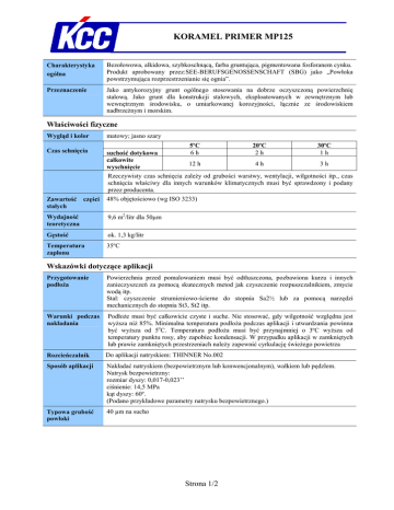 KORAMEL PRIMER MP125 Charakterystyka ogólna Bezołowowa, alkidowa, szybkoschnącą, farba gruntująca, pigmentowana fosforanem cynku. Produkt aprobowany przez:SEE-BERUFSGENOSSENSCHAFT (SBG) jako „Powłoka powstrzymująca rozprzestrzenianie się ognia”. Przeznaczenie Jako antykorozyjny grunt ogólnego stosowania na dobrze oczyszczoną powierzchnię stalową. Jako grunt dla konstrukcji stalowych, eksploatowanych w zewnętrznym lub wewnętrznym środowisku, o umiarkowanej korozyjności, łącznie ze środowiskiem nadbrzeŜnym i morskim. Właściwości fizyczne Wygląd i kolor Czas schnięcia Zawartość stałych części matowy; jasno szary 5ºC 20ºC 30ºC 6h 2h 1h suchość dotykowa całkowite 12 h 4h 3h wyschnięcie Rzeczywisty czas schnięcia zaleŜy od grubości warstwy, wentylacji, wilgotności itp., czas schnięcia właściwy dla innych warunków klimatycznych musi być sprawdzony i podany przez producenta. 48% objętościowo (wg ISO 3233) Wydajność teoretyczna 9,6 m2/litr dla 50µm Gęstość ok. 1,3 kg/litr Temperatura zapłonu 35ºC Wskazówki dotyczące aplikacji Przygotowanie podłoŜa Powierzchnia przed pomalowaniem musi być odtłuszczona, pozbawiona kurzu i innych zanieczyszczeń za pomocą skutecznych metod jak czyszczenie rozpuszczalnikiem, zmycie wodą itp. Stal: czyszczenie strumieniowo-ścierne do stopnia Sa2½ lub za pomocą narzędzi mechanicznych do stopnia St3, St2 itp. Warunki podczas nakładania PodłoŜe musi być całkowicie czyste i suche. Nie stosować, gdy wilgotność względna jest wyŜsza niŜ 85%. Minimalna temperatura podłoŜa podczas aplikacji i utwardzania powinna być wyŜsza od 5oC. Temperatura podłoŜa musi być przynajmniej o 3ºC wyŜsza od temperatury punktu rosy, aby zapobiec kondensacji. W przypadku aplikacji w zamkniętych lub prawie zamkniętych przestrzeniach naleŜy zapewnić cyrkulację świeŜego powietrza Rozcieńczalnik Do aplikacji natryskiem: THINNER No.002 Sposób aplikacji Nakładać natryskiem (bezpowietrznym lub konwencjonalnym), wałkiem lub pędzlem. Natrysk bezpowietrzny: rozmiar dyszy: 0,017-0,023’’ ciśnienie: 14,5 MPa kąt dyszy: 60º. (Podano przykładowe parametry natrysku bezpowietrznego.) Typowa grubość powłoki 40 µm na sucho Strona 1/2 KORAMEL PRIMER MP125 Interwał czasowy do nakładania następnych powłok W temperaturze 20oC: Minimalny: 8 h, Maksymalny: Nieograniczony. Przed aplikacją następnej powłoki naleŜy usunąć z powierzchni: zatłuszczenia, sole, produkty kredowania i inne zanieczyszczenia starej, sezonowanej powłoki poprzez dokładne czyszczenie rozpuszczalnikiem lub mycie bieŜącą wodą. Następne powłoki z farb KORAMEL UNDERCOATING LU216, KORAMEL ENAMEL LT313, LT 315 lub innych zgodnie ze specyfikacją. Okres przechowywania 12 miesięcy Odporność na temperaturę Ekspozycja ciągła: 93ºC (nie dotyczy ekspozycji w zanurzeniu) Działanie periodyczne: 121ºC (nie dotyczy ekspozycji w zanurzeniu) Odporność chemiczna Rozprysk, zwilŜanie Opary Zanurzenie Opakowanie BHP Data wydania Kwasy Zasady Rozpuszczalniki Woda morska Woda bieŜąca Nie zalecane Nie zalecane Nie zalecane Dobra Doskonała Słaba Słaba Słaba Zadowalająca Doskonała Nie zalecane Nie zalecane Nie zalecane Nie zalecane Nie zalecane 18 l. Zabezpieczyć skórę i oczy a takŜe zapobiegać wdychaniu oparów poprzez właściwą wentylację. W wypadku aplikacji w pomieszczeniach kiepsko wentylowanych zaleca się stosowanie dodatkowo środków ochrony osobistej dróg oddechowych. Przechowywać z dala od źródła iskier i otwartego ognia. Kwiecień 2008 Informacje zawarte w karcie technicznej zostały podane na podstawie badań laboratoryjnych i mogą nieznacznie odbiegać od stanu faktycznego dla danej partii produkcyjnej. Zalecamy posługiwanie się nimi jako wskaźnikami natury ogólnej. Wszystkie zalecenia dotyczące stosowania produktów są opracowane dla osób o odpowiedniej wiedzy technicznej, zostały oparte o aktualny stan wiedzy i są wiarygodne. Producent i sprzedawca nie ma wpływu na jakość aplikacji, stan powierzchni, warunków aplikacji oraz innych czynników mających wpływ na jakość powłoki. W związku z powyŜszym producent ani sprzedawca nie ponoszą odpowiedzialności za straty i szkody spowodowane zastosowaniem produktu. Karta katalogowa moŜe ulec zmianie bez powiadomienia. Przed aplikacją produktu w obowiązku uŜytkownika jest upewnienie się co do aktualności karty technicznej. Strona 2/2