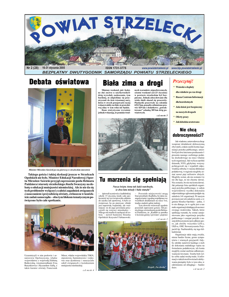 Debata owiatowa Bia³a zima a drogi Miniony weekend, jak i kolej- nych warunków atmosferycznych, dróg wywo³a³y zaskoczenie, tym w powiecie strzeleckim by³ bez- ne dni znowu u u¿ytkowników bardziej, ¿e zd¹¿ylimy siê przy- zwyczaiæ do icie wiosennej aury, która w swych przejawach raczej wskazywa³aby na fakt, ¿e prawdzi- * pieczny. Jednak zdecydowanie dla * Rusza Centrum Informacji * Jaki dzieñ jest bezpieczny * Oferty pracy * Jak ³abedzia uratowano wielu s³u¿b okaza³ siê pracowity. dla bezrobotnych Piaskarki pracowa³y na odcinku 632,5 km, ponadto odnie¿ono pra- wie 429 km i dodatkowo potrak- jednak wskazuj¹, ¿e pomimo trud- wiatowych. towano solank¹ 309 km dróg po- c.d. na str. 5 Wnioski o dop³aty dla rolników po raz drugi ostatni weekend (22-23 stycznia) wej zimy w tym roku nie bêdzie. Dane statystyczne wyranie Przeczytaj! na naszych drogach Nie chc¹ dobroczynnoci? Jak wiadomo, ustawodawca chc¹c wesprzeæ dzia³alnoæ dobroczynn¹ obywateli, a tak¿e zasiliæ konta organizacji po¿ytku publicznego, umo¿liwi³ ju¿ dwa lata temu przekazanie 1 procenta naszego osobistego podatku dochodowego na rzecz w³anie tych organizacji. Jak wylicza opolski dziennik, NTO, gdybymy wszyscy pofatygowali siê i wype³nili odpowiedni¹ rubrykê w naszej deklaracji Minister Miros³aw Sawicki po raz pierwszy w strzeleckim starostwie podatkowej, w regionie mog³oby zo- Takiego gocia i takiej dyskusji jeszcze w Strzelcach Tu marzenia siê spe³niaj¹ Opolskich nie by³o. Minister Edukacji Narodowej i Sportu Miros³aw Sawicki przyj¹³ zaproszenie pos³a Helmuta Padziora i starosty strzeleckiego Józefa Swaczyny na detych problemów wy³¹czyæ z ca³oci zagadnieñ zwi¹zanych z nauczaniem i przysz³oci¹ owiaty, zw³aszcza w kontekcie zadañ samorz¹du obu tym blokom tematycznym po- wiêcone by³o ca³e spotkanie. zacji po¿ytku publicznego, w ca³ym ¿e dwa lata minê³y i hala stanê³a - piewali uczniowie z kad³ubskiej szko³y 15 stycznia, kiedy ca³a spo³ecznoæ tej wsi wiêtowa³a oddanie województwie wysi³ku dokonania Pozosta³e miejscowoci mog¹ braæ przyk³ad z Kad³uba, bo takie za- anga¿owanie i zgodn¹ wspó³pracê we do u¿ytku sali sportowej. A by³o co wszelkich dzia³aniach na rzecz wsi, jest naprawdê wspania³y, ale wa¿- Tym s³owom wtórowali zgodnie wiêtowaæ, bo po pierwsze: obiekt trudno znaleæ gdzie indziej. niejsze: ¿e do jego powstania przy- pozostali zaproszeni gocie. Od po- Nikogo nie trzeba tu zachêcaæ do ro- ta Padziora, ¿e Kad³ub to pere³ka czynili siê wszyscy mieszkañcy. boty mówi³ burmistrz Strzelec Opolskich Krzysztof Fabianowski. nie dla tego, ¿e nie chcemy dawaæ. Nie zostanie, bo nie ma komu dawaæ. Jak pokazuje lista opolskich organi- Nasza wiêta Anna tak ludzi natchnê³a, batê o edukacji mniejszoci niemieckiej. Ale ¿e nie da siê staæ nawet piêæ milionów z³otych. Mog³oby zostaæ, ale nie zostanie i to etyckiego stwierdzenia pos³a Helmuw koronie gminy i powiatu, poprzez c.d. na str. 2 odpowiedniego zg³oszenia podjê³o siê zaledwie 141 organizacji. W naszym powiecie jest ich zaledwie szeæ, a w gminie Strzelce Opolskie jedna.. I to nie dlatego, ¿e w ogóle jest u nas ma³o organizacji dzia³aj¹cych na rzecz swojego rodowiska. Takich, które spe³niaj¹ warunki, by zostaæ zarejestrowane jako organizacje po¿ytku publicznego i czerpaæ po¿ytki z naszej dobroczynnoci jest ca³kiem sporo, jak choæby wszystkie LZS-y, UKS-u, OSP, Stowarzyszenia Przyjació³ itp. Nazbiera³oby siê tego kilkadziesi¹t. Organizacje takie maj¹ zwykle, nieraz bardzo liczne, grono sympatyków i wiernych przyjació³. Gdyby zdo³a³y namówiæ ka¿dego z nich do dokonania malutkiego wpisu na formularzu podatkowym, ich konta mog³yby zostaæ zasilone ca³kiem po- Uczestniczyli w nim pos³owie i se- Minor, w³adze wojewódzkie TSKN, województwa z wojewod¹ El¿biet¹ wie oraz dyrektorzy i nauczyciele natorowie Opolszczyzny, w³adze Rutkowsk¹, wicemarsza³kami Ew¹ Rurynkiewicz i Ryszardem Gall¹, a tak¿e kurator owiaty Franciszek wa¿nymi kwotami. Trzeba by³o tylko sobie zadaæ trochê trudu. A infor- starostowie, burmistrzowie i wójto- macji o takich mo¿liwociach zdobywania pieniêdzy by³o w tym roku, w szkó³ zwi¹zanych z kszta³ceniem mniejszoci niemieckiej Zespó³ Na chwila c.d. na str. 4 odró¿nieniu od ubieg³ego bardzo du¿o. c.d. na str. 2