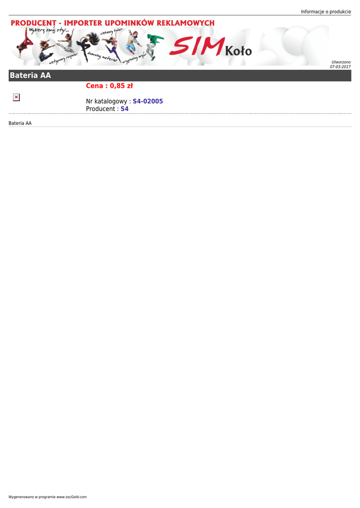 Informacje o produkcie Utworzono 07-03-2017 Bateria AA Cena : 0,85 zł Nr katalogowy : S4-02005 Producent : S4 Bateria AA Wygenerowano w programie www.oscGold.com