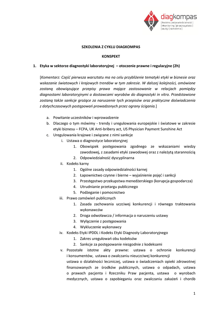 SZKOLENIA Z CYKLU DIAGKOMPAS KONSPEKT 1. Etyka w sektorze diagnostyki laboratoryjnej – otoczenie prawne i regulacyjne (2h) [Komentarz: Część pierwsza warsztatu ma na celu przybliżenie tematyki etyki w biznesie oraz wskazanie światowych i krajowych trendów w tym zakresie. W dalszej kolejności, omówione zostaną obowiązujące przepisy prawa mające zastosowanie w relacjach pomiędzy diagnostami laboratoryjnymi a dostawcami wyrobów do diagnostyki in vitro. Przedstawione zostaną także sankcje grożące za naruszenie tych przepisów oraz praktyczne doświadczenia z dotychczasowych postępowań prowadzonych przez ograny ścigania.] a. Powitanie uczestników i wprowadzenie b. Dlaczego o tym mówimy - trendy i uregulowania europejskie i światowe w zakresie etyki biznesu – FCPA, UK Anti-bribery act, US Physician Payment Sunshine Act c. Uregulowania krajowe i związane z nimi sankcje i. Ustawa o diagnostyce laboratoryjnej 1. Obowiązek postępowania zgodnego ze wskazaniami wiedzy zawodowej, z zasadami etyki zawodowej oraz z należytą starannością 2. Odpowiedzialność dyscyplinarna ii. Kodeks karny 1. Ogólne zasady odpowiedzialności karnej 2. Łapownictwo czynne i bierne – wyjaśnienie pojęć i sankcji 3. Przestępstwo przekupstwa menedżerskiego (korupcja gospodarcza) 4. Utrudnianie przetargu publicznego 5. Podżeganie i pomocnictwo iii. Prawo zamówień publicznych 1. Zasada zachowania uczciwej konkurencji i równego traktowania wykonawców 2. Droga odwoławcza / informacja o naruszeniu ustawy 3. Wyłączenie z postępowania 4. Wykluczenie wykonawcy iv. Kodeks Etyki IPDDL i Kodeks Etyki Diagnosty Laboratoryjnego 1. Zakres uregulowań obu kodeksów 2. Sankcje za postępowanie niezgodnie z kodeksami v. Pozostałe istotne akty prawne: ustawa o ochronie konkurencji i konsumentów, ustawa o zwalczaniu nieuczciwej konkurencji ustawa o działalności leczniczej, ustawa o świadczeniach opieki zdrowotnej finansowanych ze środków publicznych, ustawa o odpadach, ustawa o prawach pacjenta i Rzeczniku Praw pacjenta, ustawa o wyrobach medycznych, ustawa o zapobieganiu oraz zwalczaniu zakażeń i chorób 1 zakaźnych u ludzi, ustawa o Państwowym Ratownictwie Medycznym, ustawa o służbie medycyny pracy: 1. Omówienie listy ww. aktów prawnych, 2. Krótka charakterystyka aktów prawnych w zakresie, w jakim mogą one wpływać na zagadnienie etyki w relacjach pomiędzy diagnostami laboratoryjnymi a dostawcami wyrobów do diagnostyki in vitro. d. Ryzyka pozostające w sferze faktycznego działania i. Konflikt interesów ii. Czynności pozorne e. Praktyczne doświadczenia na bazie dotychczasowych działań organów (studium przypadku w branży wyrobów medycznych) 2. Prawidłowa komunikacja w reżimie zamówień publicznych (0,5h) [Komentarz: Ta część warsztatu skupiała się będzie na kwestiach etycznych związanych z procesem zamówień publicznych. Omówione zostaną wymogi określone w tym zakresie przez Kodeks Etyki IPDDL oraz praktyczne przypadki na bazie wcześniejszych doświadczeń.] a. Zasady wynikające z Kodeksu Etyki IPDDL b. Dozwolone formy prezentacji oferty handlowej c. Zasady uczciwej konkurencji a przygotowywanie, rozpowszechnianie i modyfikacja opisu przedmiotu zamówienia d. Dozwolone formy komunikacji zamawiającego z wykonawcami w kontekście obowiązujących zasad prawa zamówień publicznych. e. Przykłady korespondencji naruszającej zasady etyki. 3. Relacje środowiska medycznego z dostawcami wyrobów do diagnostyki in vitro – przegląd i ocena aktywności, wymogi dokumentacyjne (1,5h) [Komentarz: Ostatnia część szkolenia ma na celu przedstawienie konkretnych, szczegółowych zaleceń w zakresie współpracy pomiędzy diagnostami laboratoryjnymi a dostawcami produktów do diagnostyki in vitro i ich przedstawicielami na bazie obowiązujących przepisów, postanowień Kodeksu Etyki IPDDL i Kodeksu Etyki Diagnosty Laboratoryjnego.] a. Kryteria oceny ryzyka (mapa ryzyka) b. Dozwolone przejawy gościnności c. Udział przedstawicieli służby zdrowia w konferencjach/ wydarzeniach naukowych organizowanych przez osoby trzecie d. Sponsoring konferencji/ wydarzeń naukowych organizowanych przez osoby trzecie e. Spotkania/ konferencje organizowane przez dostawców dla przedstawicieli służby zdrowia f. Umowy z przedstawicielami służby zdrowia g. Przedmioty promocyjne h. Darowizny 2