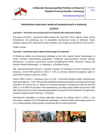 Ambasada Rzeczypospolitej Polskiej w Dżakarcie Wydział Promocji Handlu i Inwestycji Grudzień 2014 www.jakarta.trade.gov.pl Kalendarium wybranych wydarzeń gospodarczych w Indonezji 12/2014 4 grudnia – zniesienie wiz turystycznych do Indonezji dla wybranych krajów Począwszy od 2015 r. obywatele takich krajów jak: Australia, Chiny, Japonia, Rosja, Korea Południowa, nie potrzebują wiz, w przypadku turystycznej wizyty w Indonezji. Nowe przepisy mają na celu zwiększenie liczby turystów z ww. krajów do wartości 4,5 mln rocznie. Źródło: Tempo 8 grudnia - Kwartalny Raport Banku Światowego n/t Indonezji W Dżakarcie odbyła się prezentacja kolejnego w tym roku raportu Banku Światowego na temat kondycji indonezyjskiej gospodarki. Publikacja zaprezentowana została podczas seminarium, w którym uczestniczył również przedstawiciel WPHI. Głównym mówcą był dyrektor Banku Światowego – o. Indonezja – p. Rodrigo Chavez. Wg. zaprezentowanych danych, z powodu niższego od oczekiwań wzrostu inwestycji oraz eksportu, wzrost PKB wyniesie w 2015 r. 5,2%, co oznacza obniżenie prognozy ujętej w poprzednim raporcie z lipca br. (5,6%). Wzrost PKB w 2014 r. szacowany jest na 5,1% - minimalna korekta wobec wcześniejszej lipcowej prognozy – 5,2%. Główną siłą napędową lokalnej gospodarki pozostaje konsumpcja prywatna. W trzecim kw. br. deficyt na rachunku bieżącym zmniejszony został do 6,8 mld USD, tj. 3,1% PKB. W przyszłym roku spodziewany jest dalszy jego spadek do poziomu 2,8% PKB. Spowolnienie wzrostu światowej gospodarki przyczyniło się do obniżenia cen głównych towarów eksportowych Indonezji – surowców. Zmniejszenie subsydiów na paliwo wpłynęło czasowo na inflację, która w 2015 r., wg. szacunków, osiągnie 7,5%. Oszczędności wynikające z redukcji dotacji paliw będą wydane na m.in. służbę zdrowia, której poziom w Indonezji jest na niskim poziomie. 1 Niepokojącym jest, iż realizacja wydatków rządowych w ramach założonego na 2014 r. budżetu, wyniosła na koniec października jedynie 38%, co oznacza wynik o wiele gorszy w porównaniu z 2012 i 2013 r. Spowolnienie wzrosty światowej gospodarki przyczynilo się do obniżenia cen głównych towarów eksportowych Indonezji – surowców. Treść całego raportu dostępna jest na stronie Banku Światowego: http://www.worldbank.org/en/news/feature/2014/12/08/indonesia-economic-quarterlydecember-2014 8 grudnia – Wartość indonezyjskiej rupii wobec USD najniższa od 6 lat Indonezyjska waluta zanotowała najniższą od 6 lat wartość wobec dolara amerykańskiego. Kurs wymiany wyniósł 12376 IDR za 1 USD. Zdaniem ekonomistów, powyższa sytuacja jest wynikiem recesji w Japonii oraz gorszych od spodziewanych wyników chińskiej gospodarki, co powoduje mniejsze zapotrzebowanie ww. krajów na towary z Indonezji. Źródło: Jakarta Post 12 grudnia – Ministerstwo Handlu RI odbiera licencje importerom Ministerstwo Handlu RI odebrało status zarejestrowanego importera 2166 podmiotom, które nie złożyły w wymaganym czasie raportów dot. swojej działalności. Większość z nich to importerzy elektroniki i odzieży. Status ten wymagany jest w przypadku importu określonych w przepisach wybranych produktów. Źródło: Antaranews 15 grudnia - Indonezyjska Rada Koordynacji Inwestycji (BKPM) wprowadziła system online aplikowania i wydawania licencji Indonezyjska Rada Koordynacji Inwestycji (BKPM), wprowadziła zapowiadany już wcześniej system wydawania licencji inwestycyjnych, w tym dla podmiotów zagranicznych, z wykorzystaniem Internetu. Poprzez system online można aplikować o 11 różnych typów licencji/zezwoleń, w tym tych, które potrzebne są do rozpoczęcia działalności na terenie 2 Indonezji lub jej zwiększenia. W przyszłości planowane jest objęcie systemem online wszystkich zezwoleń wydawanych przez tę instytucję. Od 17 listopada 2014 r., firmy, które posiadają status osoby prawnej na terenie Indonezji, są zobowiązane do przesłania wszystkich niezbędnych dokumentów założycielskich do tzw. elektronicznego Folderu Spółki w celu stworzenia bazy danych firm w ramach National Single Window for Investment BKPM. Od 01 grudnia 2014 r., BKPM One-Stop-Service nie przyjmuje wniosków o licencje i inne zezwolenia wydawane przez tę instytucję, jeśli firma nie przekazała wcześniej dokumentów założycielskich do ww. folderu spółki.Wyjątkiem są tutaj numery identyfikacji dla importerów (API) oraz zezwolenia na pracę dla cudzoziemców, o które wciąż należy ubiegać się poprzez biuro BKPM. Powyższe udogodnienia dla inwestorów są wynikiem prowadzonej, co najmniej od 2010 r. polityki jednych drzwi, zapoczątkowanej przez prezydenta Susilo Bambang Yudhoyono, której celem jest poprawa klimatu inwestycyjnego oraz przyciągnięcie większej ilości firm zagranicznych, poprzez uproszczenie procedur wymaganych do rozpoczęcia i prowadzenia działalności gospodarczej w Indonezji. Wszelkie niezbędne instrukcje oraz złożenie aplikacji dostępne są przez następującą stronę internetową: http://online-spipise.bkpm.go.id/ Źródło: www.bkpm.go.id 19 grudnia – Indonezja największym rynkiem zbytu laptopów w regionie Azji Płd-Wsch. Sprzedaż laptopów na 6-u największych rynkach Azji Południowo-Wschodniej, tj. Indonezji, Singapuru, Tajlandii, Malezji, Wietnamu, Filipin, wyniosła w ciągu pierwszych 3-ech kwartałów 2014 r. ponad 4,9 mln sztuk, z czego 35% stanowiła sprzedaż w Indonezji. Źródło: Jakarta Post 3 20 grudnia – Wołowina dla Dżakarty z Małych Wysp Sundajskich Wschodnich Prezydent RI – Joko Widodo zapowiedział, iż popyt specjalnego dystryktu stołecznego Dżakarta na wołowinę, wynoszący 160 ton dziennie, będzie zaspokojony dostawami z Małych Wysp Sundajskich Wschodnich. Przedstawiciele obu prowincji podpisali w tej sprawie porozumienie, którego głównym celem jest wsparcie lokalnej hodowli oraz ograniczenie importu mięsa. 