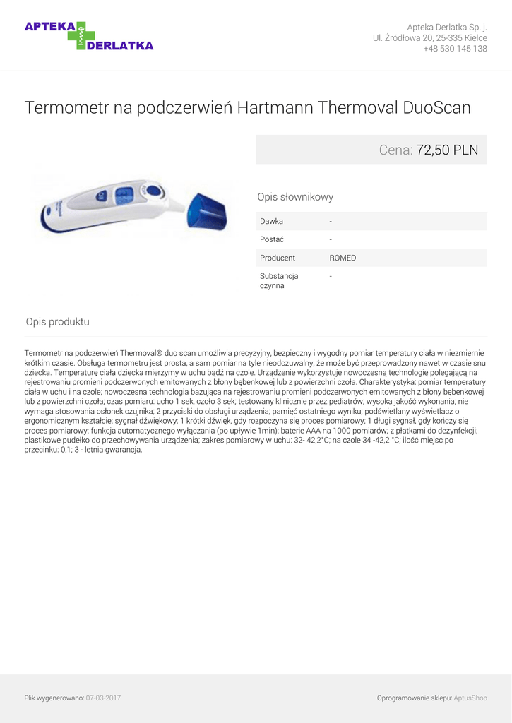 Apteka Derlatka Sp. j. Ul. Źródłowa 20, 25-335 Kielce +48 530 145 138 Termometr na podczerwień Hartmann Thermoval DuoScan Cena: 72,50 PLN Opis słownikowy Dawka - Postać - Producent ROMED Substancja czynna - Opis produktu Termometr na podczerwień Thermoval® duo scan umożliwia precyzyjny, bezpieczny i wygodny pomiar temperatury ciała w niezmiernie krótkim czasie. Obsługa termometru jest prosta, a sam pomiar na tyle nieodczuwalny, że może być przeprowadzony nawet w czasie snu dziecka. Temperaturę ciała dziecka mierzymy w uchu bądź na czole. Urządzenie wykorzystuje nowoczesną technologię polegającą na rejestrowaniu promieni podczerwonych emitowanych z błony bębenkowej lub z powierzchni czoła. Charakterystyka: pomiar temperatury ciała w uchu i na czole; nowoczesna technologia bazująca na rejestrowaniu promieni podczerwonych emitowanych z błony bębenkowej lub z powierzchni czoła; czas pomiaru: ucho 1 sek, czoło 3 sek; testowany klinicznie przez pediatrów; wysoka jakość wykonania; nie wymaga stosowania osłonek czujnika; 2 przyciski do obsługi urządzenia; pamięć ostatniego wyniku; podświetlany wyświetlacz o ergonomicznym kształcie; sygnał dźwiękowy: 1 krótki dźwięk, gdy rozpoczyna się proces pomiarowy; 1 długi sygnał, gdy kończy się proces pomiarowy; funkcja automatycznego wyłączania (po upływie 1min); baterie AAA na 1000 pomiarów; z płatkami do dezynfekcji; plastikowe pudełko do przechowywania urządzenia; zakres pomiarowy w uchu: 32- 42,2°C; na czole 34 -42,2 °C; ilość miejsc po przecinku: 0,1; 3 - letnia gwarancja. Plik wygenerowano: 07-03-2017 Powered by TCPDF (www.tcpdf.org) Oprogramowanie sklepu: AptusShop