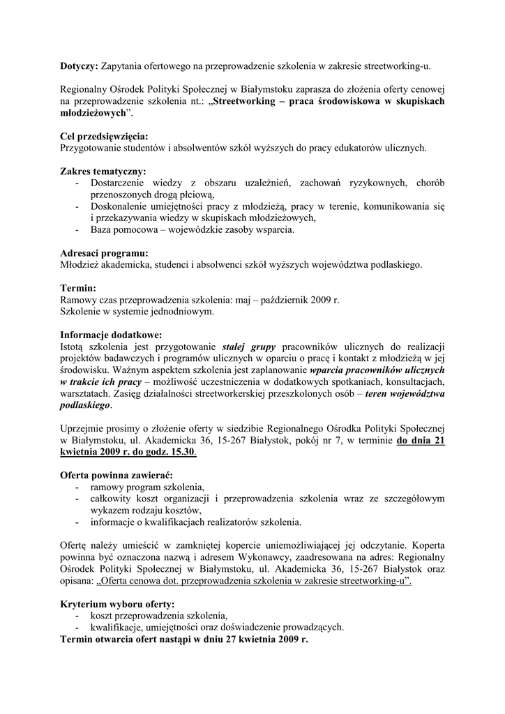 Dotyczy: Zapytania ofertowego na przeprowadzenie szkolenia w zakresie streetworking-u. Regionalny Ośrodek Polityki Społecznej w Białymstoku zaprasza do złoŜenia oferty cenowej na przeprowadzenie szkolenia nt.: „Streetworking – praca środowiskowa w skupiskach młodzieŜowych”. Cel przedsięwzięcia: Przygotowanie studentów i absolwentów szkół wyŜszych do pracy edukatorów ulicznych. Zakres tematyczny: - Dostarczenie wiedzy z obszaru uzaleŜnień, zachowań ryzykownych, chorób przenoszonych drogą płciową, - Doskonalenie umiejętności pracy z młodzieŜą, pracy w terenie, komunikowania się i przekazywania wiedzy w skupiskach młodzieŜowych, - Baza pomocowa – wojewódzkie zasoby wsparcia. Adresaci programu: MłodzieŜ akademicka, studenci i absolwenci szkół wyŜszych województwa podlaskiego. Termin: Ramowy czas przeprowadzenia szkolenia: maj – październik 2009 r. Szkolenie w systemie jednodniowym. Informacje dodatkowe: Istotą szkolenia jest przygotowanie stałej grupy pracowników ulicznych do realizacji projektów badawczych i programów ulicznych w oparciu o pracę i kontakt z młodzieŜą w jej środowisku. WaŜnym aspektem szkolenia jest zaplanowanie wparcia pracowników ulicznych w trakcie ich pracy – moŜliwość uczestniczenia w dodatkowych spotkaniach, konsultacjach, warsztatach. Zasięg działalności streetworkerskiej przeszkolonych osób – teren województwa podlaskiego. Uprzejmie prosimy o złoŜenie oferty w siedzibie Regionalnego Ośrodka Polityki Społecznej w Białymstoku, ul. Akademicka 36, 15-267 Białystok, pokój nr 7, w terminie do dnia 21 kwietnia 2009 r. do godz. 15.30. Oferta powinna zawierać: - ramowy program szkolenia, - całkowity koszt organizacji i przeprowadzenia szkolenia wraz ze szczegółowym wykazem rodzaju kosztów, - informacje o kwalifikacjach realizatorów szkolenia. Ofertę naleŜy umieścić w zamkniętej kopercie uniemoŜliwiającej jej odczytanie. Koperta powinna być oznaczona nazwą i adresem Wykonawcy, zaadresowana na adres: Regionalny Ośrodek Polityki Społecznej w Białymstoku, ul. Akademicka 36, 15-267 Białystok oraz opisana: „Oferta cenowa dot. przeprowadzenia szkolenia w zakresie streetworking-u”. Kryterium wyboru oferty: - koszt przeprowadzenia szkolenia, - kwalifikacje, umiejętności oraz doświadczenie prowadzących. Termin otwarcia ofert nastąpi w dniu 27 kwietnia 2009 r.