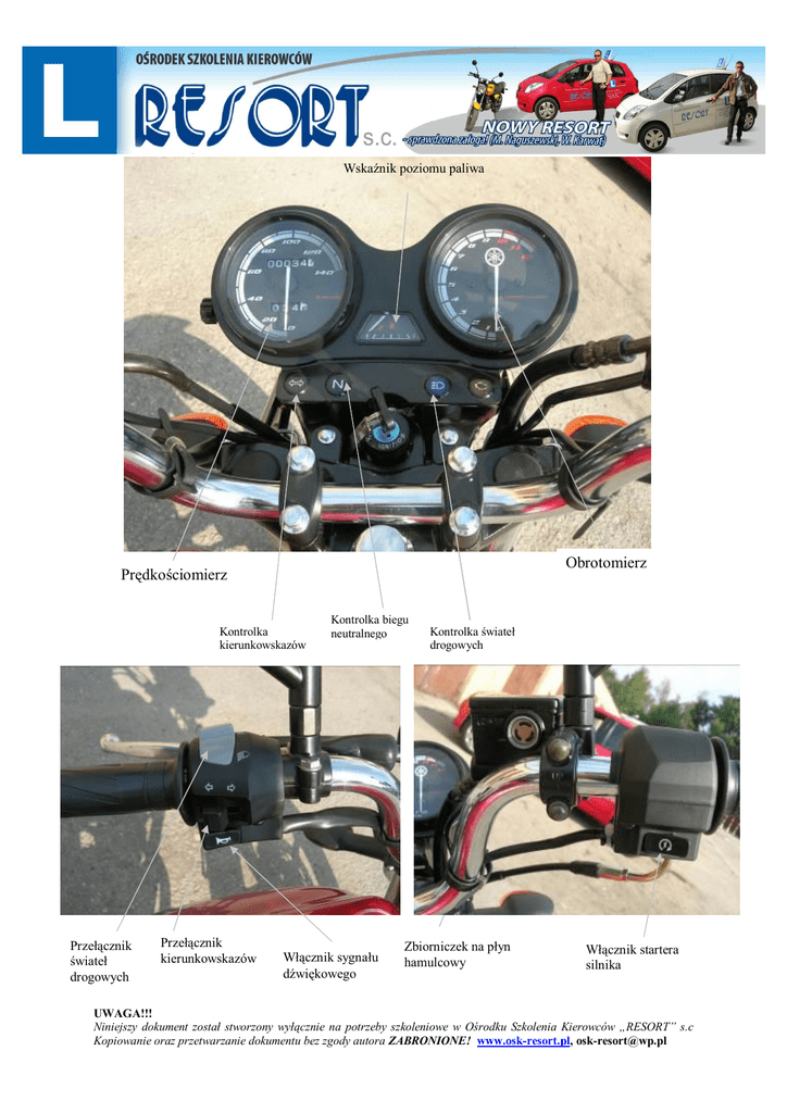 Wskaźnik poziomu paliwa Obrotomierz Prędkościomierz Kontrolka kierunkowskazów Przełącznik świateł drogowych Przełącznik kierunkowskazów Kontrolka biegu neutralnego Włącznik sygnału dźwiękowego Kontrolka świateł drogowych Zbiorniczek na płyn hamulcowy Włącznik startera silnika UWAGA!!! Niniejszy dokument został stworzony wyłącznie na potrzeby szkoleniowe w Ośrodku Szkolenia Kierowców „RESORT” s.c Kopiowanie oraz przetwarzanie dokumentu bez zgody autora ZABRONIONE! www.osk-resort.pl, [email protected] Wskaźnik poziomu oleju silnikowego Wskaźnik zużycia okładzin szczęk hamulcowych UWAGA!!! Niniejszy dokument został stworzony wyłącznie na potrzeby szkoleniowe w Ośrodku Szkolenia Kierowców „RESORT” s.c Kopiowanie oraz przetwarzanie dokumentu bez zgody autora ZABRONIONE! www.osk-resort.pl, [email protected]