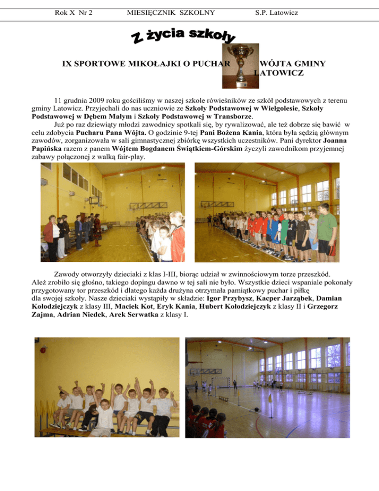 Rok X Nr 2 MIESIĘCZNIK SZKOLNY IX SPORTOWE MIKOŁAJKI O PUCHAR S.P. Latowicz WÓJTA GMINY LATOWICZ 11 grudnia 2009 roku gościliśmy w naszej szkole rówieśników ze szkół podstawowych z terenu gminy Latowicz. Przyjechali do nas uczniowie ze Szkoły Podstawowej w Wielgolesie, Szkoły Podstawowej w Dębem Małym i Szkoły Podstawowej w Transborze. JuŜ po raz dziewiąty młodzi zawodnicy spotkali się, by rywalizować, ale teŜ dobrze się bawić w celu zdobycia Pucharu Pana Wójta. O godzinie 9-tej Pani BoŜena Kania, która była sędzią głównym zawodów, zorganizowała w sali gimnastycznej zbiórkę wszystkich uczestników. Pani dyrektor Joanna Papińska razem z panem Wójtem Bogdanem Świątkiem-Górskim Ŝyczyli zawodnikom przyjemnej zabawy połączonej z walką fair-play. Zawody otworzyły dzieciaki z klas I-III, biorąc udział w zwinnościowym torze przeszkód. AleŜ zrobiło się głośno, takiego dopingu dawno w tej sali nie było. Wszystkie dzieci wspaniale pokonały przygotowany tor przeszkód i dlatego kaŜda druŜyna otrzymała pamiątkowy puchar i piłkę dla swojej szkoły. Nasze dzieciaki wystąpiły w składzie: Igor Przybysz, Kacper Jarząbek, Damian Kołodziejczyk z klasy III, Maciek Kot, Eryk Kania, Hubert Kołodziejczyk z klasy II i Grzegorz Zajma, Adrian Niedek, Arek Serwatka z klasy I. Rok X Nr 2 MIESIĘCZNIK SZKOLNY S.P. Latowicz Następnie do rywalizacji przystąpili uczniowie z klas IV – VI. DruŜyny chłopców i dziewcząt rozegrały między sobą mecze w halową piłkę noŜną i dwa ognie usportowione. W pierwszym meczu w halówkę chłopcy z Wielgolasu pokonali 3:0 kolegów z Dębego Małego, a dziewczyny z Wielgolasu wygrały z dziewczynami z Dębego Małego 1:0. W kolejnym meczu zawodnicy z Latowicza pokonali chłopaków z Wielgolasu 2:0, a nasze dziewczyny wygrały z Wielgolasem 1:0.Natomiast z Dębem Małym nasi chłopcy wygrali aŜ 7:0, a dziewczęta z Dębem Małym zremisowały 0:0. Kolejne mecze rozegrano w dwa ognie usportowione. I tak: chłopcy z Dębego Małego wygrali z Wielgolasem , Latowicz pokonał Wielgolas i Dębe Małe. Dziewczęta z Dębego Małego przegrały z Wielgolasem, a zawodniczki z Latowicza wygrały zarówno z Wielgolasem jak i z Dębem Małym. W druŜynie chłopców znaleźli się: Patryk Celej, Paweł Maciejec, Radek Miklaszewski, Kamil Reda, Łukasz SkarŜyński z klasy VI, Bartek Górski z klasy V i rezerwowi: Maciek Odziemczyk i Damian ZadroŜny z klasy VI. Wystąpiły dziewczęta: Martyna Barej, Dominika Gajowniczek, Marzena Gajowniczek, Dominika Gąska, Daria Płatek, Dorota Swiątek, Kasia Zawadka z klasy VI oraz Jola Gajowniczek, Angelika Rechnio z klasy V, w rezerwie Ola Kowalska, Ewelina Kokoszka z klasy V. Po podsumowaniu punktacji w poszczególnych konkurencjach okazało się, Ŝe I miejsce zajęli uczniowie ze Szkoły Podstawowej w Zespole Szkół w Latowiczu II miejsce zajęli uczniowie ze Szkoły Podstawowej w Wielgolesie III miejsce zajęli uczniowie ze Szkoły podstawowej w Dębem Małym. Na zakończenie IX Sportowych Mikołajek wszystkie druŜyny otrzymały pamiątkowe puchary i dyplomy, które wręczał sam Pan Wójt. Miło było po raz kolejny zająć I miejsce i wygrać ten najwaŜniejszy Puchar. Gratulujemy pięknego zwycięstwa.