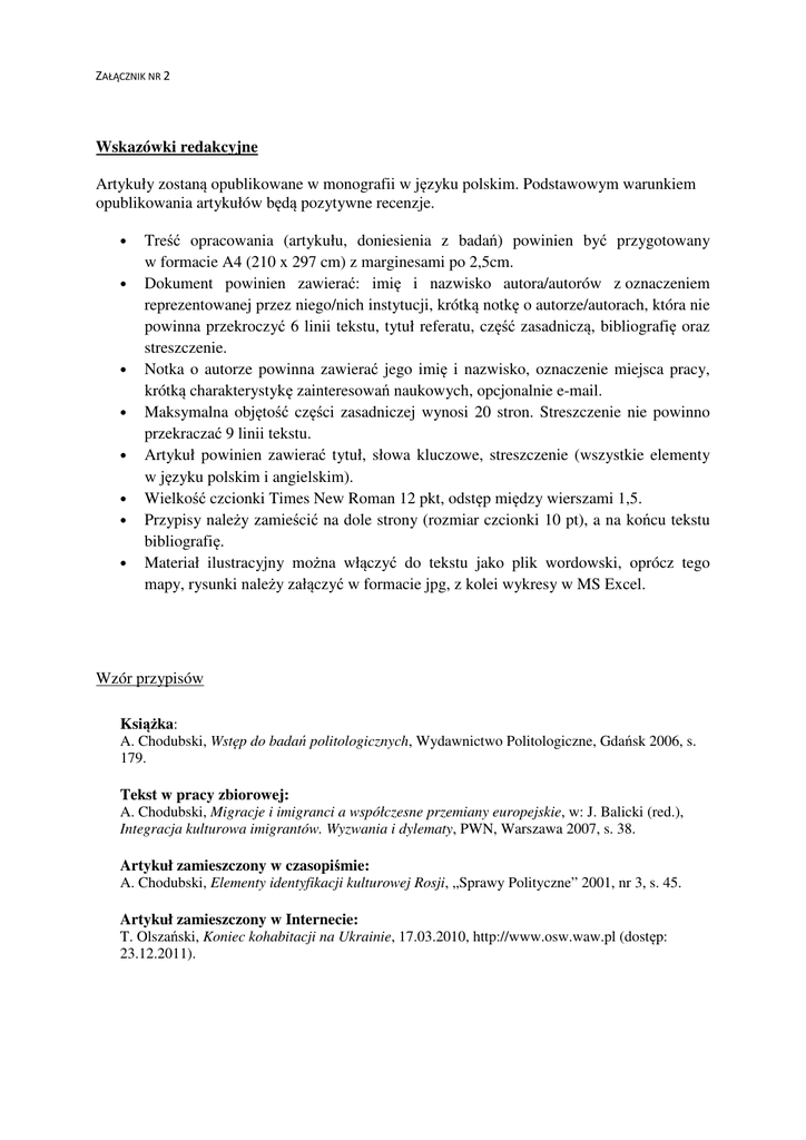 ZAŁĄCZNIK NR 2 Wskazówki redakcyjne Artykuły zostaną opublikowane w monografii w języku polskim. Podstawowym warunkiem opublikowania artykułów będą pozytywne recenzje. • • • • • • • • Treść opracowania (artykułu, doniesienia z badań) powinien być przygotowany w formacie A4 (210 x 297 cm) z marginesami po 2,5cm. Dokument powinien zawierać: imię i nazwisko autora/autorów z oznaczeniem reprezentowanej przez niego/nich instytucji, krótką notkę o autorze/autorach, która nie powinna przekroczyć 6 linii tekstu, tytuł referatu, część zasadniczą, bibliografię oraz streszczenie. Notka o autorze powinna zawierać jego imię i nazwisko, oznaczenie miejsca pracy, krótką charakterystykę zainteresowań naukowych, opcjonalnie e-mail. Maksymalna objętość części zasadniczej wynosi 20 stron. Streszczenie nie powinno przekraczać 9 linii tekstu. Artykuł powinien zawierać tytuł, słowa kluczowe, streszczenie (wszystkie elementy w języku polskim i angielskim). Wielkość czcionki Times New Roman 12 pkt, odstęp między wierszami 1,5. Przypisy należy zamieścić na dole strony (rozmiar czcionki 10 pt), a na końcu tekstu bibliografię. Materiał ilustracyjny można włączyć do tekstu jako plik wordowski, oprócz tego mapy, rysunki należy załączyć w formacie jpg, z kolei wykresy w MS Excel. Wzór przypisów Książka: A. Chodubski, Wstęp do badań politologicznych, Wydawnictwo Politologiczne, Gdańsk 2006, s. 179. Tekst w pracy zbiorowej: A. Chodubski, Migracje i imigranci a współczesne przemiany europejskie, w: J. Balicki (red.), Integracja kulturowa imigrantów. Wyzwania i dylematy, PWN, Warszawa 2007, s. 38. Artykuł zamieszczony w czasopiśmie: A. Chodubski, Elementy identyfikacji kulturowej Rosji, „Sprawy Polityczne” 2001, nr 3, s. 45. Artykuł zamieszczony w Internecie: T. Olszański, Koniec kohabitacji na Ukrainie, 17.03.2010, http://www.osw.waw.pl (dostęp: 23.12.2011). Wzór edycyjny tekstu: Notka o Autorze/Autorach TYTUŁ ARTYKUŁU (czcionka 14 pkt) Title of paper (tytuł referatu w języku angielskim) Streszczenie Słowa kluczowe Abstract (streszczenie w języku angielskim) Keywords: (słowa kluczowe w języku angielskim) Treść referatu – czcionka (Times New Roman, 12 pkt, interlinia 1,5). Objętość tekstu – od 20 do 40 tys. znaków (odpowiada objętości od 10-20 stron) Bibliografia/Literatura (w wykazie materiałów źródłowych umieszczamy nazwy wydawnictw)