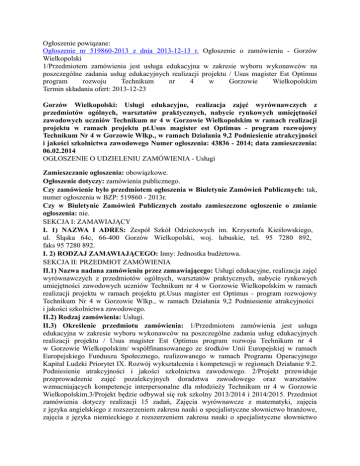 Ogłoszenie powiązane: Ogłoszenie nr 519860-2013 z dnia 2013-12-13 r. Ogłoszenie o zamówieniu - Gorzów Wielkopolski 1/Przedmiotem zamówienia jest usługa edukacyjna w zakresie wyboru wykonawców na poszczególne zadania usług edukacyjnych realizacji projektu / Usus magister Est Optimus program rozwoju Technikum nr 4 w Gorzowie Wielkopolskim Termin składania ofert: 2013-12-23 Gorzów Wielkopolski: Usługi edukacyjne, realizacja zajęć wyrównawczych z przedmiotów ogólnych, warsztatów praktycznych, nabycie rynkowych umiejętności zawodowych uczniów Technikum nr 4 w Gorzowie Wielkopolskim w ramach realizacji projektu w ramach projektu pt.Usus magister est Optimus - program rozwojowy Technikum Nr 4 w Gorzowie Wlkp., w ramach Działania 9,2 Podniesienie atrakcyjności i jakości szkolnictwa zawodowego Numer ogłoszenia: 43836 - 2014; data zamieszczenia: 06.02.2014 OGŁOSZENIE O UDZIELENIU ZAMÓWIENIA - Usługi Zamieszczanie ogłoszenia: obowiązkowe. Ogłoszenie dotyczy: zamówienia publicznego. Czy zamówienie było przedmiotem ogłoszenia w Biuletynie Zamówień Publicznych: tak, numer ogłoszenia w BZP: 519860 - 2013r. Czy w Biuletynie Zamówień Publicznych zostało zamieszczone ogłoszenie o zmianie ogłoszenia: nie. SEKCJA I: ZAMAWIAJĄCY I. 1) NAZWA I ADRES: Zespół Szkół Odzieżowych im. Krzysztofa Kieślowskiego, ul. Śląska 64c, 66-400 Gorzów Wielkopolski, woj. lubuskie, tel. 95 7280 892, faks 95 7280 892. I. 2) RODZAJ ZAMAWIAJĄCEGO: Inny: Jednostka budżetowa. SEKCJA II: PRZEDMIOT ZAMÓWIENIA II.1) Nazwa nadana zamówieniu przez zamawiającego: Usługi edukacyjne, realizacja zajęć wyrównawczych z przedmiotów ogólnych, warsztatów praktycznych, nabycie rynkowych umiejętności zawodowych uczniów Technikum nr 4 w Gorzowie Wielkopolskim w ramach realizacji projektu w ramach projektu pt.Usus magister est Optimus - program rozwojowy Technikum Nr 4 w Gorzowie Wlkp., w ramach Działania 9,2 Podniesienie atrakcyjności i jakości szkolnictwa zawodowego. II.2) Rodzaj zamówienia: Usługi. II.3) Określenie przedmiotu zamówienia: 1/Przedmiotem zamówienia jest usługa edukacyjna w zakresie wyboru wykonawców na poszczególne zadania usług edukacyjnych realizacji projektu / Usus magister Est Optimus program rozwoju Technikum nr 4 w Gorzowie Wielkopolskim/ współfinansowanego ze środków Unii Europejskiej w ramach Europejskiego Funduszu Społecznego, realizowanego w ramach Programu Operacyjnego Kapitał Ludzki Priorytet IX. Rozwój wykształcenia i kompetencji w regionach Działanie 9.2. Podniesienie atrakcyjności i jakości szkolnictwa zawodowego. 2/Projekt przewiduje przeprowadzenie zajęć pozalekcyjnych doradztwa zawodowego oraz warsztatów wzmacniających kompetencje interpersonalne dla młodzieży Technikum nr 4 w Gorzowie Wielkopolskim.3/Projekt będzie odbywał się rok szkolny 2013/2014 i 2014/2015. Przedmiot zamówienia dotyczy realizacji 15 zadań, Zajęcia wyrównawcze z matematyki, zajęcia z języka angielskiego z rozszerzeniem zakresu nauki o specjalistyczne słownictwo branżowe, zajęcia z języka niemieckiego z rozszerzeniem zakresu nauki o specjalistyczne słownictwo branżowe, zajęcia z wzornictwa użytkowego i zaawansowane technik haftu, zajęcia z nowoczesnych specjalistycznych metod tworzenia kolekcji odzieżowej, przy wykorzystaniu narzędzi informatycznych, zajęcia w zakresie zakładania i profesjonalnego prowadzenia punktu usługowego, zajęcia w zakresie specjalistycznych narzędzi informatycznych w branży odzieżowej i fryzjerskiej, zajęcia z wizerunku, zajęcia z zakresu doradztwa zawodowego, zajęcia w zakresie wsparcia psychologiczno-pedagogicznego, zajęcia certyfikowane z fryzjerstwa i technik makijażu... II.4) Wspólny Słownik Zamówień (CPV): 80.00.00.00-4, 80.31.00.00-0, 80.41.00.00-1. SEKCJA III: PROCEDURA III.1) TRYB UDZIELENIA ZAMÓWIENIA: Przetarg nieograniczony III.2) INFORMACJE ADMINISTRACYJNE • Zamówienie dotyczy projektu/programu finansowanego ze środków Unii Europejskiej: tak, projekt/program: Program Operacyjny Kapitał Ludzki, Priorytet IX- Rozwój wykształcenia i kompetencji w regionach, Działanie 9.2 Podniesienie atrakcyjności i jakości szkolnictwa zawodowego.. SEKCJA IV: UDZIELENIE ZAMÓWIENIA Część NR: 1 Nazwa: Realizacja zajęć wyrównawczych z matematyki dla uczniów Technikum nr 4 w Zespole Szkół Odzieżowych . Zajęcia z matematyki realizowane będą w okresie I 2014 - VI 2015 i obejmą 1 grupę 10 uczniów IV.1) DATA UDZIELENIA ZAMÓWIENIA: 20.01.2014. IV.2) LICZBA OTRZYMANYCH OFERT: 1. IV.3) LICZBA ODRZUCONYCH OFERT: 0. IV.4) NAZWA I ADRES WYKONAWCY, KTÓREMU UDZIELONO ZAMÓWIENIA: • Prospector Spółka z o.o Ul. Sikory 1 44-100 Gliwice, Ul. Sikory 1, 44-100 Gliwice, kraj/woj. śląskie. IV.5) Szacunkowa wartość zamówienia (bez VAT): 3089,43 PLN. IV.6) INFORMACJA O CENIE WYBRANEJ OFERTY ORAZ O OFERTACH Z NAJNIŻSZĄ I NAJWYŻSZĄ CENĄ • Cena wybranej oferty: 3600,00 • Oferta z najniższą ceną: 3600,00 / Oferta z najwyższą ceną: 3600,00 • Waluta: PLN. Część NR: 3 Nazwa: Realizacja zajęć z języka niemieckiego z rozszerzeniem zakresu nauki o specjalistyczne słownictwo branżowe IV.1) DATA UDZIELENIA ZAMÓWIENIA: 20.01.2014. IV.2) LICZBA OTRZYMANYCH OFERT: 1. IV.3) LICZBA ODRZUCONYCH OFERT: 0. IV.4) NAZWA I ADRES WYKONAWCY, KTÓREMU UDZIELONO ZAMÓWIENIA: • Prospector Spółka z o.o, Ul. Sikory 1, 44-100 Gliwice, kraj/woj. śląskie. IV.5) Szacunkowa wartość zamówienia (bez VAT): 6016,26 PLN. IV.6) INFORMACJA O CENIE WYBRANEJ OFERTY ORAZ O OFERTACH Z NAJNIŻSZĄ I NAJWYŻSZĄ CENĄ • Cena wybranej oferty: 7200,00 • Oferta z najniższą ceną: 7200,00 / Oferta z najwyższą ceną: 7200,00 • Waluta: PLN. Część NR: 4 Nazwa: Realizacja zajęć -Wzornictwo użytkowe i zaawansowane techniki haftu. IV.1) DATA UDZIELENIA ZAMÓWIENIA: 20.01.2014. IV.2) LICZBA OTRZYMANYCH OFERT: 1. IV.3) LICZBA ODRZUCONYCH OFERT: 0. IV.4) NAZWA I ADRES WYKONAWCY, KTÓREMU UDZIEL