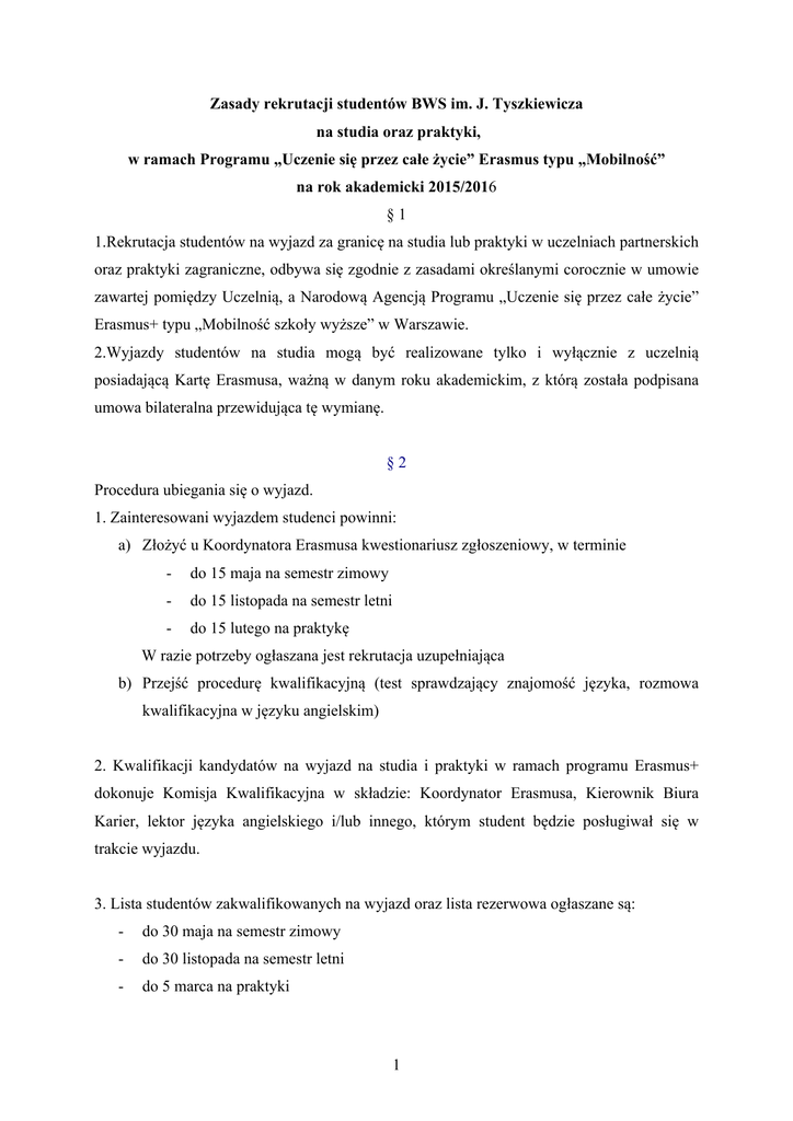 Zasady rekrutacji studentów BWS im. J. Tyszkiewicza na studia oraz praktyki, w ramach Programu „Uczenie się przez całe życie” Erasmus typu „Mobilność” na rok akademicki 2015/2016 § 1 1.Rekrutacja studentów na wyjazd za granicę na studia lub praktyki w uczelniach partnerskich oraz praktyki zagraniczne, odbywa się zgodnie z zasadami określanymi corocznie w umowie zawartej pomiędzy Uczelnią, a Narodową Agencją Programu „Uczenie się przez całe życie” Erasmus+ typu „Mobilność szkoły wyższe” w Warszawie. 2.Wyjazdy studentów na studia mogą być realizowane tylko i wyłącznie z uczelnią posiadającą Kartę Erasmusa, ważną w danym roku akademickim, z którą została podpisana umowa bilateralna przewidująca tę wymianę. § 2 Procedura ubiegania się o wyjazd. 1. Zainteresowani wyjazdem studenci powinni: a) Złożyć u Koordynatora Erasmusa kwestionariusz zgłoszeniowy, w terminie do 15 maja na semestr zimowy do 15 listopada na semestr letni do 15 lutego na praktykę W razie potrzeby ogłaszana jest rekrutacja uzupełniająca b) Przejść procedurę kwalifikacyjną (test sprawdzający znajomość języka, rozmowa kwalifikacyjna w języku angielskim) 2. Kwalifikacji kandydatów na wyjazd na studia i praktyki w ramach programu Erasmus+ dokonuje Komisja Kwalifikacyjna w składzie: Koordynator Erasmusa, Kierownik Biura Karier, lektor języka angielskiego i/lub innego, którym student będzie posługiwał się w trakcie wyjazdu. 3. Lista studentów zakwalifikowanych na wyjazd oraz lista rezerwowa ogłaszane są: do 30 maja na semestr zimowy do 30 listopada na semestr letni do 5 marca na praktyki 1 4. W przypadku niezgody na decyzję Komisji Kwalifikacyjnej student ma prawo złożyć odwołanie w terminie 7 dni od daty ogłoszenia wyników. Odwołania należy składać u Koordynatora Erasmusa. Odwołanie zostanie rozpatrzone w terminie 10 dni przez Komisję Odwoławczą w składzie Prorektor, Koordynator Erasmusa, lektor (inny niż uczestniczący w obradach Komisji Kwalifikacyjnej) języka angielskiego i/lub innego, którym student będzie posługiwał się w trakcie wyjazdu. 5. Szczegóły wyjazdu, dotyczące realizowanych przedmiotów, praktyki, terminu wyjazdu, itp. będą uzgadniane wspólnie przez studenta, Koordynatora Erasmusa i partnera zagranicznego. Akceptacja ustalonych warunków przez Prorektora jest równoznaczna z uzyskaniem zgody na wyjazd. 6. Koordynator Erasmusa przygotowuje umowę, którą podpisuje student i Prorektor lub osoba przez niego upoważniona. 7. Wyjeżdżający student otrzymuje Kartę Erasmusa 8. W przypadku wyjazdu na praktykę powinien zapoznać się z Kartą Jakości Praktyki Erasmusa 9. Student, który pozytywnie zaliczył semestr studiów na stypendium Erasmusa w uczelni partnerskiej ma prawo aplikować o przedłużenie pobytu do maksymalnie 12 miesięcy. § 3 Student zakwalifikowany na wyjazd w programie Erasmus w BWS im. J. Tyszkiewicza musi spełniać następujące kryteria formalne: 1. być zarejestrowany jako student BWS przez cały czas trwania pobytu na stypendium; 2. być (w momencie wyjazdu) studentem co najmniej drugiego roku studiów (stacjonarnych lub niestacjonarnych) 3. nie może przebywać (w trakcie stypendium) na urlopie dziekańskim, ani być urlopowany 4. Dobra znajomość języka obcego, w którym prowadzone będą wykłady na uczelni przyjmującej 5. Wypełnienie testu biegłości językowej w narzędziu online wskazanym przez uczelnię 6. Podczas procedury kwalifikacyjnej, jako priorytetowe uznaje się: uzyskanie wysokiej średniej ze studiów znajomość języka , którym student będzie realizował studia zagranicą zachowanie zasady zapewnienia równości szans kobiet i mężczyzn oraz osób niepełnosprawnych 2 7. Student może podczas swoich studiów, niezależnie od liczby studiowanych kierunków oraz liczby uczelni macierzystych, zrealizować: a) jednokrotny wyjazd na studia (SMS) b) jednokrotny wyjazd na praktykę (SMP § 4 W przypadku rezygnacji zakwalifikowanego studenta/ studentów z wyjazdu prawo do wyjazdu uzyskują kolejni studenci z listy rezerwowej lub w razie braku listy rezerwowej ogłasza się rekrutację uzupełniającą. § 5 Wymagane dokumenty do przygotowania w I fazie: a) formularz zgłoszeniowy (aplikacja) b) CV w języku polskim oraz ewentualnie kserokopie referencji, certyfikatów językowych i innych załączników c) list motywacyjny w języku angielskim d) zaświadczenie z Biura ds. studenckich o statusie studenta jak i o średniej ocen Dokumenty wymagane do zaliczenia wyjazdu określono w zasadach finansowania wyjazdów stypendialnych. 3