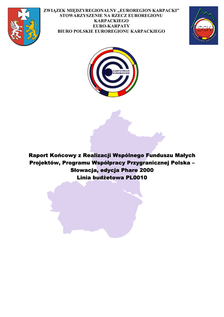 ZWIĄZEK MIĘDZYREGIONALNY „EUROREGION KARPACKI” STOWARZYSZENIE NA RZECZ EUROREGIONU KARPACKIEGO EURO-KARPATY 5 BIURO POLSKIE EUROREGIONU KARPACKIEGO Raport Końcowy z Realizacji Wspólnego Funduszu Małych Projektów, Programu Współpracy Przygranicznej Polska – Słowacja, edycja Phare 2000 Linia budżetowa PL0010 SPIS TREŚCI 1. Wprowadzenie 2. Podstawa prawna 3. Opis wyboru projektów 4. Realizacja 5. Sektory 6. Beneficjenci 7. Partnerzy zagraniczni 8. Najciekawsze projekty 9. Efekty 10. Wykorzystanie środków 11. Wkład własny 12. Monitoring 13. Promocja UE 14. Problemy 15. Podsumowanie 1. Wprowadzenie 1.1 Informacja o Euroregionie A. Podstawowe informacje statystyczne Związek Międzyregionalny Euroregion Karpacki powołany został 14 lutego 1993 roku w Debreczynie na Węgrzech jako wynik inicjatyw środowisk społecznych i politycznych z obszarów przygranicznych państw leżących na obszarze masywu Karpat. Związek Międzyregionalny Euroregion Karpacki nie posiada osobowości prawnej, jest wyłącznie porozumieniem politycznym w ramach, którego realizowane są inicjatywy z zakresu współpracy transgranicznej i międzyregionalnej. W ramach Związku współpracują władze regionalne i instytucje z obszaru pięciu państw Europy Środkowo-wschodniej: - Rzeczpospolitej Polskiej o powierzchni - Ukrainy, - Rumunii, - Wegier, - Republiki Słowacji Obszar Związku Międzyregionalnego „Euroregion Karpacki” wynosi ponad 160 000 km². Na obszarze Euroregionu Karpackiego mieszka około 15 820 000 mieszkańców. Udział terytoriów poszczególnych państw wraz z danymi demograficznymi przedstawia poniższa tabela: Strona Krajowa Populacja Gęstość zaludnienia Mieszkańcy miast Mieszkańcy wsi w tyś. osoba/ km² w% w% POLSKA 2 131 121 40, 9 59,1 SŁOWACJA 1 555 100, 8 53, 5 46,5 WĘGRY 2 635 100 57, 4 42,6 RUMUNIA 3 320 78, 47 44,5 55,5 UKRAINA 6 179 111 48,2 51,8 Tabela 1. Podstawowe dane statystyczne stron krajowych Euroregionu Karpackiego B. Struktura Związku Międzyregionalnego Euroregion Karpacki oraz Strony Polskiej Euroregionu Karpackiego W dniu 6 grudnia 2002 roku w Koszycach na Słowacji przeprowadzona została reforma Związku. W jej wyniku ustanowiona została następująca struktura na poziomie międzynarodowym. RADA EUROREGIONU PRZEWODNICZĄCY RADY PREZYDIUM RADY MIĘDZYNARODOWY SEKRETARIAT BIURA KRAJOWE EUROREGIONU Schemat 1. Struktura organizacyjna Związku Międzyregionalnego „Euroregion Karpacki” Każda ze Stron Krajowych w sposób autonomiczny decyduje o formie prawnej i organizacyjnej swojego Biura. Obecnie jedynie Strona Polska i Słowacka zorganizowana jest w formie stowarzyszeń samorządów, Strona Ukraińska posługuję się formułą fundacji, natomiast Strony Węgierska i Rumuńska działają w oparciu o administrację publiczną. Formę prawną oraz układ organizacyjny Polskiej Strony Krajowej przedstawia poniższa tabela. Terytorium Podmiotowość prawna, (status Biura Polskiego EK) Podstawa prawna Aktorzy (podmioty uczestniczące) Terytorium Województwa Podkarpackiego oraz samorządów wchodzących w skład Stowarzyszenia Euro-Karpaty Stowarzyszenie, (Biuro Stowarzyszenia pełni funkcję Biura Polskiego Euroregionu Karpackiego) Ustawa: „Prawo o Stowarzyszeniach ,Ustawa o samorządzie wojewódzkim, Ustawa: „O zasadach przystępowania jednostek samorządu terytorialnego do międzynarodowych zrzeszeń społeczności lokalnych i regionalnych”, Uchwała Sejmiku IX/84/99, Statut Związku Międzyregionalnego Euroregion Karpacki Samorządy terytorialne oraz organizacje i instytucje wchodzące w skład Stowarzyszenia Na Rzecz Euroregionu Karpackiego Euro-Karpaty Reprezentacja w Radzie Finansowanie • • • Wojewoda Podkarpacki Marszałek Województwa Podkarpackiego Prezes Stowarzyszenia Na Rzecz Euroregionu Karpackiego EuroKarpaty • Przedstawiciele Konwentu Samorządowego Strony Polskiej Euroregionu Karpackiego • Przedstawiciel sektora prywatnego • Przedstawiciel organizacji pozarządowej • Dyrektor Biura Polskiego Euroregionu Karpackiego Dotacja na zadanie prowadzenia Biura Polskiego EK z budżetu Województwa Podkarpackiego, środki własne Stowarzyszenia (zewnętrzne), składki członkowskie w Stowarzyszeniu, środki pomocowe Unii Europejskiej Tabela 2. Prawny i organizacyjny układ Strony Polskiej Euroregionu Karpackiego Od 01. 03. 2001 roku Biuro Polskie Euroregionu Karpackiego uzyskało podmiotowość prawną poprzez wejście w skład Stowarzyszenia Na Rzecz Euroregionu Karpackiego EuroKarpaty. Było to możliwe dzięki reorganizacji zmierzającej do uregulowania formalnoprawnych aspektów funkcjonowania Strony Polskiej Euroregionu Karpackiego, która w latach 1993 – 2001 funkcjonowała bez osobowości prawnej. Fakt ten skutkował brakiem legalnej możliwości zarządzania Funduszami w ramach programów współpracy przygranicznej Phare. Obecnie w skład Stowarzyszenia Na Rzecz Euroregionu Karpackiego Euro-Karpaty wchodzi 36 jednostek samorządu terytorialnego z obszaru Województwa Podkarpackiego. (stan na 31. 10. 2003 r.) Struktura organizacyjna Stowarzyszenia przedstawia się następująco. Walne Zebranie Członków Zarząd Stowarzyszenia Komisja Rewizyjna Biuro Polskie Euroregionu Karpackiego (Biuro Zarządu) Schemat 2. Struktura organizacyjna Stowarzyszenia Na Rzecz Euroregionu Karpackiego Euro-Karpaty Cele Stowarzyszenia określone są w Rozdziale 2, paragrafie 8 Statutu w następujący sposób: Celem Stowarzyszenie jest: 1/ tworzenie rzeczywistych struktur współpracy transgranicznej i międzyregionalnej na terytorium Związku Międzyregionalnego „Euroregion Karpacki” – regionach przygranicznych państw leżących na obszarze Karpat, w oparciu o prawo krajowe i europejskie, na zasadach partnerstwa poziomego i pionowego, subsydiarności i demokratycznej reprezentacji podmiotów sektora: publicznego, prywatnego i pozarządowego. 2/ koordynacja wykorzystania pomocy Unii Europejskiej przeznaczonej na współpracę