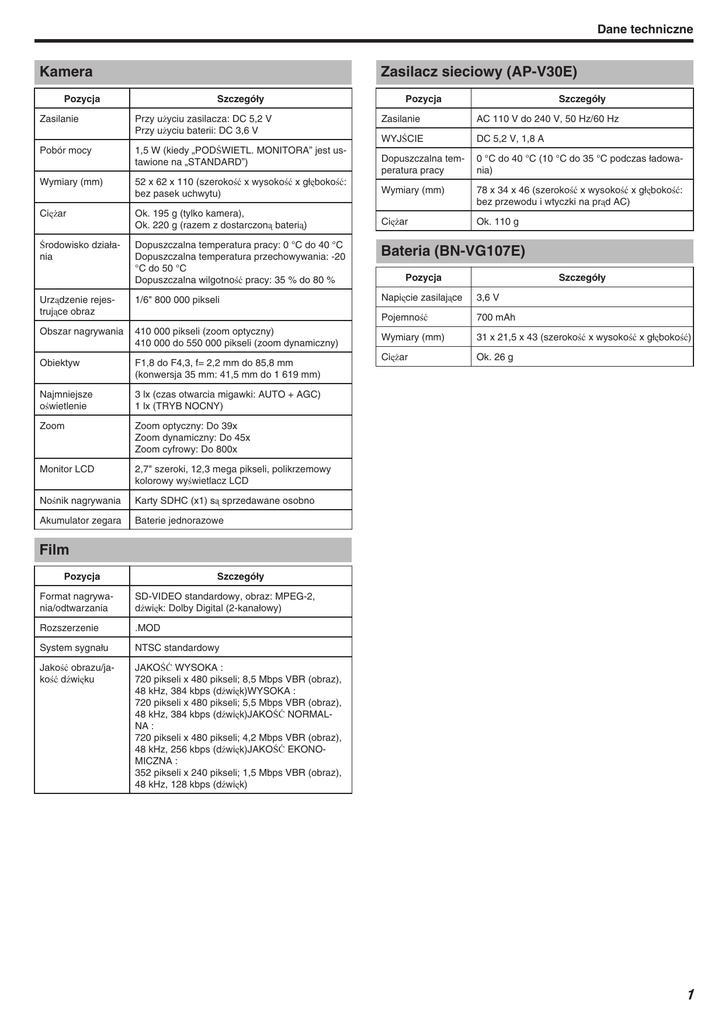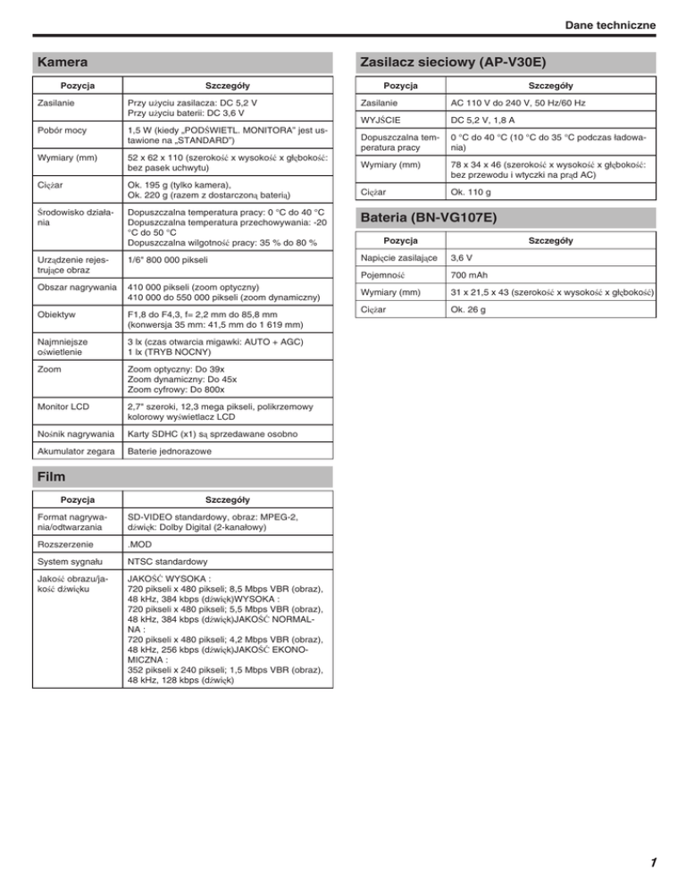 Dane techniczne Kamera Zasilacz sieciowy (AP-V30E) Pozycja Szczegóły Zasilanie Przy użyciu zasilacza: DC 5,2 V Przy użyciu baterii: DC 3,6 V Pobór mocy 1,5 W (kiedy „PODŚWIETL. MONITORA” jest ustawione na „STANDARD”) Wymiary (mm) Pozycja Szczegóły Zasilanie AC 110 V do 240 V, 50 Hz/60 Hz WYJŚCIE DC 5,2 V, 1,8 A Dopuszczalna temperatura pracy 0 °C do 40 °C (10 °C do 35 °C podczas ładowania) 52 x 62 x 110 (szerokość x wysokość x głębokość: bez pasek uchwytu) Wymiary (mm) 78 x 34 x 46 (szerokość x wysokość x głębokość: bez przewodu i wtyczki na prąd AC) Ciężar Ok. 195 g (tylko kamera), Ok. 220 g (razem z dostarczoną baterią) Ciężar Ok. 110 g Środowisko działania Dopuszczalna temperatura pracy: 0 °C do 40 °C Dopuszczalna temperatura przechowywania: -20 °C do 50 °C Dopuszczalna wilgotność pracy: 35 % do 80 % Bateria (BN-VG107E) Urządzenie rejestrujące obraz 1/6" 800 000 pikseli Napięcie zasilające 3,6 V Pojemność 700 mAh Obszar nagrywania 410 000 pikseli (zoom optyczny) 410 000 do 550 000 pikseli (zoom dynamiczny) Wymiary (mm) 31 x 21,5 x 43 (szerokość x wysokość x głębokość) Obiektyw F1,8 do F4,3, f= 2,2 mm do 85,8 mm (konwersja 35 mm: 41,5 mm do 1 619 mm) Ciężar Ok. 26 g Najmniejsze oświetlenie 3 lx (czas otwarcia migawki: AUTO + AGC) 1 lx (TRYB NOCNY) Zoom Zoom optyczny: Do 39x Zoom dynamiczny: Do 45x Zoom cyfrowy: Do 800x Monitor LCD 2,7" szeroki, 12,3 mega pikseli, polikrzemowy kolorowy wyświetlacz LCD Nośnik nagrywania Karty SDHC (x1) są sprzedawane osobno Akumulator zegara Baterie jednorazowe Pozycja Szczegóły Film Pozycja Szczegóły Format nagrywania/odtwarzania SD-VIDEO standardowy, obraz: MPEG-2, dźwięk: Dolby Digital (2-kanałowy) Rozszerzenie .MOD System sygnału NTSC standardowy Jakość obrazu/jakość dźwięku JAKOŚĆ WYSOKA : 720 pikseli x 480 pikseli; 8,5 Mbps VBR (obraz), 48 kHz, 384 kbps (dźwięk)WYSOKA : 720 pikseli x 480 pikseli; 5,5 Mbps VBR (obraz), 48 kHz, 384 kbps (dźwięk)JAKOŚĆ NORMALNA : 720 pikseli x 480 pikseli; 4,2 Mbps VBR (obraz), 48 kHz, 256 kbps (dźwięk)JAKOŚĆ EKONOMICZNA : 352 pikseli x 240 pikseli; 1,5 Mbps VBR (obraz), 48 kHz, 128 kbps (dźwięk) 1