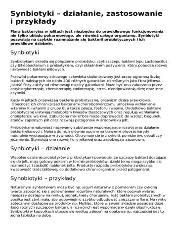 Synbiotyki – działanie, zastosowanie i przykłady Flora bakteryjna w jelitach jest niezbędna do prawidłowego funkcjonowania nie tylko układu pokarmowego, ale również całego organizmu. Synbiotyki pozwalają na szybkie rozmnażanie się bakterii probiotycznych i ich prawidłowe działanie. Synbiotyki Synbiotykami określa się połączenie probiotyku, czyli szczepu bakterii typu Lactobacillus czy Bifidobacterium z prebiotykiem, czyli składnikiem pożywienia, który pobudza rozwój i aktywność bakterii jelitowych. Przewód pokarmowy zdrowego człowieka skolonizowany jest przez ogromną liczbę bakterii, należących do około 400 różnych gatunków, określanych jako flora jelitowa. Jakość flory zależy od równowagi między gatunkami. Może być ona zaburzona przez antybiotykoterapię, chemioterapię, radioterapię, stres, nieodpowiednią dietę oraz inne czynniki. Kiedy w jelitach przeważają bakterie probiotyczne, organizm działa prawidłowo. Obecność ich chroni przed bakteriami chorobotwórczymi, umożliwia wchłanianie witaminy K i witamin z grupy B, a także żelaza, fosforu i wapnia. Dodatkowo bakterie probiotyczne ułatwiają metabolizm kwasów tłuszczowych oraz regulują wchłanianie cholesterolu we krwi. Zaburzona mikroflora może doprowadzić do wzdęć, biegunek, stanów zapalnych jelit oraz rozwoju patogenów w środowisku jelit. Prebiotykami natomiast nazywamy substancje wspomagające rozwój oraz działanie bakterii jelitowych. Należą do nich głównie oporne na trawienie oligosacharydy naturalnie występujące w żywności. Otrzymuje się je z cykorii, pomidorów, cebuli czy jęczmienia. Stymulują one rozwój flory jelitowej oraz zapobiegają zaparciom. Synbiotyki – działanie Wspólne działanie probiotyków z prebiotykami powoduje, że szczepy bakterii dostające się do jelit, mają gotowy pokarm w formie prebiotyków, dzięki temu mogą szybko się rozmnożyć i zasiedlić nabłonek jelita. Produkty rozpadu prebiotyków zwiększają kwasowość treści jelitowej, co dodatkowo chroni organizm przed patogenami. Synobiotyki – przykłady Naturalnym synbiotykiem może być np. jogurt naturalny z pomidorem czy cykorią (warto zapoznać się z porównaniem jogurtów naturalnych, które pozwoli wybrać najlepszy dostępny na rynku), jednak, kiedy chorujemy, ilość bakterii probiotycznych w posiłku jest zbyt mała, aby odpowiednio szybko odbudować zniszczoną florę. Na rynku aptecznym dostępne są produkty np. Multilac, które w swoim składzie posiadają duże ilośći różnych szczepów bakterii, a rozwój ich jest wspomagany dzięki oligofruktozie. Synbiotyki w kapsułkach stosuje się według zaleceń na opakowaniu, najczęściej jest to jedna tabletka na dobę. Kiedy ekosystem mikroflory jelitowej zostaje zaburzony, samo przyjmowanie probiotyków może nie wystarczyć do jej szybkiej odbudowy. Idealnym rozwiązaniem są synbiotyki, które w swoim składzie zawierają bakterie probiotyczne oraz substancje, które je odżywiają. Pozwala to na prawidłowe funkcjonowanie jelit oraz całego organizmu. Author: Anna Mielczarek Link do artykułu: http://bonavita.pl/synbiotyki-dzialanie-zastosowanie-i-przyklady