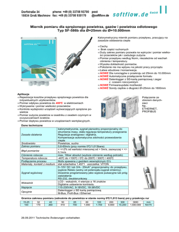 Miernik pomiaru dla sprężonego powietrza, gazów i powietrza odlotowego Typ SF-586b dla Ø=25mm do Ø=10.000mm Kalorymetryczny miernik pomiaru przepływu, pracujący na zasadzie oddawania ciepła • Cechy • Brak części ruchomych • Duży zakres pomiaru pozwala na wykrycie i pomiar wielkości przecieków jak i zadużego zużycia • Pomiar przepływu według Norm, niezależnie od wachań ciśnienia i temperatury. • Wysoka dokładność pomiarów. • Położenie nie ma wpływu na jakość pracy przyrządu • Łatwa wbudowa i konserwacja. • NOWE Dla rurociągów o przekroju od 25mm do 10.000mm • NOWE Automatyczne przełączenie formatu • NOWE Datenlogger z SD-kartą pamięciową i zegar z czasem rzeczywistym • NOWE Firmwareupdate możliwość • NOWE Sondy ciężkie o długości Ø=25mm do 1600mm Aplikacje • Rejestracja kosztów przepływu sprężonego powietrza dla indywidualnych użytkowników. • Pomiar odpływu powietrza do 400°C w elektrowniach • Wykrywanie i pomiar wielkości przecieków • Kontrola wydajności urządzeń wytwarzających sprężone powietrze • Pomiar zużycia powietrza w osadniku z osadem czynnym w oczyszczalniach ścieków. • Pomiar dopływu powietrza w urządzeniach wentylacyjnych. Połączenie ze zbiorem danychsieci Np.. ETHERNET, PROFIBUS Dane techniczne Zasada działania Srodowisko Zakres pomiaru Błąd pomiarów Ciśnienie robocze Temperatura robocza Podłączenie procesu Materiały, kontakt z medium Sygnał wyjściowy Wskaźnik Napięcie Opcyjnie kalorymetrycznie, sygnał pierwotny proporcjonalny do strumienia masy, stała regulacja temperatury przegrzania Regulacja analogowa i digitalna, Kompensacja automatyczna zdolności przewodzenia ciepła Powietrze, sucho 0,6-60m/s (przy normie 0°C/1,013bara) < +/-2% od wartości mierzonej od > 5m/s, zazwyczaj < +/0,1m/s max. 16bar absolut (wyższe ciśnienie według potrzeb) -40°C do +100°C / 0°C do 200°C / 300°C / 400°C Mufa spawana z gwintem wewnętrznym G½ stal szlachetna 1.4571 uszczelka: VITON 0–10V DC lub 0/4– 20mA* proporcjonalny do przepływu, wyjście Relais (wolny od potencjału-sygnał zmienny). Dowolnie programowany jako wyjście pulsacyjne lub próg zadziałania RS-232, dwukierunkowy LCD - wskażnik, 4 wiersze a 16 znaków Digitalne ustawienie kontrastu 115-230VAC, 9-18VDC, 18-36VDC Datenlogger z SD kartą pamięciową M-Bus, Profi-Bus i Ethernet Granice zakresu pomiaru (odnośnie do powietrza w stanie normy 0°C/1,013 bara) prz y przekroju rur 15-25 100 32 170 40 260 50 410 65 700 26.09.2011 Technische Änderungen vorbehalten 80 1.000 100 1.700 200 6.800 300 15.200 3000 1.500.000 mm Nm³/h
