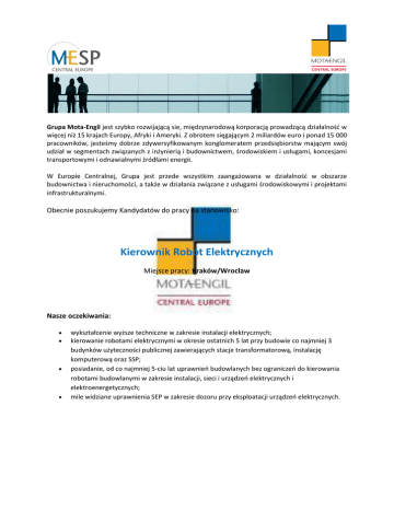 Grupa Mota-Engil jest szybko rozwijającą sie, międzynarodową korporacją prowadzącą działalnośd w więcej niż 15 krajach Europy, Afryki i Ameryki. Z obrotem sięgającym 2 miliardów euro i ponad 15 000 pracowników, jesteśmy dobrze zdywersyfikowanym konglomeratem przedsiębiorstw mającym swój udział w segmentach związanych z inżynierią i budownictwem, środowiskiem i usługami, koncesjami transportowymi i odnawialnymi źródłami energii. W Europie Centralnej, Grupa jest przede wszystkim zaangażowana w działalnośd w obszarze budownictwa i nieruchomości, a także w działania związane z usługami środowiskowymi i projektami infrastrukturalnymi. Obecnie poszukujemy Kandydatów do pracy na stanowisko: Kierownik Robót Elektrycznych Miejsce pracy: Kraków/Wrocław Nasze oczekiwania: wykształcenie wyższe techniczne w zakresie instalacji elektrycznych; kierowanie robotami elektrycznymi w okresie ostatnich 5 lat przy budowie co najmniej 3 budynków użyteczności publicznej zawierających stacje transformatorową, instalację komputerową oraz SSP; posiadanie, od co najmniej 5-ciu lat uprawnieo budowlanych bez ograniczeo do kierowania robotami budowlanymi w zakresie instalacji, sieci i urządzeo elektrycznych i elektroenergetycznych; mile widziane uprawnienia SEP w zakresie dozoru przy eksploatacji urządzeo elektrycznych. Zakres odpowiedzialności: w zakresie produkcji: nadzór nad robotami budowlanymi, analizowanie dokumentacji technicznej, kontakt z podwykonawcami, kontrola jakości prac oraz materiałów, kontrola harmonogramu prac, rozwiązywanie problemów technicznych i logistycznych na budowie; w zakresie procesu pozyskiwania kontraktów: wsparcie działu handlowego w analizie zapytao ofertowych, sprawdzanie ofert dostarczonych przez podwykonawców, udział w wyborze podwykonawców, analiza dokumentacji technicznej i pomoc w wycenie robót. Oferujemy: możliwośd pracy w dynamicznie działającej firmie; atrakcyjne wynagrodzenie adekwatne do posiadanego doświadczenia zawodowego oraz pakiet świadczeo socjalnych; możliwośd rozwoju zawodowego poprzez szkolenia i udział w ciekawych projektach. Osoby zainteresowane prosimy o przesyłanie CV zawierające klauzulę „Wyrażam zgodę na przetwarzanie moich danych osobowych zawartych w mojej ofercie pracy dla potrzeb procesu rekrutacji, zgodnie z Ustawą z dnia 29.08.1997 roku o ochronie danych osobowych, Dz. U. Nr 133, poz. 883” klikając: FORMULARZ Zastrzegamy sobie prawo skontaktowania się tylko z wybranymi osobami