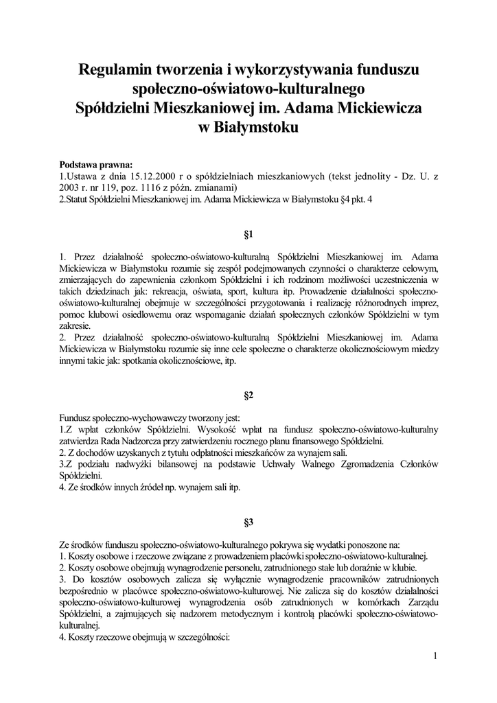 Regulamin tworzenia i wykorzystywania funduszu społeczno-oświatowo-kulturalnego Spółdzielni Mieszkaniowej im. Adama Mickiewicza w Białymstoku Podstawa prawna: 1.Ustawa z dnia 15.12.2000 r o spółdzielniach mieszkaniowych (tekst jednolity - Dz. U. z 2003 r. nr 119, poz. 1116 z późn. zmianami) 2.Statut Spółdzielni Mieszkaniowej im. Adama Mickiewicza w Białymstoku §4 pkt. 4 §1 1. Przez działalność społeczno-oświatowo-kulturalną Spółdzielni Mieszkaniowej im. Adama Mickiewicza w Białymstoku rozumie się zespół podejmowanych czynności o charakterze celowym, zmierzających do zapewnienia członkom Spółdzielni i ich rodzinom możliwości uczestniczenia w takich dziedzinach jak: rekreacja, oświata, sport, kultura itp. Prowadzenie działalności społecznooświatowo-kulturalnej obejmuje w szczególności przygotowania i realizację różnorodnych imprez, pomoc klubowi osiedlowemu oraz wspomaganie działań społecznych członków Spółdzielni w tym zakresie. 2. Przez działalność społeczno-oświatowo-kulturalną Spółdzielni Mieszkaniowej im. Adama Mickiewicza w Białymstoku rozumie się inne cele społeczne o charakterze okolicznościowym miedzy innymi takie jak: spotkania okolicznościowe, itp. §2 Fundusz społeczno-wychowawczy tworzony jest: 1.Z wpłat członków Spółdzielni. Wysokość wpłat na fundusz społeczno-oświatowo-kulturalny zatwierdza Rada Nadzorcza przy zatwierdzeniu rocznego planu finansowego Spółdzielni. 2. Z dochodów uzyskanych z tytułu odpłatności mieszkańców za wynajem sali. 3.Z podziału nadwyżki bilansowej na podstawie Uchwały Walnego Zgromadzenia Członków Spółdzielni. 4. Ze środków innych źródeł np. wynajem sali itp. §3 Ze środków funduszu społeczno-oświatowo-kulturalnego pokrywa się wydatki ponoszone na: 1. Koszty osobowe i rzeczowe związane z prowadzeniem placówki społeczno-oświatowo-kulturalnej. 2. Koszty osobowe obejmują wynagrodzenie personelu, zatrudnionego stałe lub doraźnie w klubie. 3. Do kosztów osobowych zalicza się wyłącznie wynagrodzenie pracowników zatrudnionych bezpośrednio w placówce społeczno-oświatowo-kulturowej. Nie zalicza się do kosztów działalności społeczno-oświatowo-kulturowej wynagrodzenia osób zatrudnionych w komórkach Zarządu Spółdzielni, a zajmujących się nadzorem metodycznym i kontrolą placówki społeczno-oświatowokulturalnej. 4. Koszty rzeczowe obejmują w szczególności: 1 -organizowanie działalności społeczno-kulturowo-oświatowej na rzecz mieszkańców tj. członków Spółdzielni i ich rodzin. -działalność wychowawczą środowiska-zespoły zainteresowań, kursy, imprezy sportowo-turystyczne. -honoraria za odczyty, spotkania, pokazy. -utrzymanie zespołów artystycznych o charakterze środowiskowym. -nagrody rzeczowe dla wyróżniającego się aktywu spółdzielczego za działalność społeczno-oświatowokulturalną. -nagrody za udział w konkursach i akcjach organizowanych przez Spółdzielnię w ramach działalności społeczno-oświatowo-kulturalnej. -zakup literatury fachowej i czasopism na potrzeby placówek społeczno-oświatowo-kulturalnych. -fundusz na prowadzenie różnorodnych form pracy społeczno-oświatowo-kulturalnych, na rzecz potrzebujących dzieci i dorosłych mieszkańców Osiedla. -nakłady związane z doposażeniem placówki społeczno-oświatowo-kulturalnej w niezbędny sprzęt i urządzenia. -zakup przedmiotów nietrwałych oraz materiałów do zajęć w kołach specjalistycznych i zespołach zainteresowań. -z funduszu społeczno-oświatowo-kulturalnego finansuje się również imprezy społeczno-kulturalnooświatowe, organizowane we własnym zakresie jak i wspólnie z innymi organizacjami i instytucjami (TPD, TKKF itp.) 5.Z funduszu społeczno-oświatowo-kulturalnego pokrywa się: -opłaty świadczeń czynszowych (co, wody i kanalizacji, podatek) za lokale zajmowane przez placówki społeczno-oświatowo-kulturalne, za wyjątkiem lokali znajdujących się z pomieszczeniach piwnicznych i strychach. §4 1. Środki finansowe FSOK gromadzone są na koncie bieżącym. 2. Nadzór i kontrolę nad sposobem wykorzystania funduszu sprawuje Zarząd. 3. GK prowadzi odrębnie analityczną ewidencję tworzenia i wykorzystywania FSOK. §5 1. Z wykorzystania FSOK Zarząd składa rocznie sprawozdania na Walne Zgromadzenie. §6 1. Niniejszy regulamin został uchwalony dnia 27.11.2012r., uchwałą nr 70/11/12 Rady Nadzorczej SM im. Adama Mickiewicza w Białymstoku. §7 Z dniem uchwalenia traci moc „Regulamin tworzenia i gospodarowania funduszem społecznowychowawczym” uchwalony przez Radę nadzorczą uchwałą nr 17/92 z dnia 27.02.1992r. Sekretarz Rady Nadzorczej Przewodniczący Rady Nadzorczej Irena Kurkowska Zbigniew Orszewski ………………………………. ……………………………….. 2