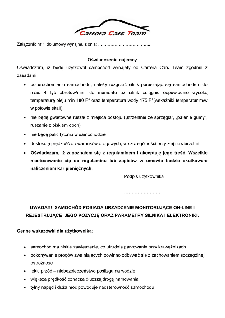 Załącznik nr 1 do umowy wynajmu z dnia: ……………………………….. Oświadczenie najemcy Oświadczam, iż będę użytkował samochód wynajęty od Carrera Cars Team zgodnie z zasadami: • po uruchomieniu samochodu, należy rozgrzać silnik poruszając się samochodem do max. 4 tyś obrotów/min, do momentu aż silnik osiągnie odpowiednio wysoką temperaturę oleju min 180 F° oraz temperatura wody 175 F°(wskaźniki temperatur m/w w połowie skali) • nie będę gwałtowne ruszał z miejsca postoju („strzelanie ze sprzęgła”, „palenie gumy”, ruszanie z piskiem opon) • nie będę palić tytoniu w samochodzie • dostosuję prędkość do warunków drogowych, w szczególności przy złej nawierzchni. • Oświadczam, iż zapoznałem się z regulaminem i akceptuję jego treść. Wszelkie niestosowanie się do regulaminu lub zapisów w umowie będzie skutkowało naliczeniem kar pieniężnych. Podpis użytkownika ……………………. UWAGA!!! SAMOCHÓD POSIADA URZĄDZENIE MONITORUJĄCE ON-LINE I REJESTRUJĄCE JEGO POZYCJĘ ORAZ PARAMETRY SILNIKA I ELEKTRONIKI. Cenne wskazówki dla użytkownika: • samochód ma niskie zawieszenie, co utrudnia parkowanie przy krawężnikach • pokonywanie progów zwalniających powinno odbywać się z zachowaniem szczególnej ostrożności • lekki przód – niebezpieczeństwo poślizgu na wodzie • większa prędkość oznacza dłuższą drogę hamowania • tylny napęd i duża moc powoduje nadsterowność samochodu