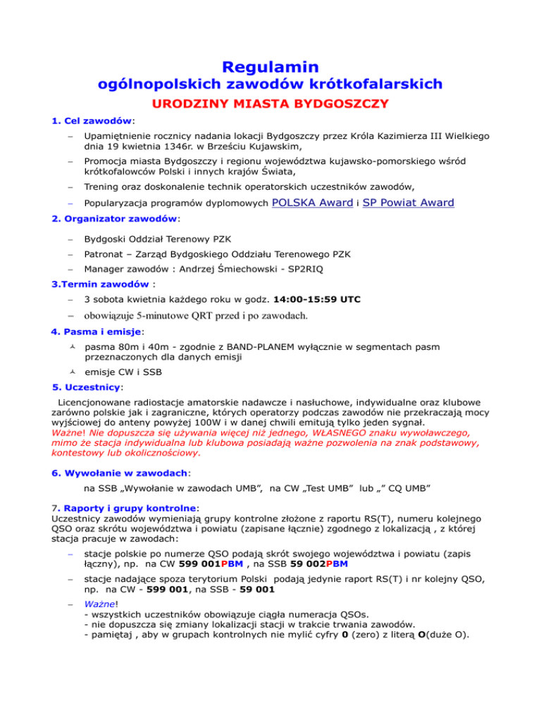 Regulamin ogólnopolskich zawodów krótkofalarskich URODZINY MIASTA BYDGOSZCZY 1. Cel zawodów: Upamiętnienie rocznicy nadania lokacji Bydgoszczy przez Króla Kazimierza III Wielkiego dnia 19 kwietnia 1346r. w Brześciu Kujawskim, Promocja miasta Bydgoszczy i regionu województwa kujawsko-pomorskiego wśród krótkofalowców Polski i innych krajów Świata, Trening oraz doskonalenie technik operatorskich uczestników zawodów, Popularyzacja programów dyplomowych POLSKA Award i SP Powiat Award 2. Organizator zawodów: Bydgoski Oddział Terenowy PZK Patronat – Zarząd Bydgoskiego Oddziału Terenowego PZK Manager zawodów : Andrzej Śmiechowski - SP2RIQ 3.Termin zawodów : 3 sobota kwietnia każdego roku w godz. 14:00-15:59 UTC obowiązuje 5-minutowe QRT przed i po zawodach. 4. Pasma i emisje: pasma 80m i 40m - zgodnie z BAND-PLANEM wyłącznie w segmentach pasm przeznaczonych dla danych emisji emisje CW i SSB 5. Uczestnicy: Licencjonowane radiostacje amatorskie nadawcze i nasłuchowe, indywidualne oraz klubowe zarówno polskie jak i zagraniczne, których operatorzy podczas zawodów nie przekraczają mocy wyjściowej do anteny powyżej 100W i w danej chwili emitują tylko jeden sygnał. Ważne! Nie dopuszcza się używania więcej niż jednego, WŁASNEGO znaku wywoławczego, mimo że stacja indywidualna lub klubowa posiadają ważne pozwolenia na znak podstawowy, kontestowy lub okolicznościowy. 6. Wywołanie w zawodach: na SSB „Wywołanie w zawodach UMB”, na CW „Test UMB” lub „” CQ UMB” 7. Raporty i grupy kontrolne: Uczestnicy zawodów wymieniają grupy kontrolne złożone z raportu RS(T), numeru kolejnego QSO oraz skrótu województwa i powiatu (zapisane łącznie) zgodnego z lokalizacją , z której stacja pracuje w zawodach: stacje polskie po numerze QSO podają skrót swojego województwa i powiatu (zapis łączny), np. na CW 599 001PBM , na SSB 59 002PBM stacje nadające spoza terytorium Polski podają jedynie raport RS(T) i nr kolejny QSO, np. na CW - 599 001, na SSB - 59 001 Ważne! - wszystkich uczestników obowiązuje ciągła numeracja QSOs. - nie dopuszcza się zmiany lokalizacji stacji w trakcie trwania zawodów. - pamiętaj , aby w grupach kontrolnych nie mylić cyfry 0 (zero) z literą O(duże O). 8. Punktacja: - za bezbłędne łączności ze stacjami z województwa kujawsko-pomorskiego (P) 2 pkt. na SSB, 4 pkt. na CW. Wykaz powiatów województwa kujawsko-pomorskiego (P): Powiat AK BC BM BY CL GM GR GU IN LP MO NA RJ RY SJ SW TM TO TU WK WL WO ZN Nazwa aleksandrowski - Aleksandrów Kuj. brodnicki - Brodnica bydgoski - Bydgoszcz [grodzki] bydgoski - Bydgoszcz chełmiński - Chełmno grudziądzki - Grudziądz [grodzki] grudziądzki - Grudziądz golubsko-dobrzyński - Golub Dobrzyń inowrocławski - Inowrocław lipnowski - Lipno mogileński - Mogilno nakielski - Nakło radziejowski - Radziejów rypiński - Rypin sępoleński - Sępólno Kraj. świecki - Świecie toruński - Toruń [grodzki] toruński - Toruń tucholski - Tuchola włocławski - Włocławek [grodzki] włocławski - Włocławek wąbrzeski - Wąbrzeźno żniński - Żnin - z pozostałymi stacjami 1 pkt. na SSB, 2 pkt. na CW. Wynik końcowy stanowi suma punktów za bezbłędne łączności. Mnożnika nie stosuje się. 9. Kategorie (WSZYSTKIE KATEGORIE - MIX): A – Stacje indywidualne z woj. kujawsko-pomorskiego B – Stacje klubowe z woj. kujawsko-pomorskiego C – Stacje nasłuchowe z woj. kujawsko-pomorskiego indywidualne i klubowe D – Pozostałe polskie stacje indywidualne E – Pozostałe polskie stacje klubowe F – Polskie stacje nasłuchowe indywidualne i klubowe G – Zagraniczne stacje indywidualne i klubowe. H – Zagraniczne stacje nasłuchowe indywidualne i klubowe CHECKLOG - log tylko do kontroli (log nieklasyfikowany) Uczestnik zawodów może być sklasyfikowany tylko w jednej kategorii Stacje członków komisji sędziowskiej nie będą klasyfikowane. Linia „CONTEST” nagłówka pliku cabrillo powinna być jako druga od góry i zawierać nazwę: URODZINY MIASTA BYDGOSZCZY Logi z ilością łączności 10 i mniej będą traktowane jako logi tylko do kontroli i zostaną automatycznie przeniesione do kategorii CHECKLOG Stacje SWL mogą przeprowadzać nasłuch jednej stacji maksymalnie 4 razy (po 2 emisje na pasmo: na 80m na CW i SSB oraz na 40m na CW i SSB) 10. Nie zalicza się łączności w przypadku: nawiązanie łączności poza czasem trwania zawodów, powtórzenia łączności na tym samym paśmie i tą samą emisją, niezgodności w obu logach danych o QSO lub rozbieżności czasu ponad 5 minut, nastąpiła zmiana lokalizacji w czasie trwania zawodów, użycia w zawodach więcej niż jednego, WŁASNEGO znaku wywoławczego i do komisji dotarły dwa logi, jeden na znak podstawowy oraz drugi na znak kontestowy lub okolicznościowy, QSO pomiędzy stacjami zainstalowanymi w tym samym miejscu lub z tym samym operatorem (QSO „SAM Z SOBĄ”), braku logu korespondenta, nawiązania łączności typu CROSS-BAND i/lub CROSS-MODE Uwaga! Jakakolwiek niezgodność w logach stacji powoduje niezaliczenie punktów dla każdej z nich. 11. Nagrody : - za zajęcie I miejsca w poszczególnych kategoriach Puchar. - za zajęcie miejsc od I do III w poszczególnych grupach dyplomy. - wszystkim uczestnikom zawodów , którzy nadeślą log w wymaganym terminie, przyznane będą do pobrania indywidualne elektroniczne (w formacie PDF) Certyfikaty Udziału. Uwaga! Jeżeli na I miejscu jest więcej niż jeden znak z taką samą ilością punktów, to zwycięzcą w tej kategorii jest ta stacja, która ma mniej niezaliczonych QSOs lub wcześniej przysłała swój log i to ona otrzymuje nagrodę rzeczową. Natomiast pozostałe stacje otrzymują dyplomy. 12. Dziennik zawodów (bez konieczności obliczania punktów): Do logowania w zawodach zalecamy program DQR_Log autorstwa Marka SP7DQR, który można pobrać z: http://sp7dqr.pl/download/download.php?id=91 Log sporządzany jest w czasie UTC - plik w form
