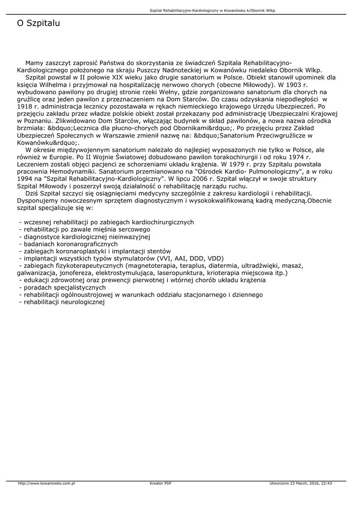 Szpital Rehabilitacyjno-Kardiologiczny w Kowanówku k/Obornik Wlkp. O Szpitalu Mamy zaszczyt zaprosić Państwa do skorzystania ze świadczeń Szpitala RehabilitacyjnoKardiologicznego położonego na skraju Puszczy Nadnoteckiej w Kowanówku niedaleko Obornik Wlkp. Szpital powstał w II połowie XIX wieku jako drugie sanatorium w Polsce. Obiekt stanowił upominek dla księcia Wilhelma i przyjmował na hospitalizację nerwowo chorych (obecne Miłowody). W 1903 r. wybudowano pawilony po drugiej stronie rzeki Wełny, gdzie zorganizowano sanatorium dla chorych na gruźlicę oraz jeden pawilon z przeznaczeniem na Dom Starców. Do czasu odzyskania niepodległości w 1918 r. administracja lecznicy pozostawała w rękach niemieckiego krajowego Urzędu Ubezpieczeń. Po przejęciu zakładu przez władze polskie obiekt został przekazany pod administrację Ubezpieczalni Krajowej w Poznaniu. Zlikwidowano Dom Starców, włączając budynek w skład pawilonów, a nowa nazwa ośrodka brzmiała: „Lecznica dla płucno-chorych pod Obornikami”. Po przejęciu przez Zakład Ubezpieczeń Społecznych w Warszawie zmienił nazwę na: „Sanatorium Przeciwgruźlicze w Kowanówku”. W okresie międzywojennym sanatorium należało do najlepiej wyposażonych nie tylko w Polsce, ale również w Europie. Po II Wojnie Światowej dobudowano pawilon torakochirurgii i od roku 1974 r. Leczeniem zostali objęci pacjenci ze schorzeniami układu krążenia. W 1979 r. przy Szpitalu powstała pracownia Hemodynamiki. Sanatorium przemianowano na "Ośrodek Kardio- Pulmonologiczny", a w roku 1994 na "Szpital Rehabilitacyjno-Kardiologiczny". W lipcu 2006 r. Szpital włączył w swoje struktury Szpital Miłowody i poszerzył swoją działalność o rehabilitację narządu ruchu. Dziś Szpital szczyci się osiągnięciami medycyny szczególnie z zakresu kardiologii i rehabilitacji. Dysponujemy nowoczesnym sprzętem diagnostycznym i wysokokwalifikowaną kadrą medyczną.Obecnie szpital specjalizuje się w: - wczesnej rehabilitacji po zabiegach kardiochirurgicznych - rehabilitacji po zawale mięśnia sercowego - diagnostyce kardiologicznej nieinwazyjnej - badaniach koronarograficznych - zabiegach koronaroplastyki i implantacji stentów - implantacji wszystkich typów stymulatorów (VVI, AAI, DDD, VDD) - zabiegach fizykoterapeutycznych (magnetoterapia, teraplus, diatermia, ultradźwięki, masaż, galwanizacja, jonofereza, elektrostymulująca, laseropunktura, krioterapia miejscowa itp.) - edukacji zdrowotnej oraz prewencji pierwotnej i wtórnej chorób układu krążenia - poradach specjalistycznych - rehabilitacji ogólnoustrojowej w warunkach oddziału stacjonarnego i dziennego - rehabilitacji neurologicznej http://www.kowanowko.com.pl Kreator PDF Utworzono 23 March, 2016, 22:43
