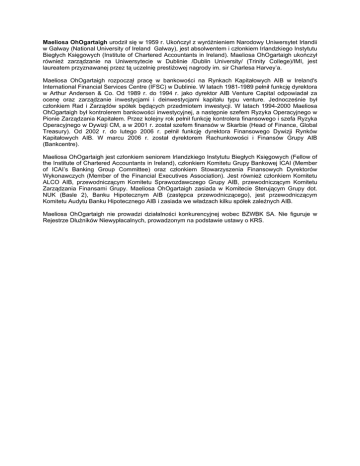 Maeliosa OhOgartaigh urodził się w 1959 r. Ukończył z wyróżnieniem Narodowy Uniwersytet Irlandii w Galway (National University of Ireland Galway), jest absolwentem i członkiem Irlandzkiego Instytutu Biegłych Księgowych (Institute of Chartered Accountants in Ireland). Maeliosa OhOgartaigh ukończył również zarządzanie na Uniwersytecie w Dublinie /Dublin University/ (Trinity College)/IMI, jest laureatem przyznawanej przez tą uczelnię prestiżowej nagrody im. sir Charlesa Harvey’a. Maeliosa OhOgartaigh rozpoczął pracę w bankowości na Rynkach Kapitałowych AIB w Ireland's International Financial Services Centre (IFSC) w Dublinie. W latach 1981-1989 pełnił funkcję dyrektora w Arthur Andersen & Co. Od 1989 r. do 1994 r. jako dyrektor AIB Venture Capital odpowiadał za ocenę oraz zarządzanie inwestycjami i deinwestycjami kapitału typu venture. Jednocześnie był członkiem Rad i Zarządów spółek będących przedmiotem inwestycji. W latach 1994-2000 Maeliosa OhOgartaigh był kontrolerem bankowości inwestycyjnej, a następnie szefem Ryzyka Operacyjnego w Pionie Zarządzania Kapitałem. Przez kolejny rok pełnił funkcję kontrolera finansowego i szefa Ryzyka Operacyjnego w Dywizji CM, a w 2001 r. został szefem finansów w Skarbie (Head of Finance, Global Treasury). Od 2002 r. do lutego 2006 r. pełnił funkcję dyrektora Finansowego Dywizji Rynków Kapitałowych AIB. W marcu 2006 r. został dyrektorem Rachunkowości i Finansów Grupy AIB (Bankcentre). Maeliosa OhOgartaigh jest członkiem seniorem Irlandzkiego Instytutu Biegłych Księgowych (Fellow of the Institute of Chartered Accountants in Ireland), członkiem Komitetu Grupy Bankowej ICAI (Member of ICAI’s Banking Group Committee) oraz członkiem Stowarzyszenia Finansowych Dyrektorów Wykonawczych (Member of the Financial Executives Association). Jest również członkiem Komitetu ALCO AIB, przewodniczącym Komitetu Sprawozdawczego Grupy AIB, przewodniczącym Komitetu Zarządzania Finansami Grupy. Maeliosa OhOgartaigh zasiada w Komitecie Sterującym Grupy dot. NUK (Basle 2), Banku Hipotecznym AIB (zastępca przewodniczącego), jest przewodniczącym Komitetu Audytu Banku Hipotecznego AIB i zasiada we władzach kilku spółek zależnych AIB. Maeliosa OhOgartaigh nie prowadzi działalności konkurencyjnej wobec BZWBK SA. Nie figuruje w Rejestrze Dłużników Niewypłacalnych, prowadzonym na podstawie ustawy o KRS.